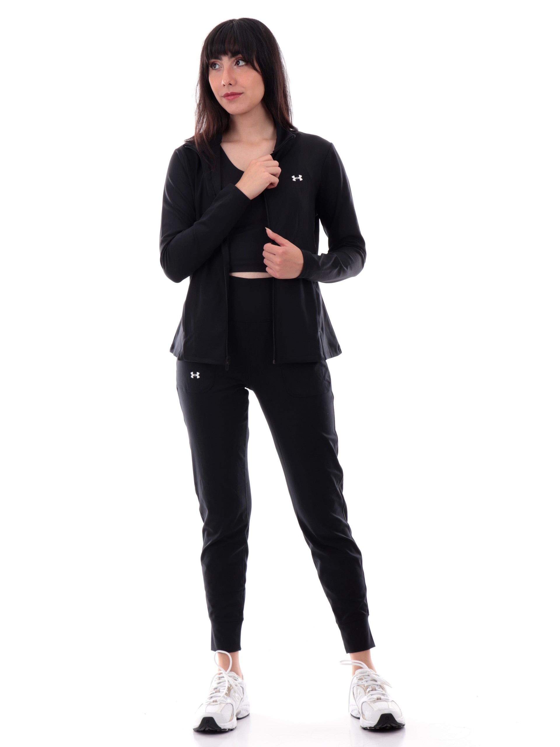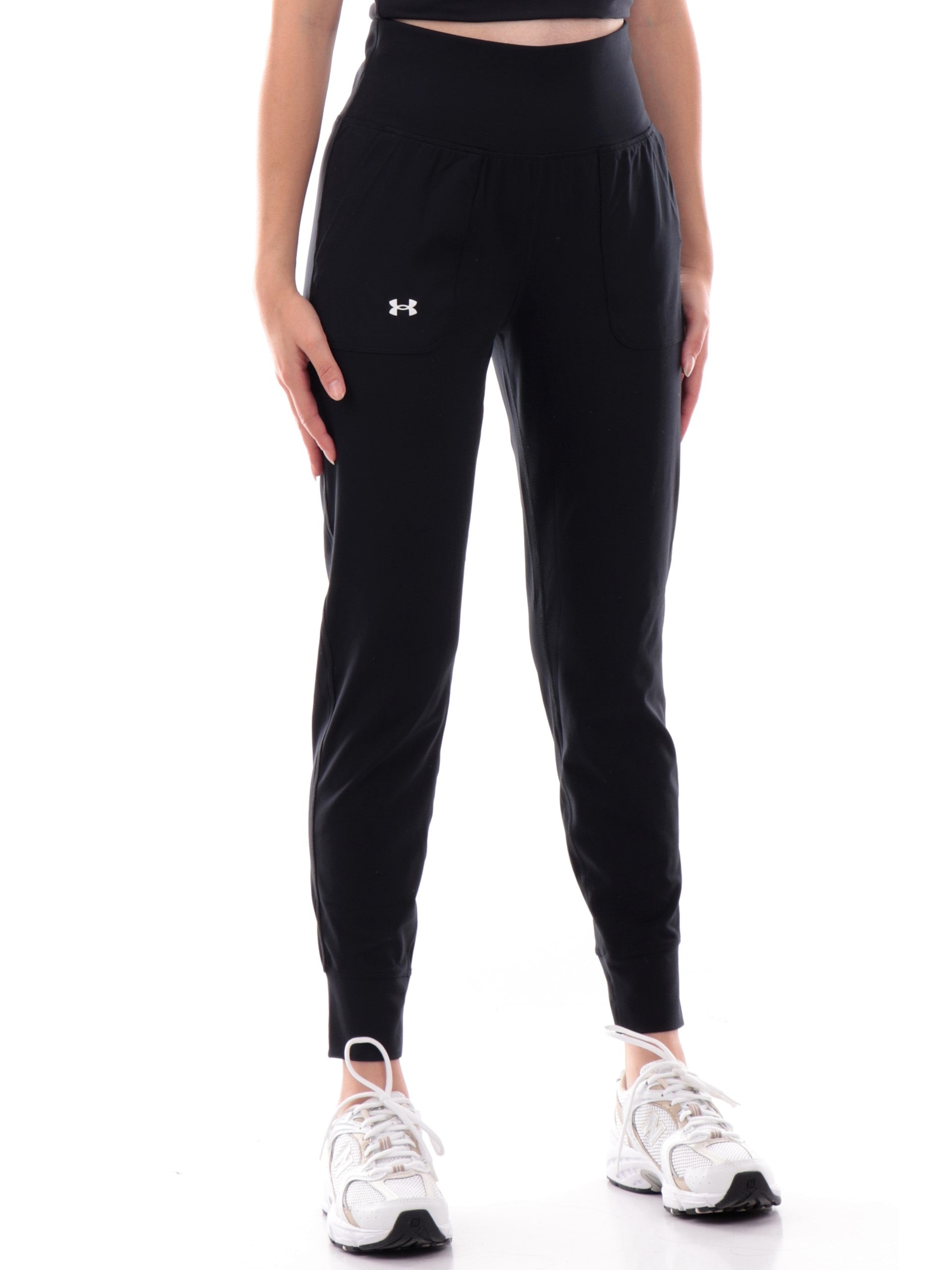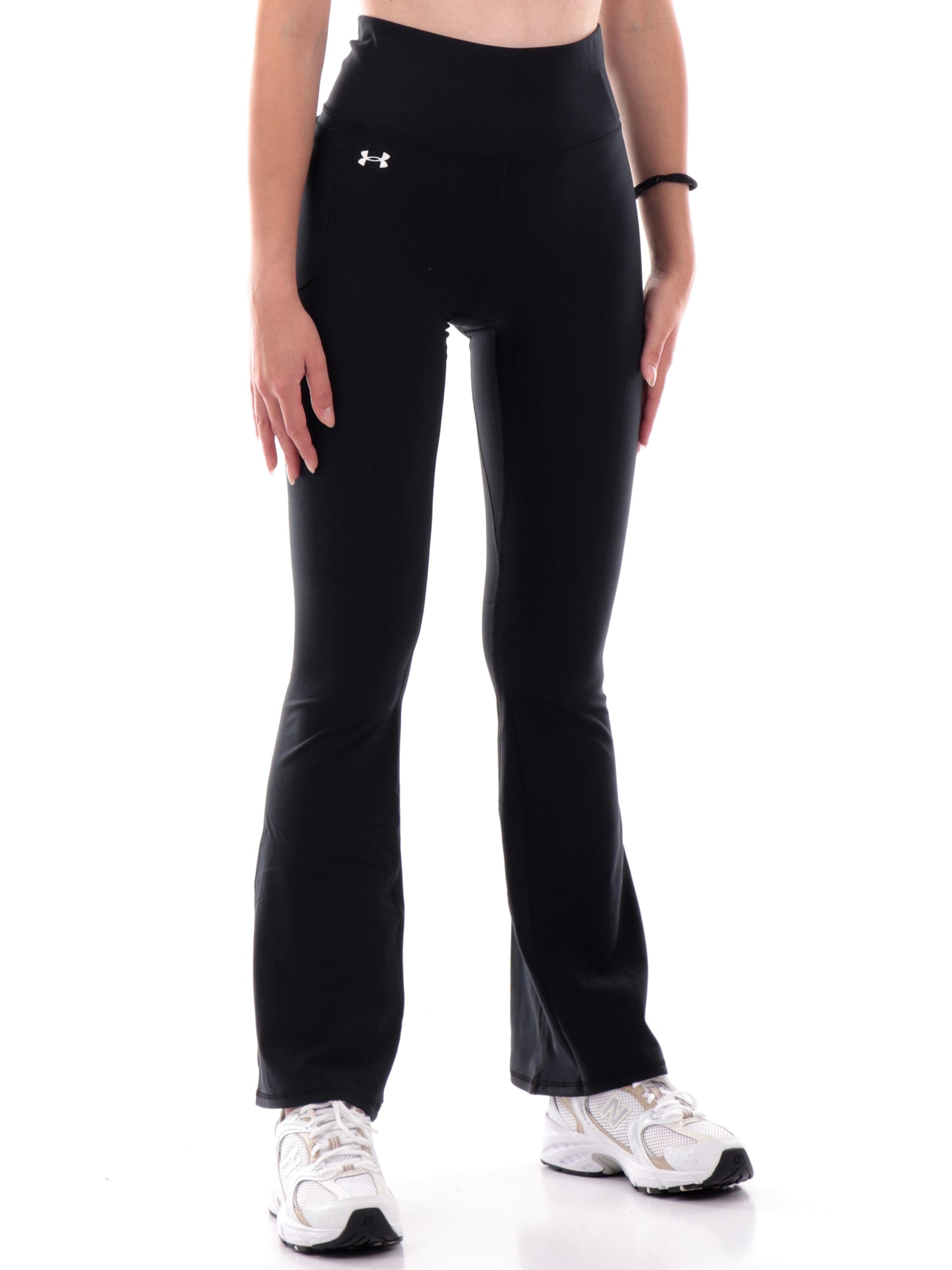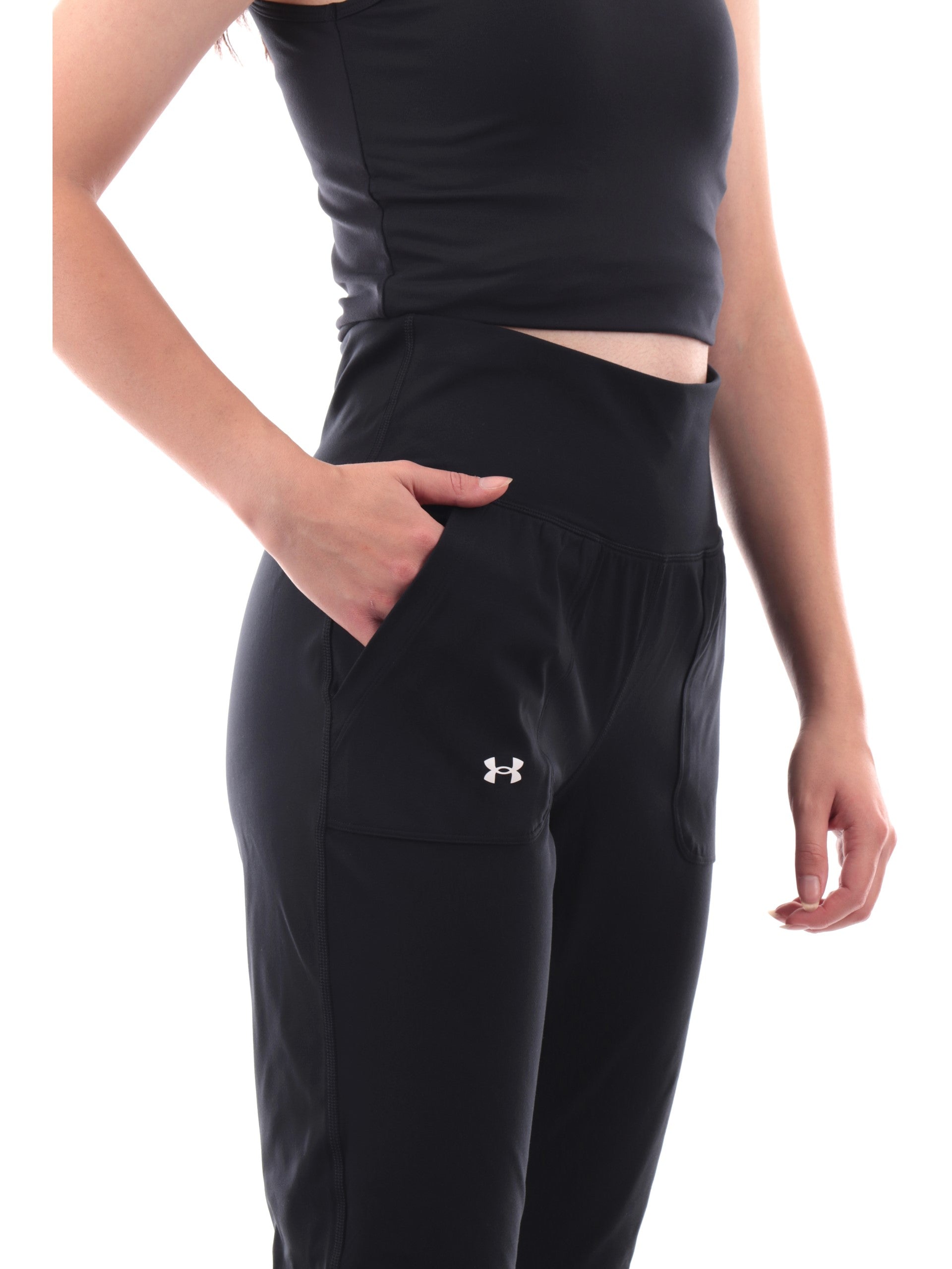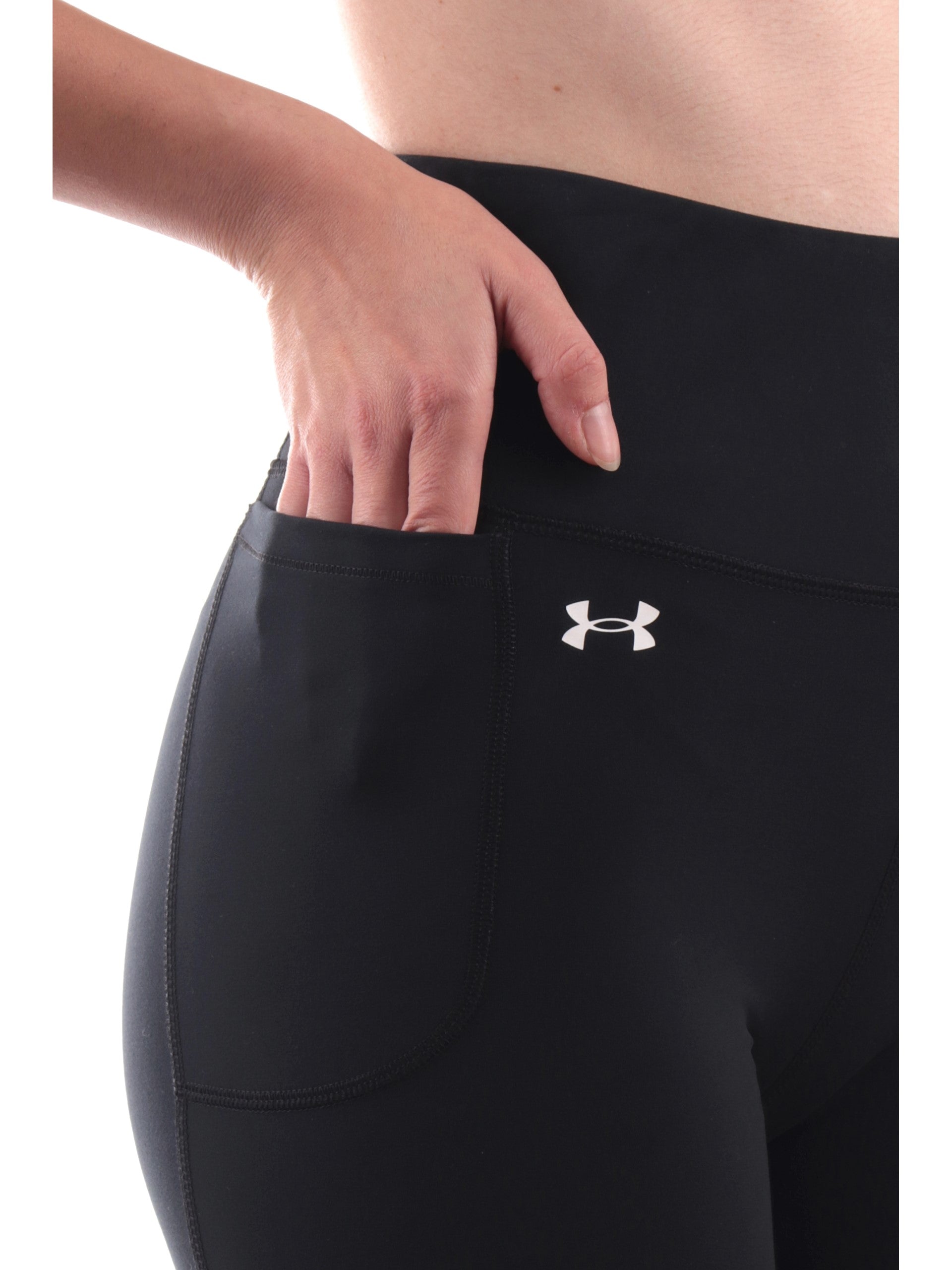Under Armor black solid color women's leggings. These black Under Armor trousers have a single open pocket on the right side, an elastic band on the waist that improves the fit and the logo printed on the right leg.
