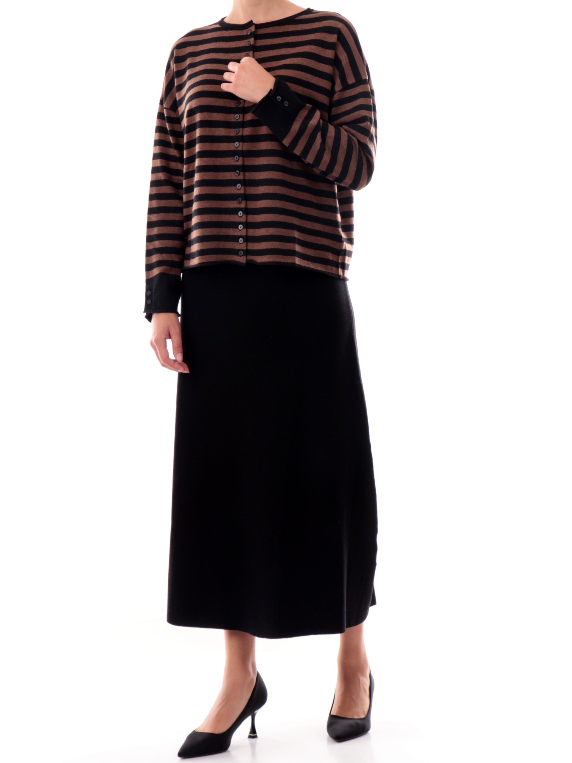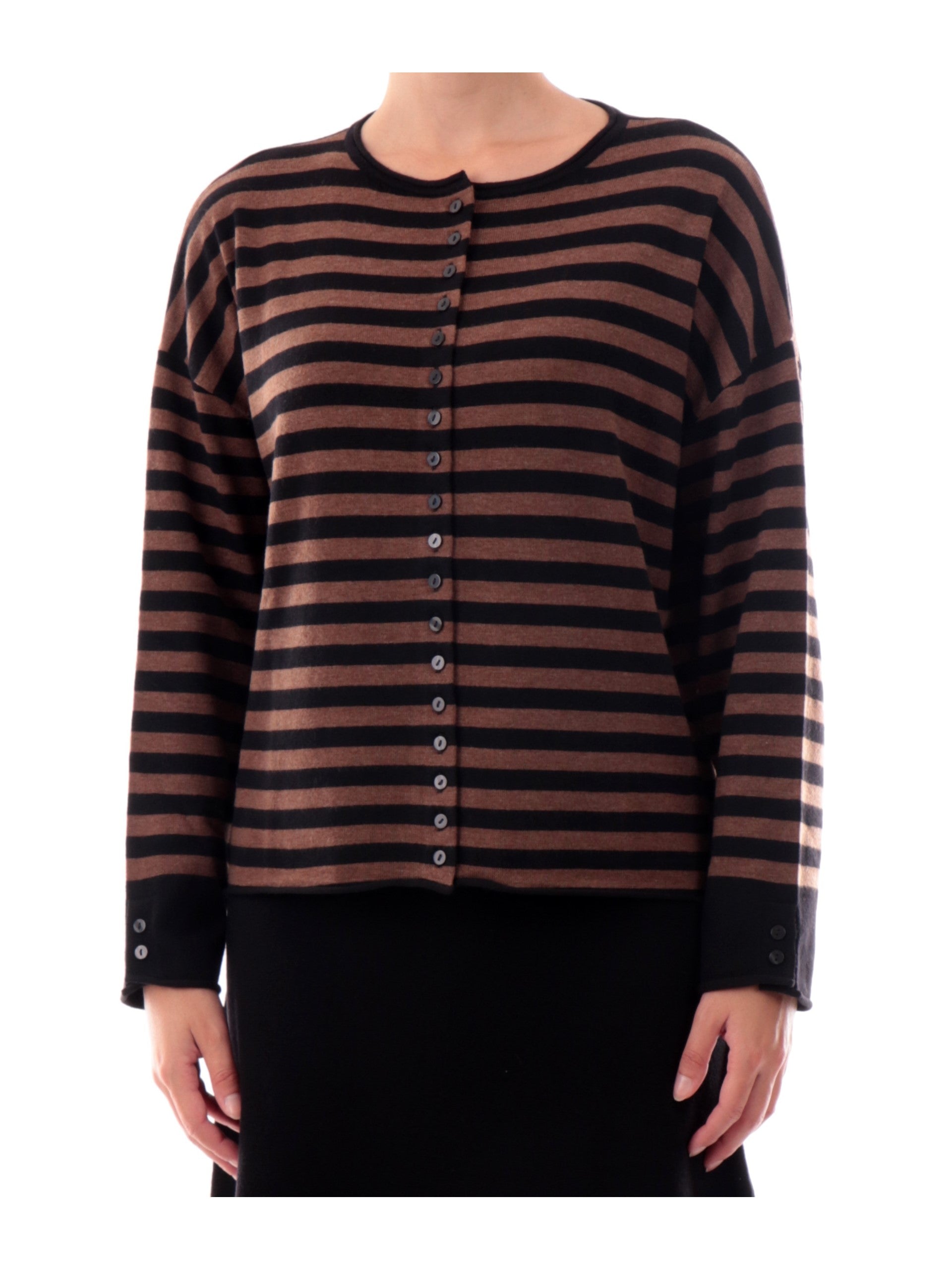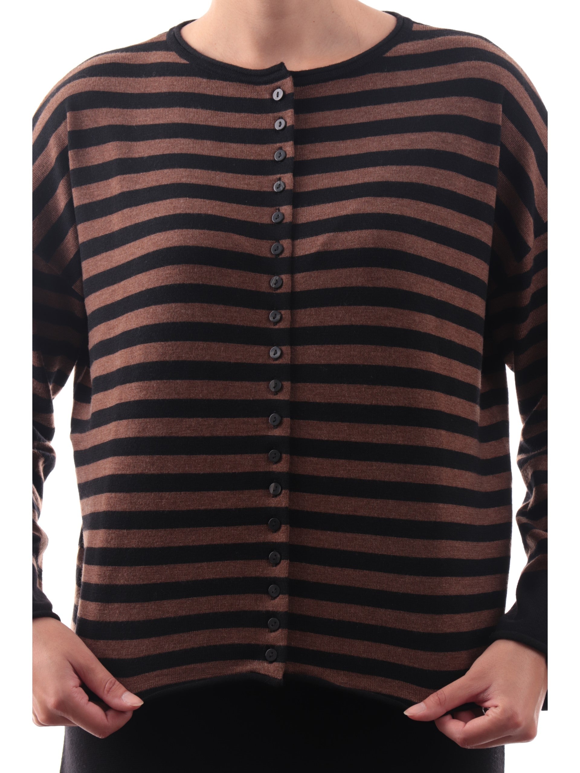 Cardigan Anis marrone a righe da donna colletto alla coreana 255W1265, realizzato in misto lana. Questo maglione donna Anis marrone girocollo ha la fantasia a righe, il colletto alla coreana, la chiusura con bottoni, polsini e fondo elasticizzati.