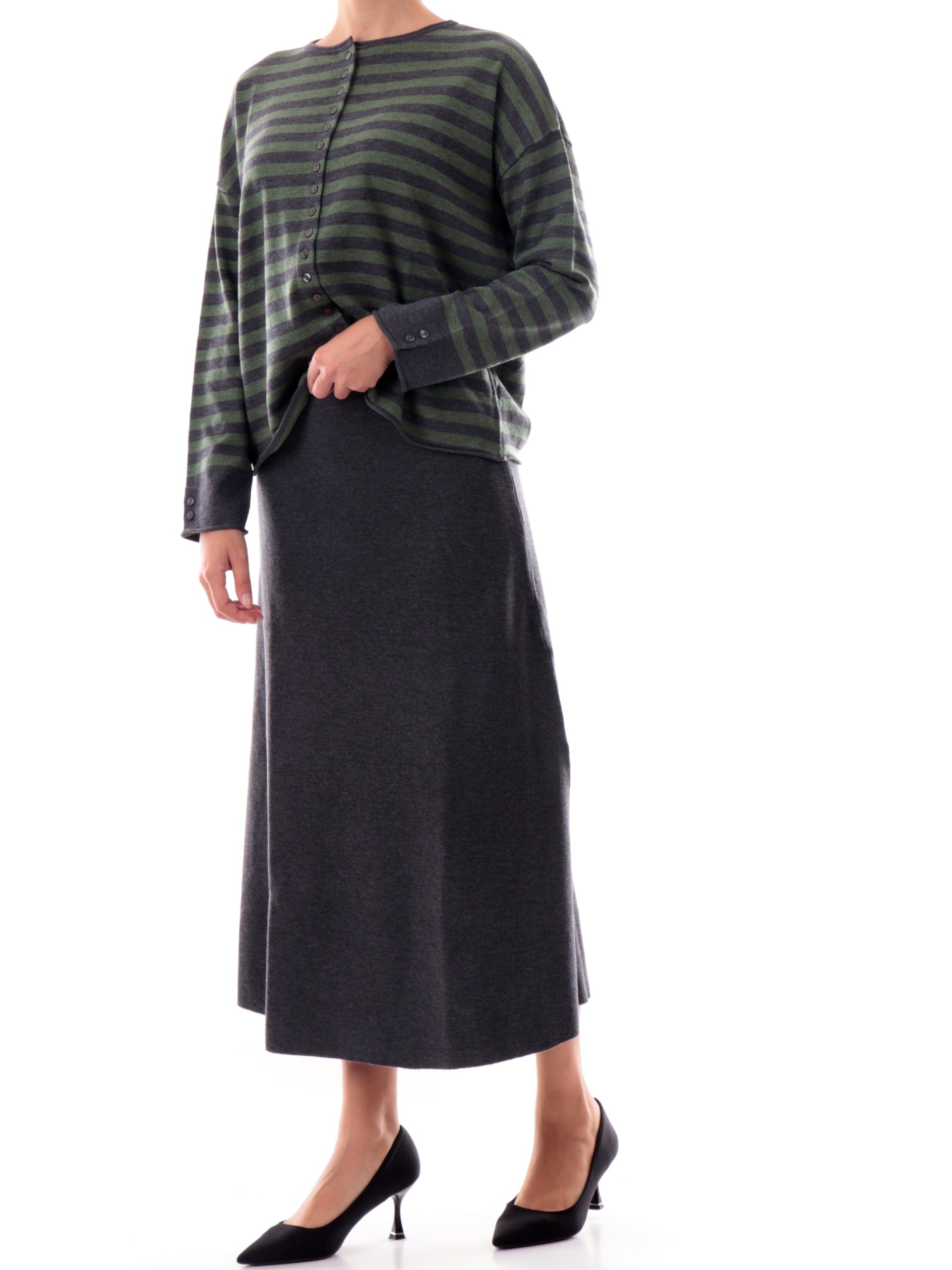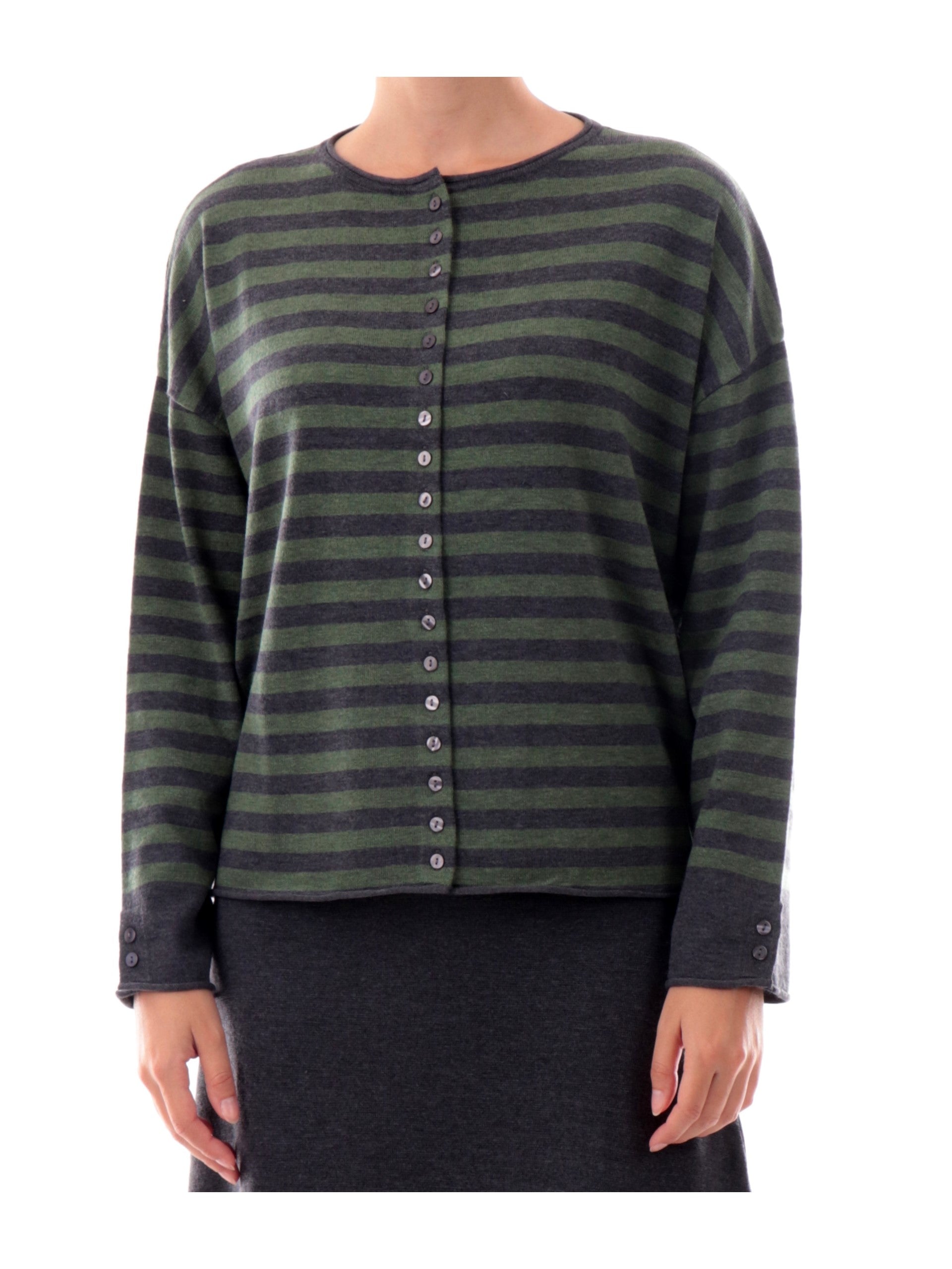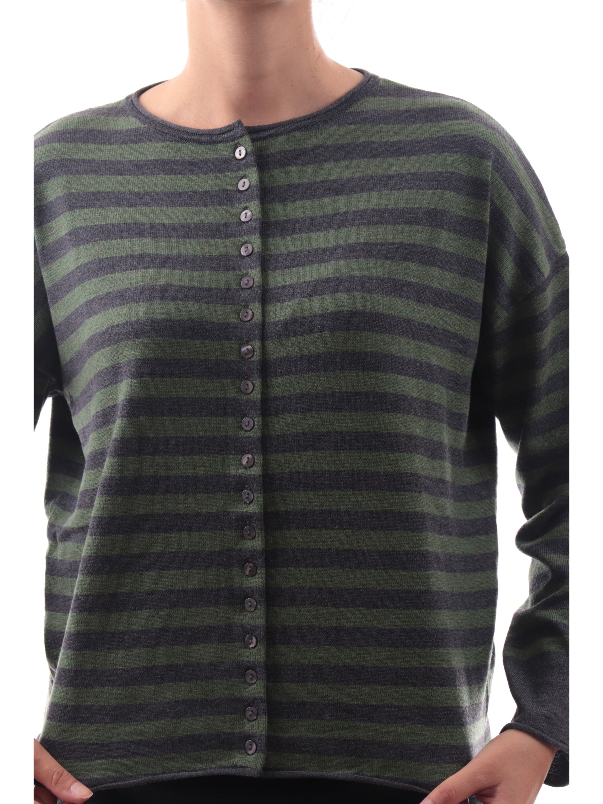 Cardigan Anis verde a righe da donna colletto alla coreana 255W1265, realizzato in misto lana. Questo maglione donna Anis verde girocollo ha la fantasia a righe, il colletto alla coreana, la chiusuracon bottoni, polsini e fondo elasticizzati.