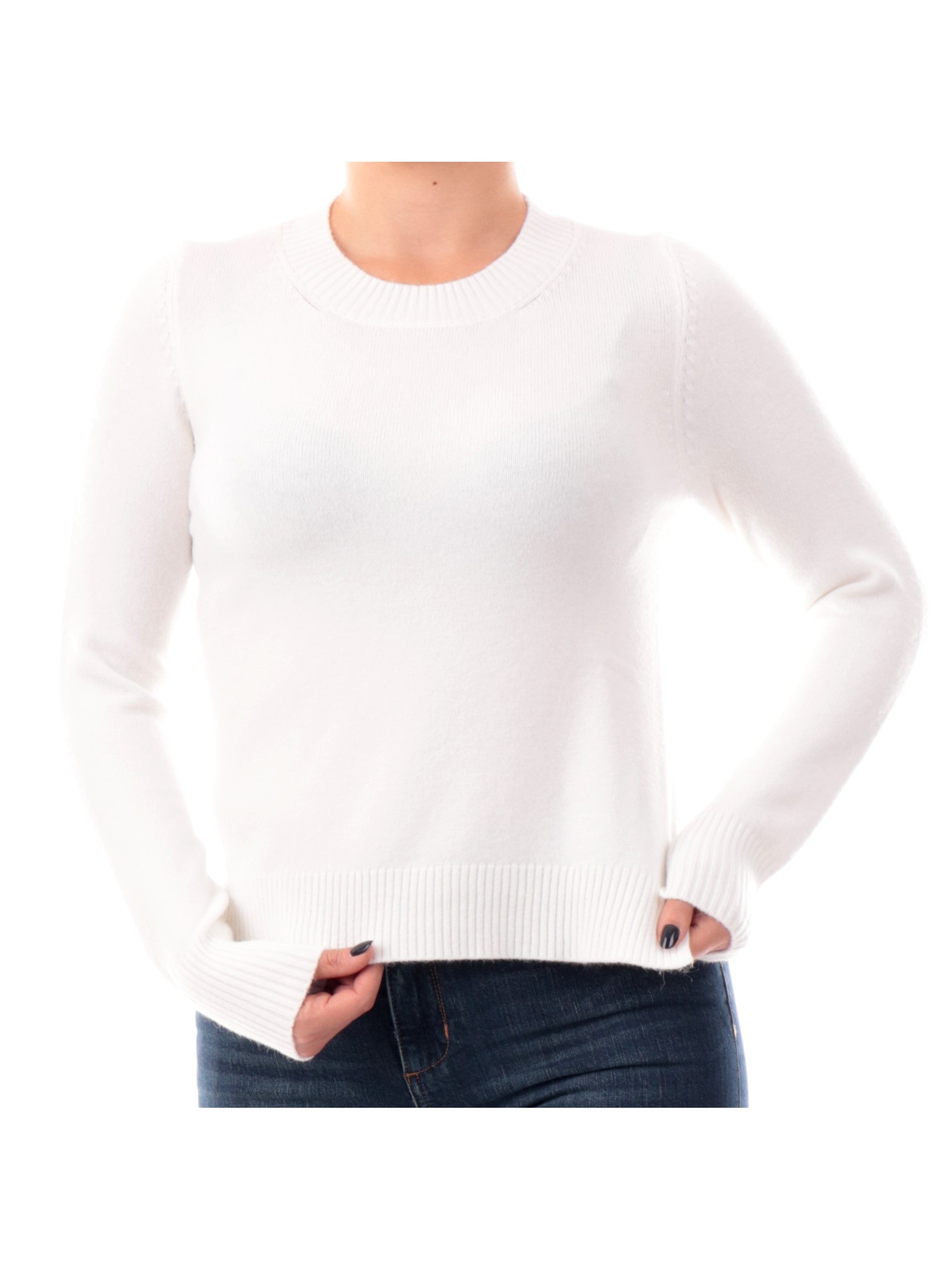 Maglione ANIS bianco da donna a girocollo. Questa maglia Anis è realizzata in soffice caldo tessuto al tatto, caratterizzata da girocollo, polsini e fonodo elasticizzati a costine. Questo maglione è perfetto sopra un jeans