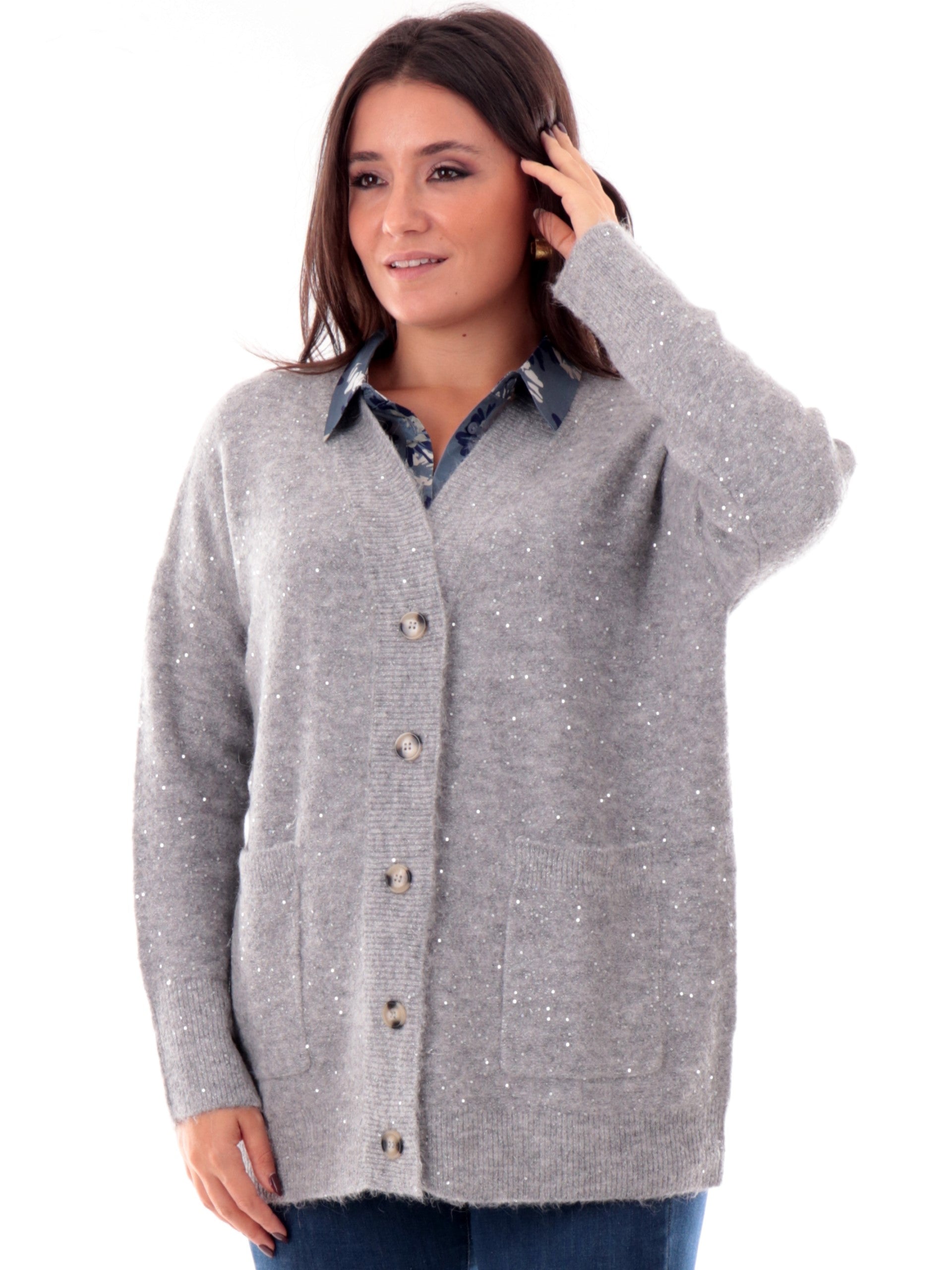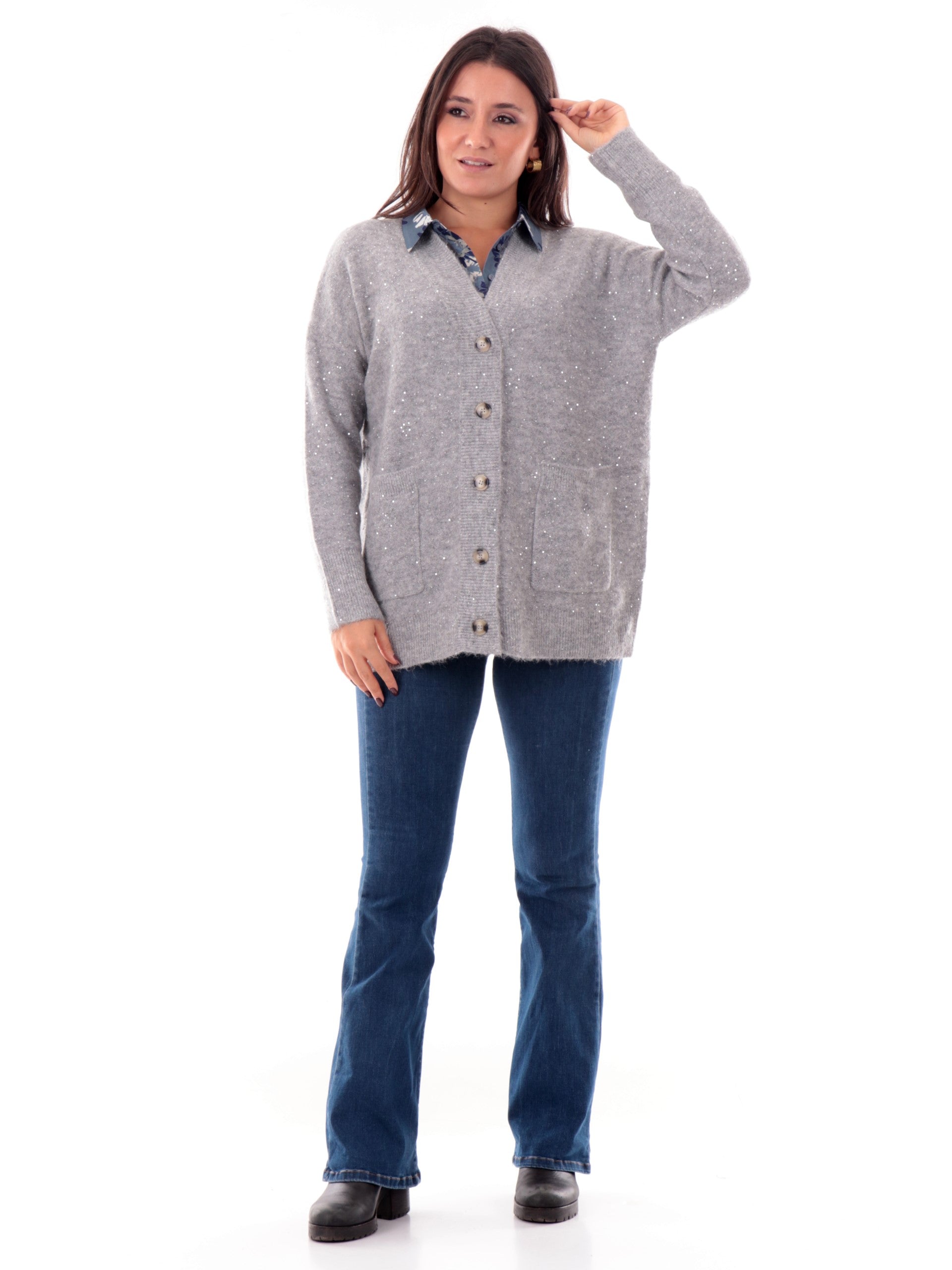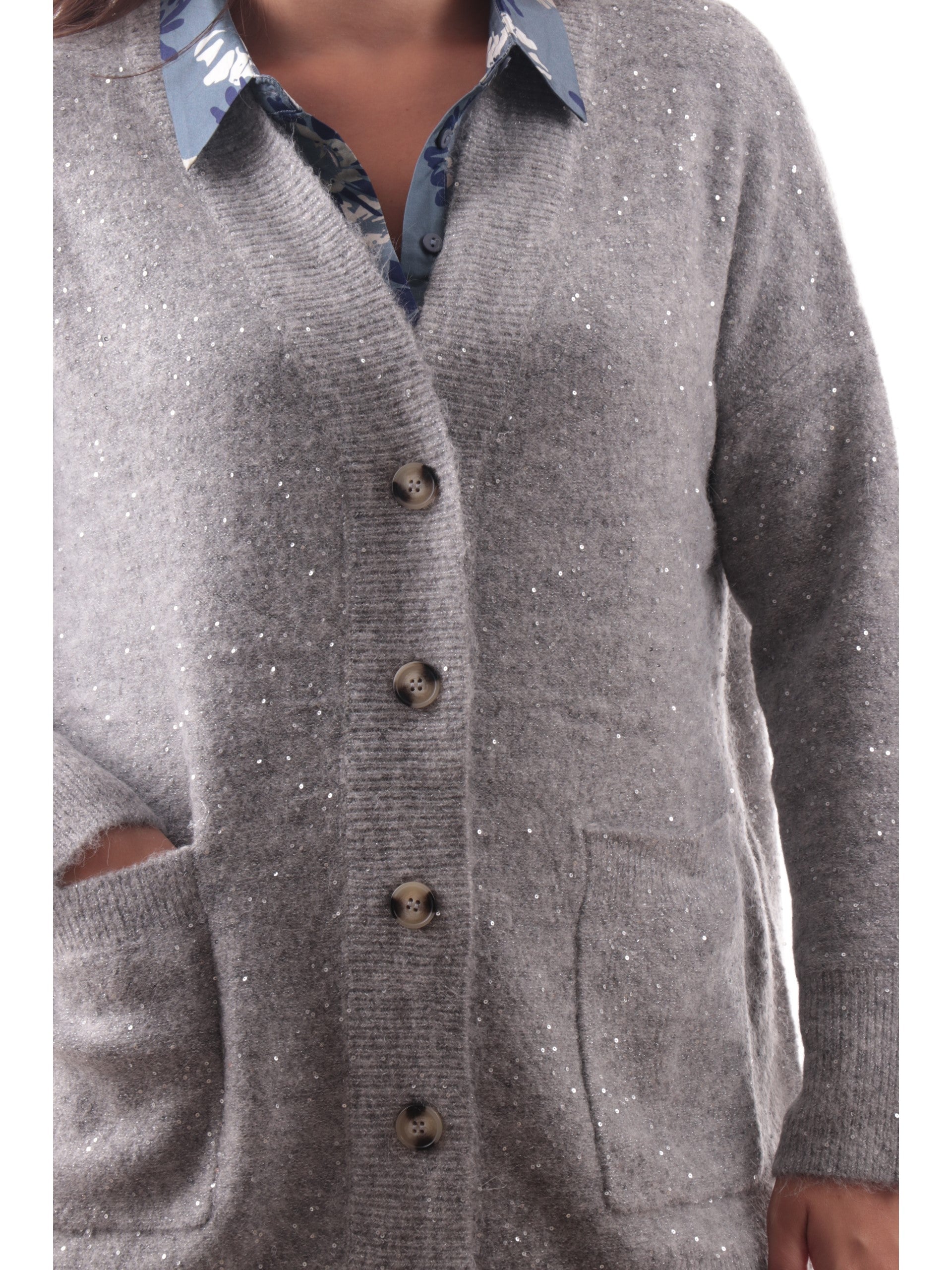 Maglione Cardigan Anis grigio da donna con scollo a V e pailletes e bottoni