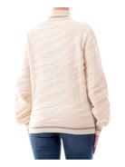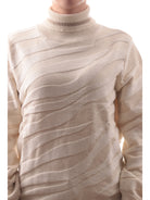 Maglione Dolcevita collo alto bianco e oro da donna con trama animalier impreziosita da dettagli lurex. Il bordo inferiore di questa maglia bianca donna Yes Zee ed il collo alto sono caratterizzati da bordini lurex oro.