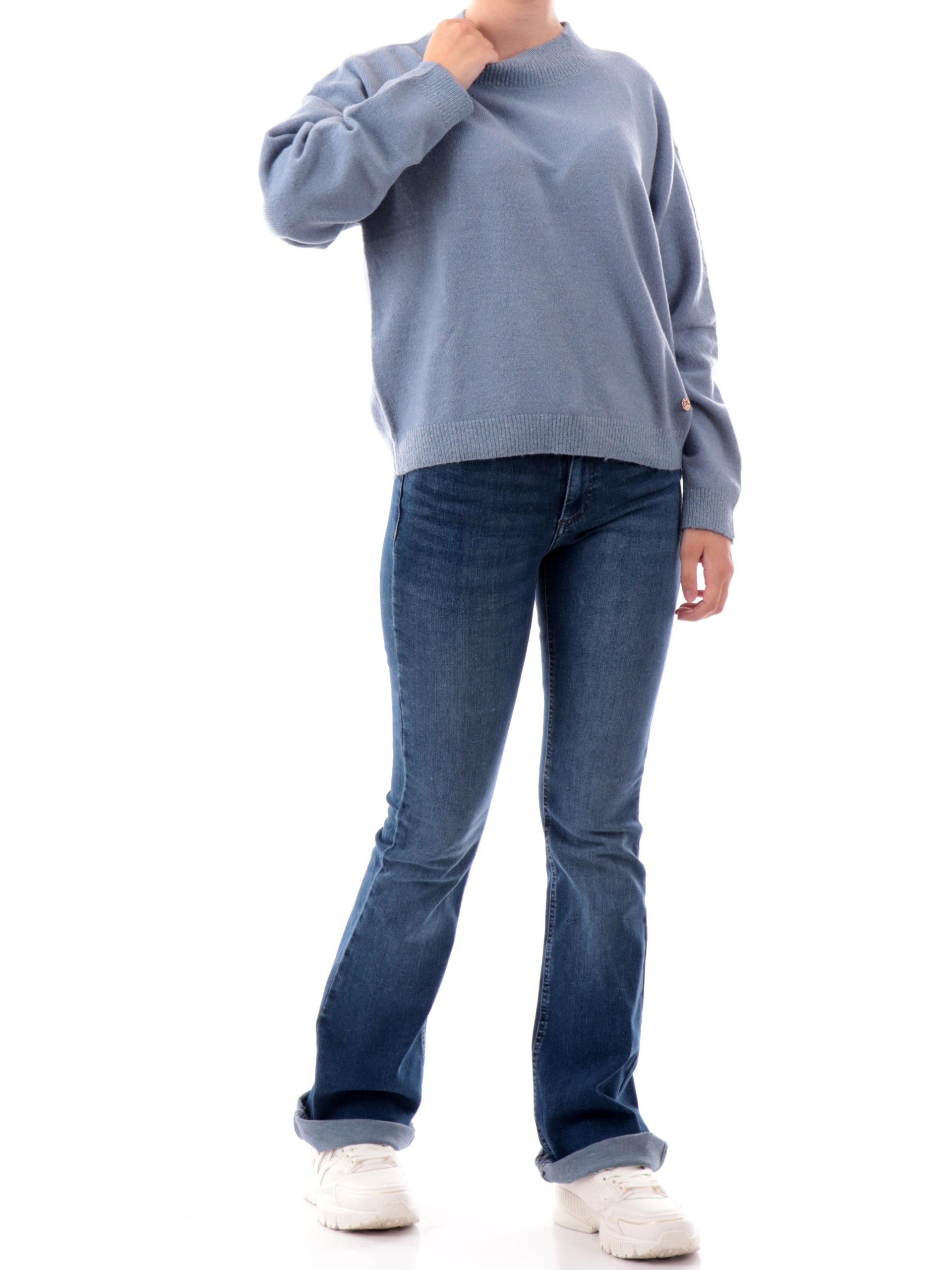 Maglione Yes Zee celeste lupetto . Questo maglione azzurro da donna yes zee è caratterizzato da colletto con lurex oro che profilano lo scollo alto e placchetta logo oro Yes Zee sul fondo.