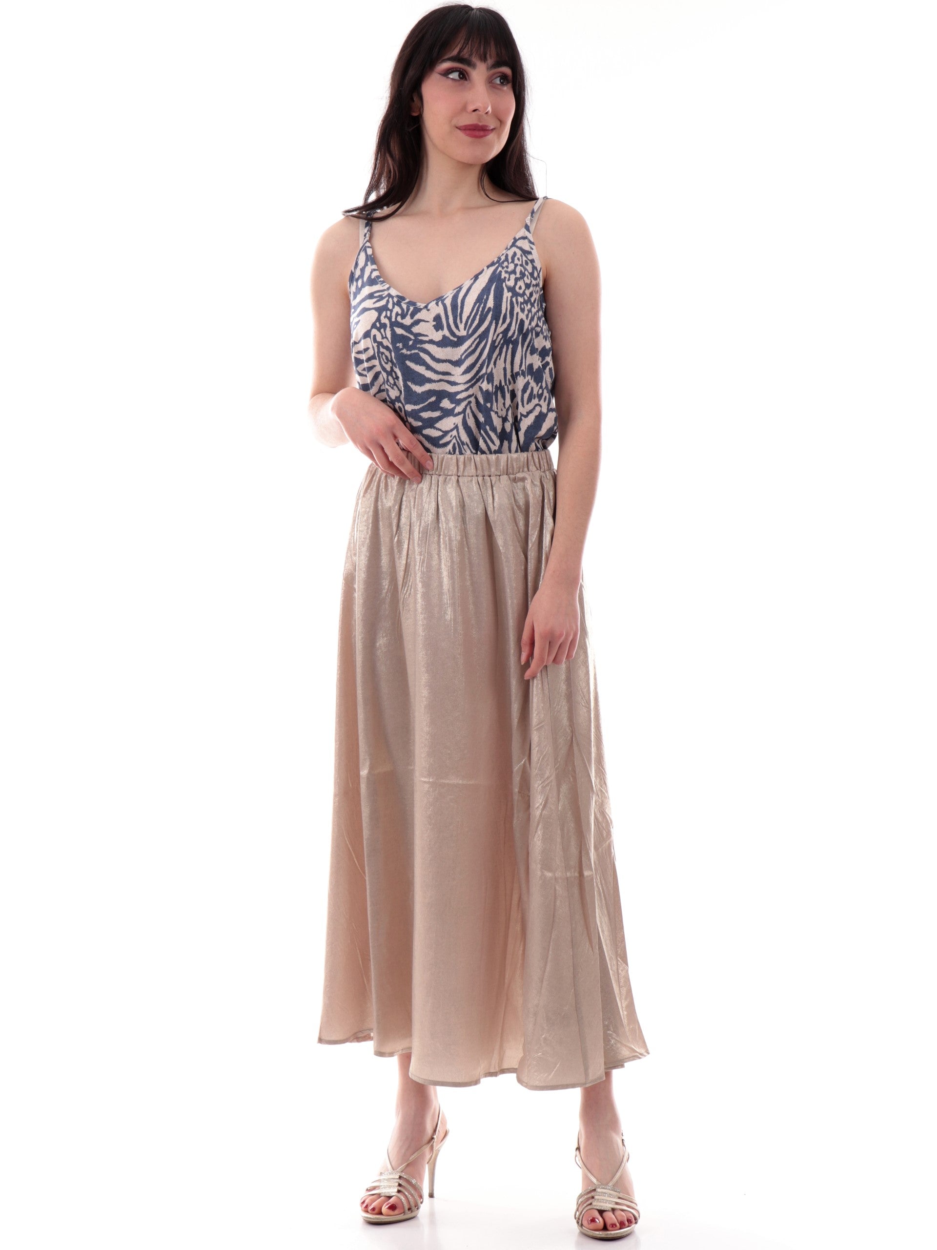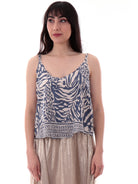 Top Molly Bracken da donna realizzato in viscosa dalla texture stampata a fantasia animalier beige e blu. Il modello NF101DP ha un taglio fluido e femminile, con scollo a V e fondo dritto. La parte superiore è caratterizzata da bretelle molto sottili e regolabili, che danno a questa canottiera un fascino seducente.