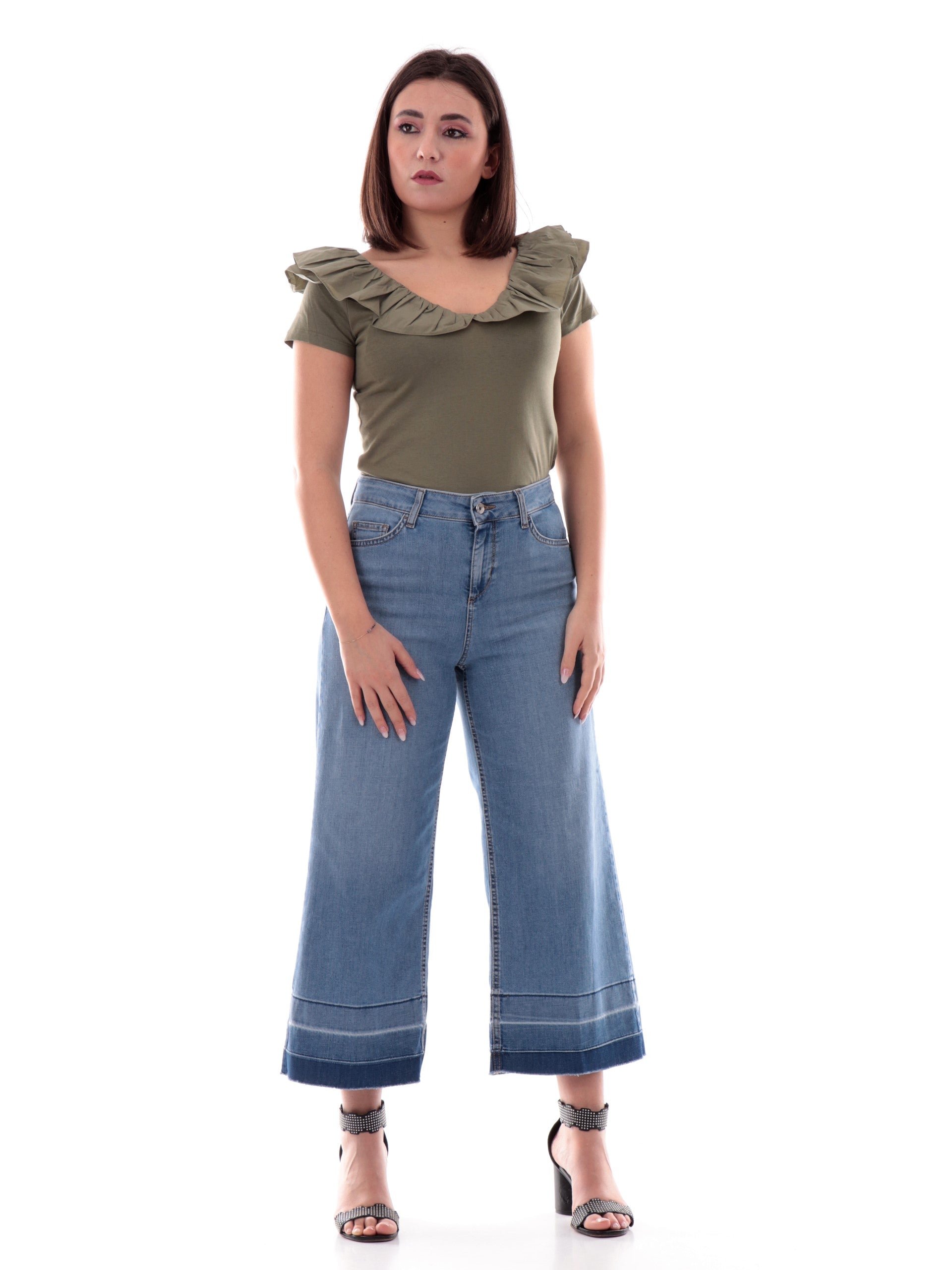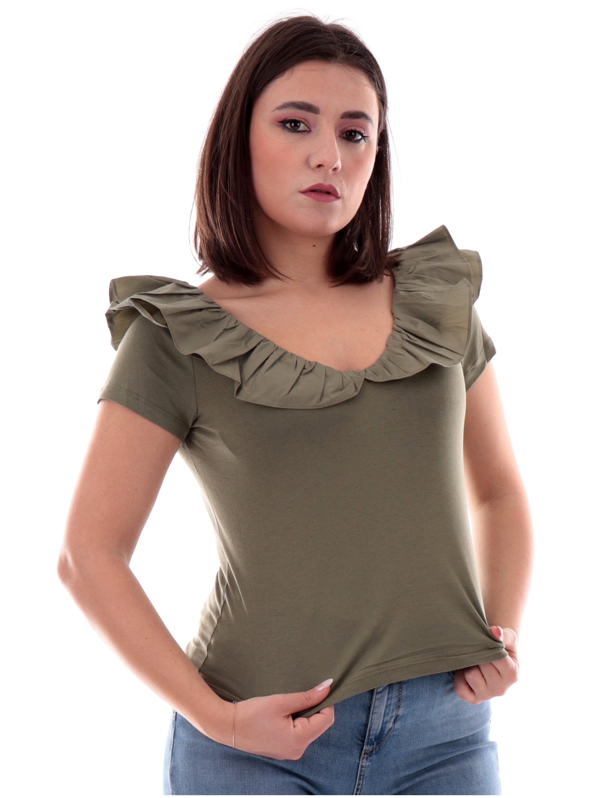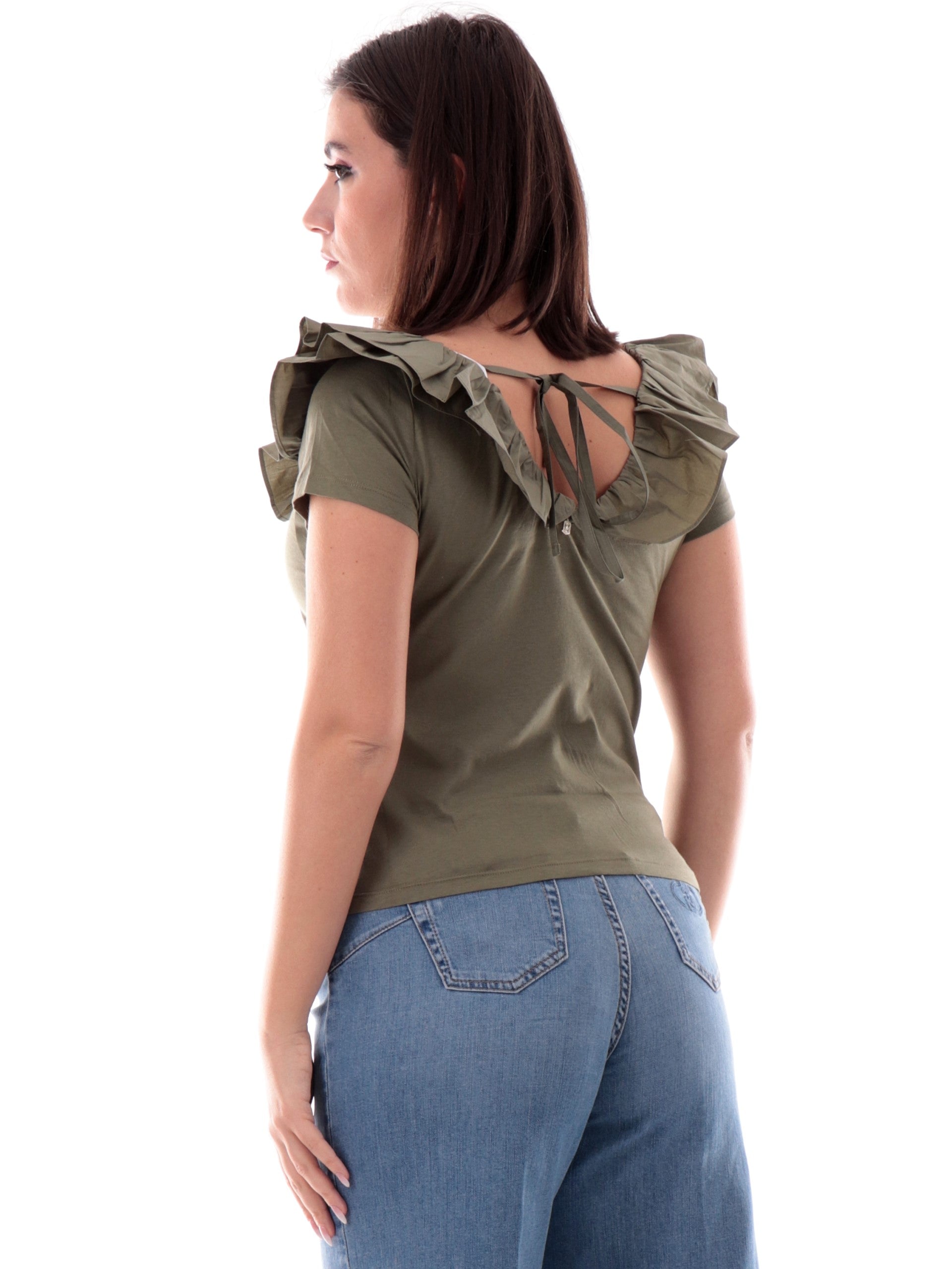 Maglia Liu Jo verde militare da donna con rouches e scollo a V. Questa T-shirt Liu Jo è caratterizzata da voilant sullo scollo e ciondolo logo gioiello Liu Jo sul retro.