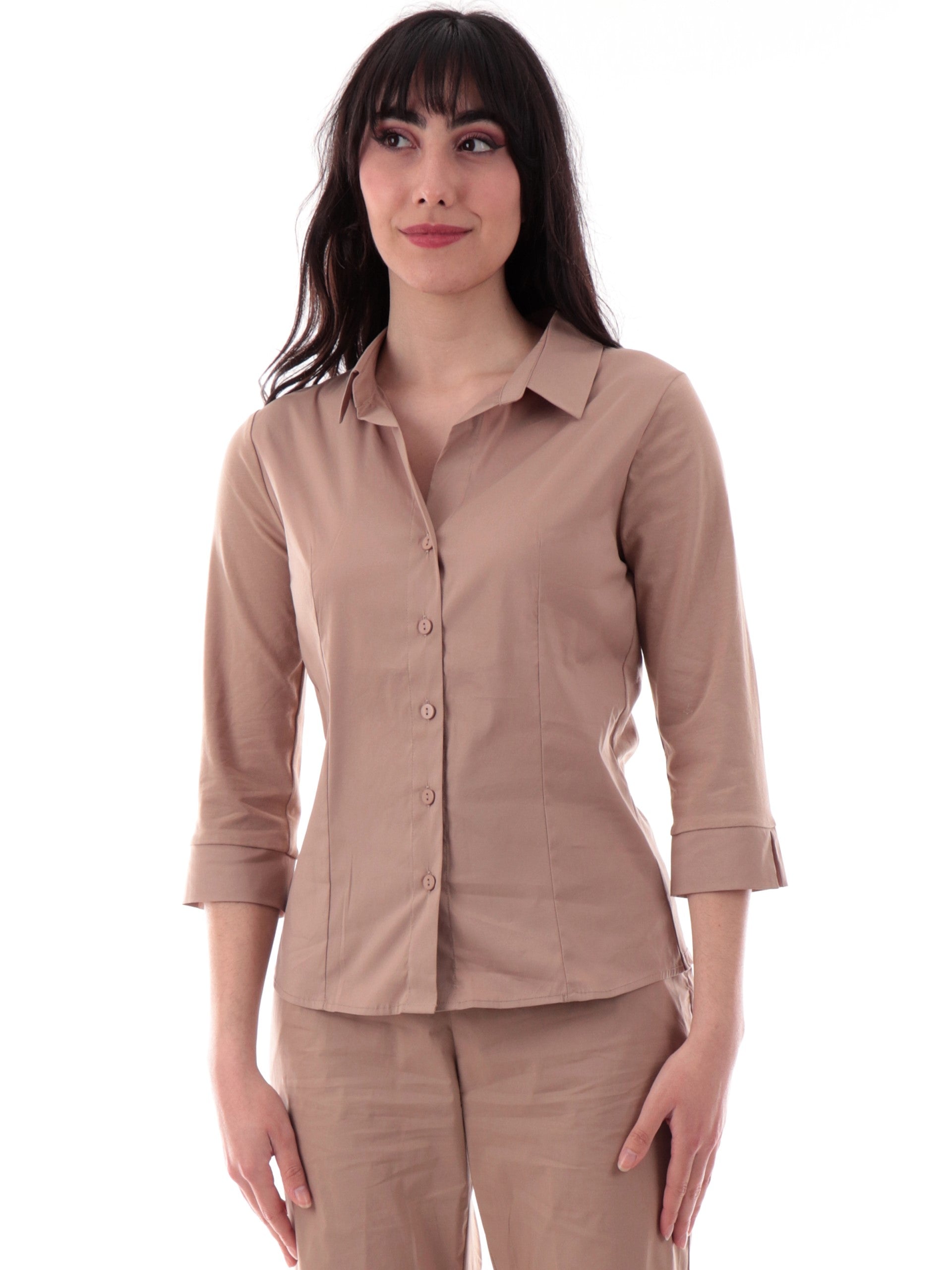 Camicia Anis scollo a V marrone da donna maniche tre quarti 251C1065, realizzata in cotone. Questa camicia Anis White marrone ha il colletto alla francese, lo scollo a V, la chiusura con bottoni e lemaniche tre quarti.