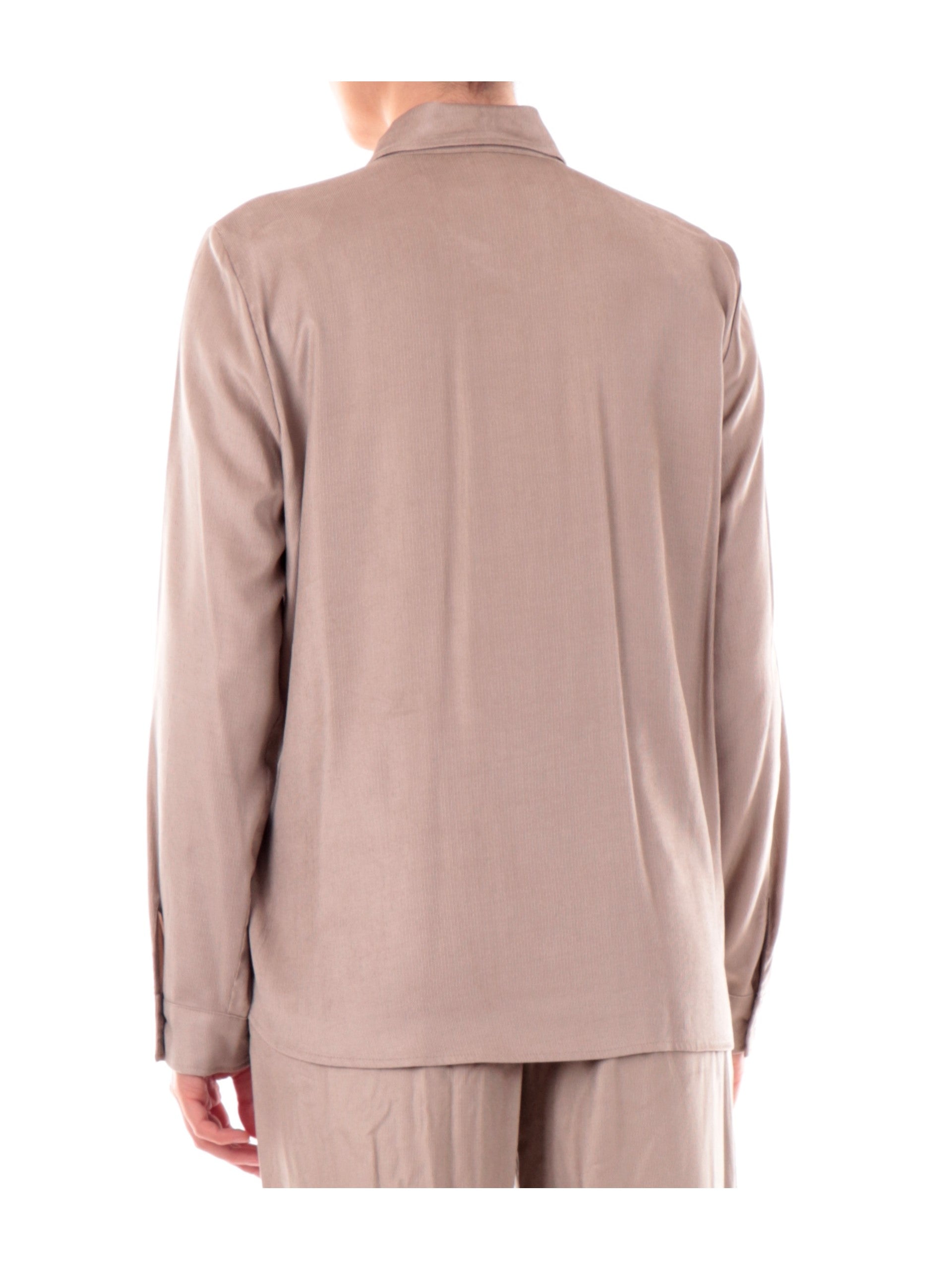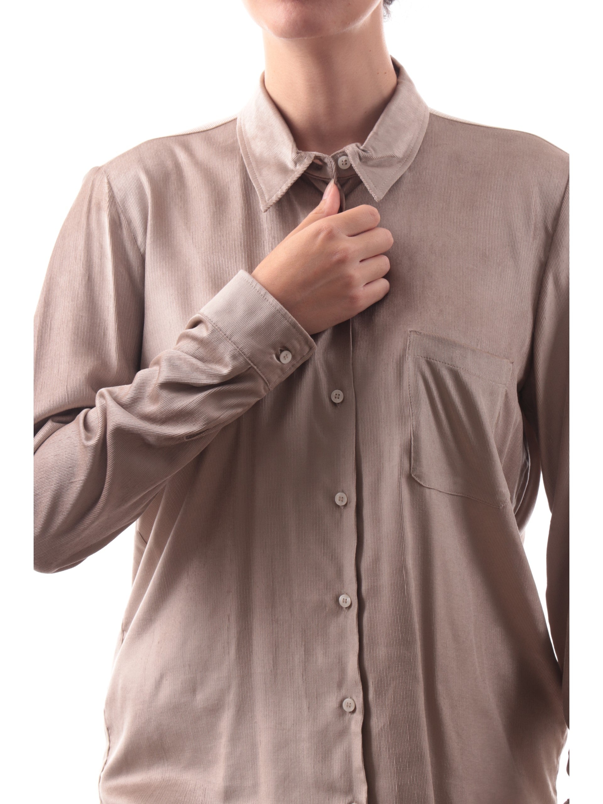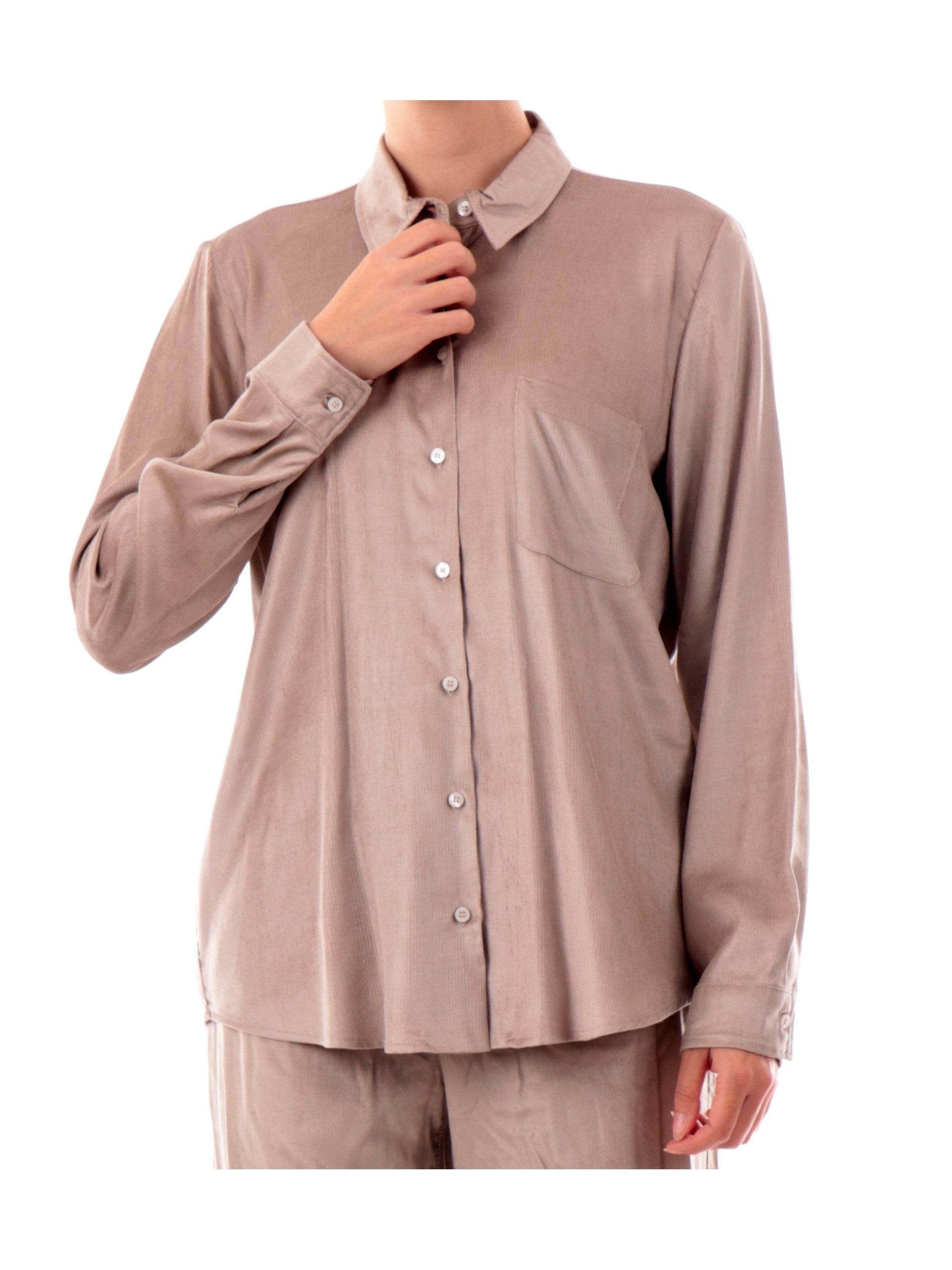 Camicia Emme Marella di velluto beige da donna ORMA con taschino. Questa camicia beige è realizzata in un soffice tessuto, è caratterizzata da un taschino,ha le maniche lunghe con polsini e la chiusura con bottoni.