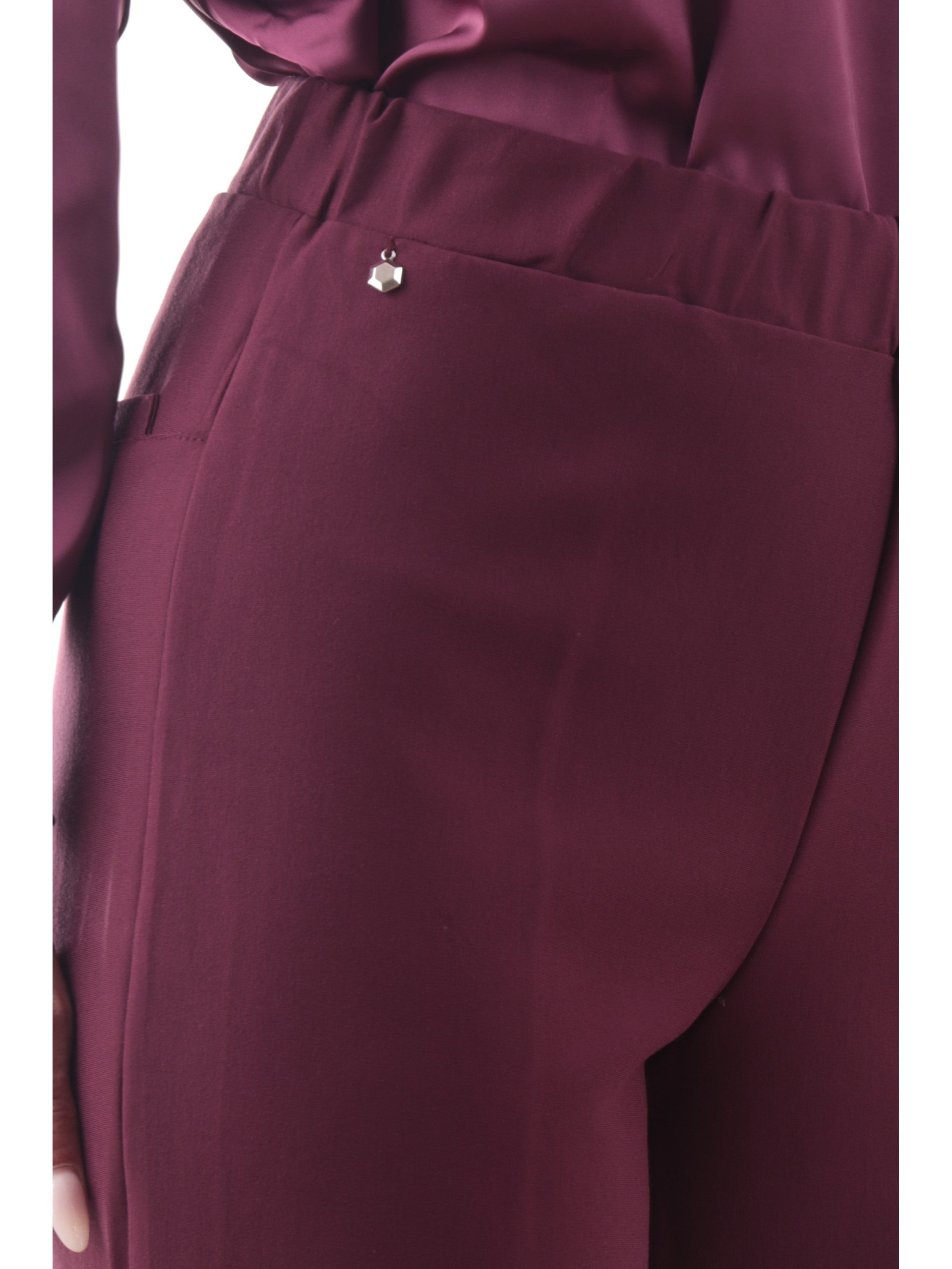 Pantaloni Ragno Flare bordeaux da donna elasticizzati DL20PC, realizzati in viscosa. Questi pantaloni donna Ragno bordeuax hanno la banda elastica sul punto vita, due tasche posteriori a filo e il ciondolo del brand applicato sul lato destro.