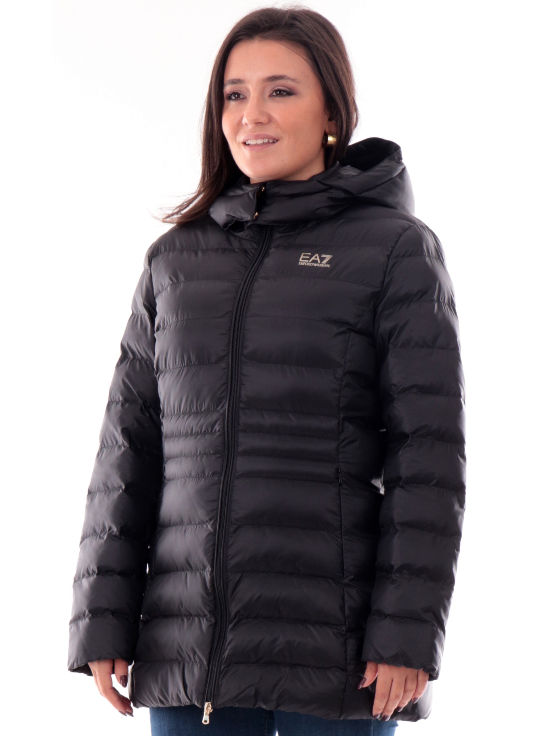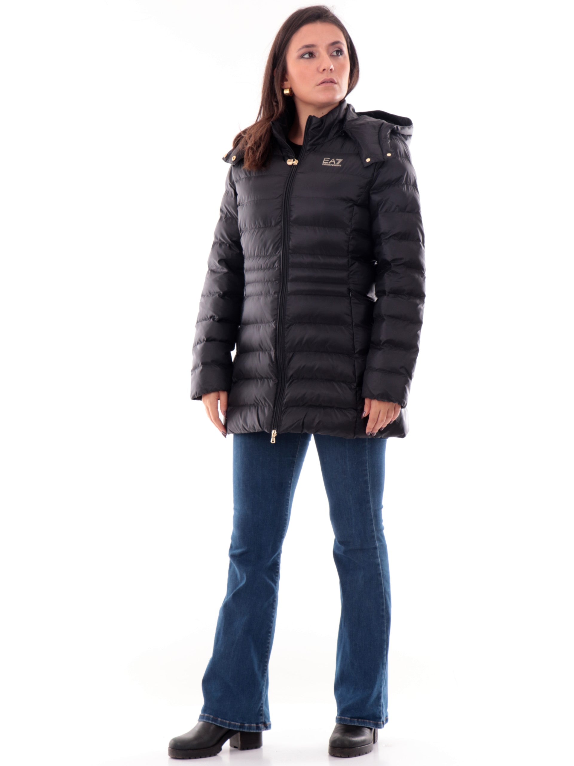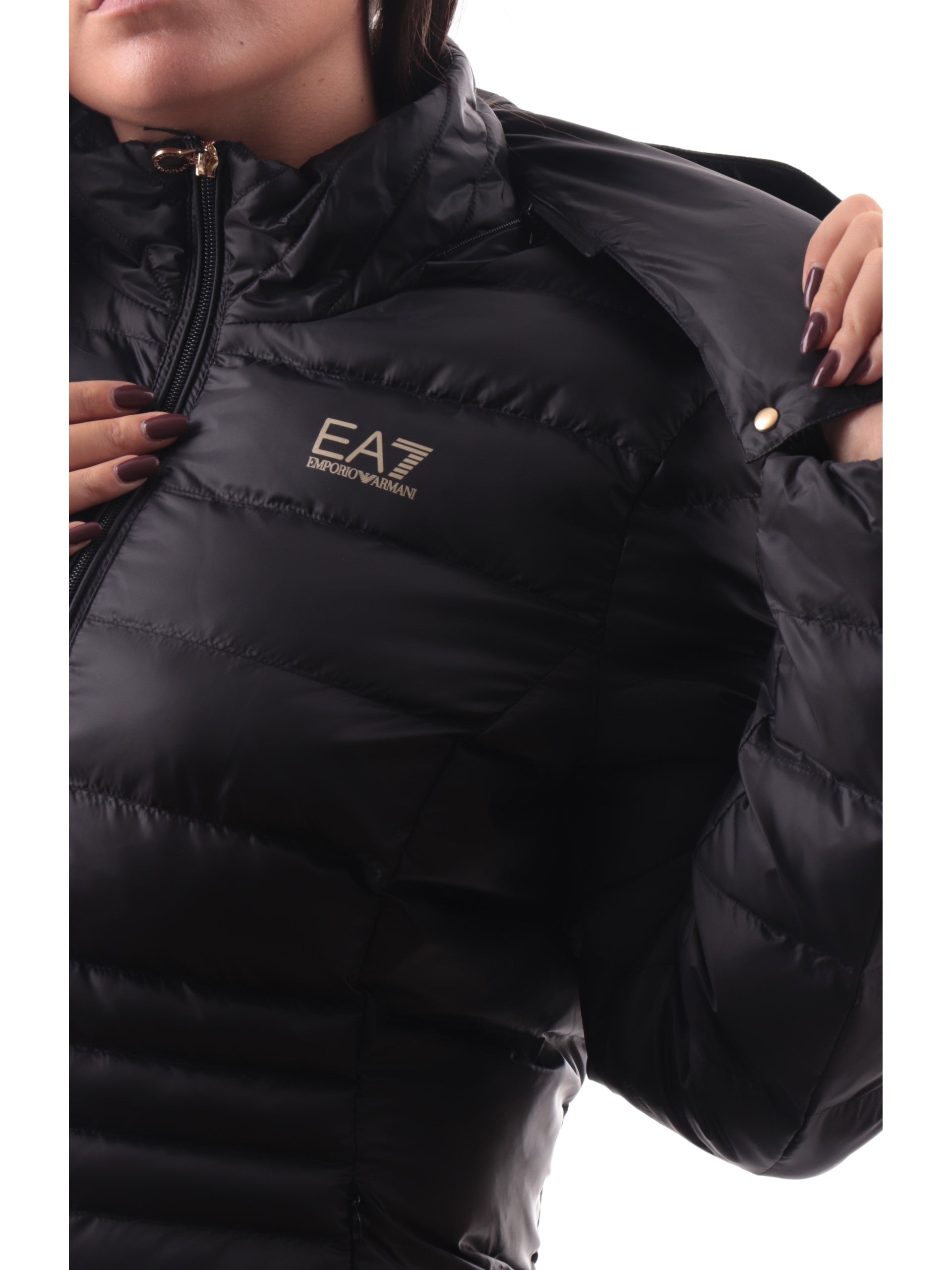 Piumino Emporio Armani 7 nero da donna realizzato in tessuto trapuntato con imbottitura ecologica. Questo piumino armani nero da donna ha il cappuccio removibile e il logo EA7 oro stampato lato cuore.