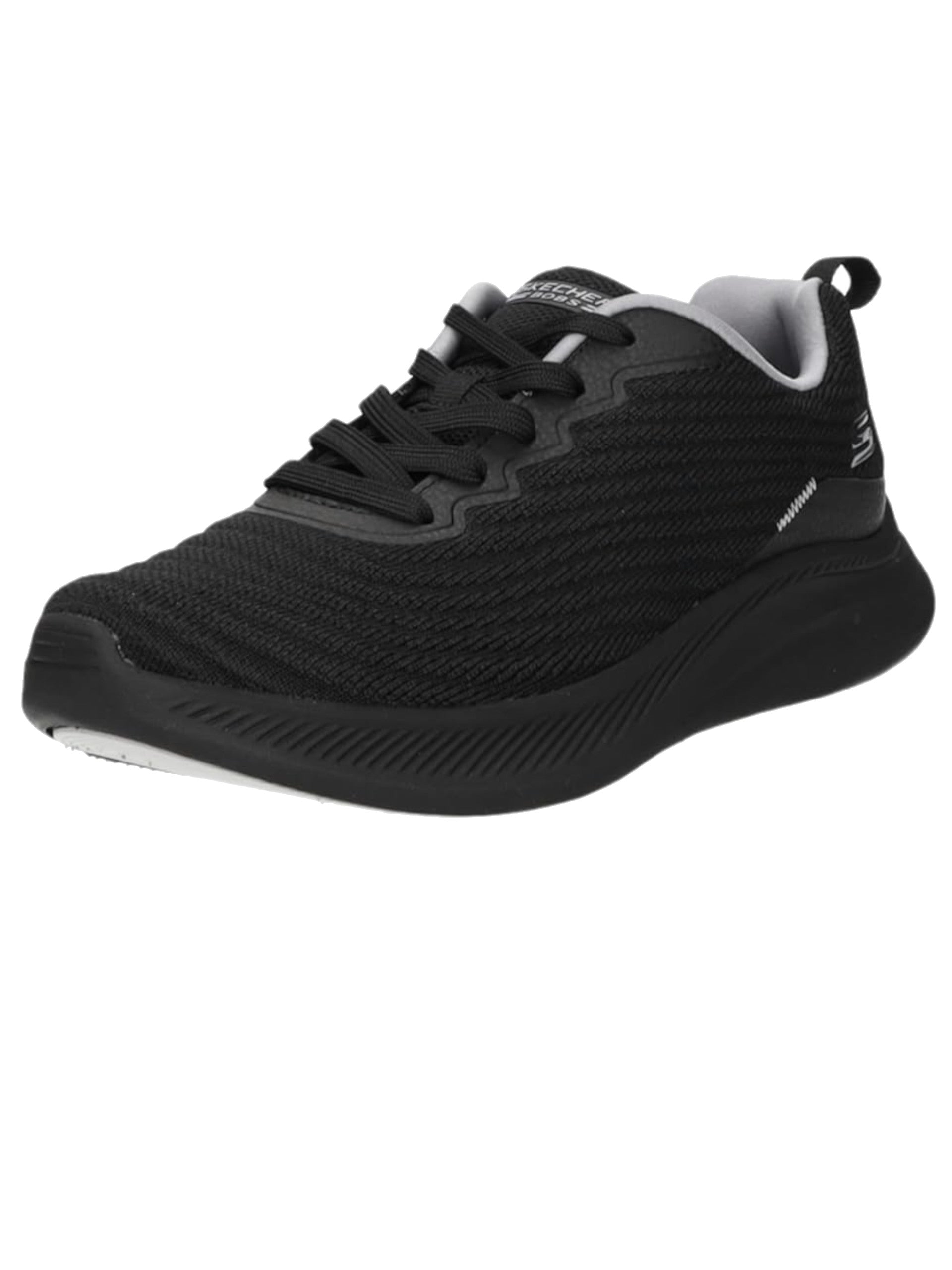 Scarpe Skechers nere Bobs Flex Mellow Dawn da donna Vegan. Queste scarpe Skechers nere hanno la tomaia in maglia ingegnerizzata testurizzata, la chiusura con lacci, la suola in gomma che garantisce un corretto sostegno dell'arco plantare e una soletta Skechers Air-Cooled Memory Foam.