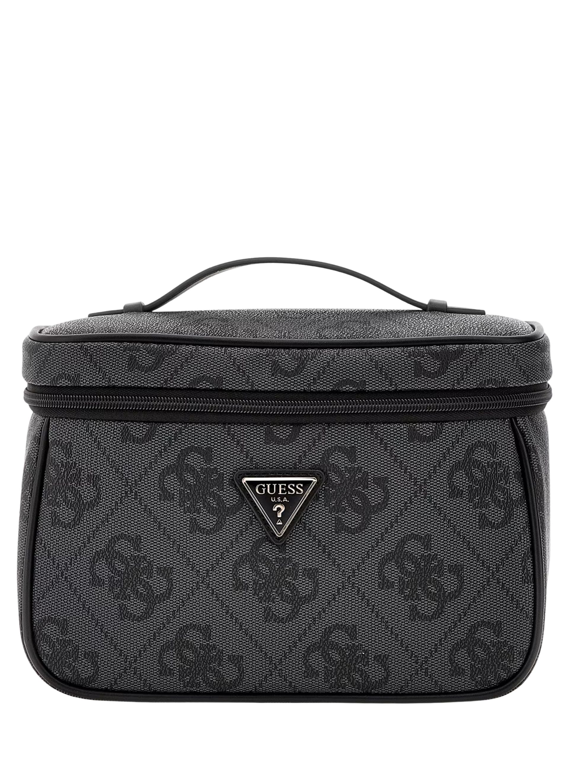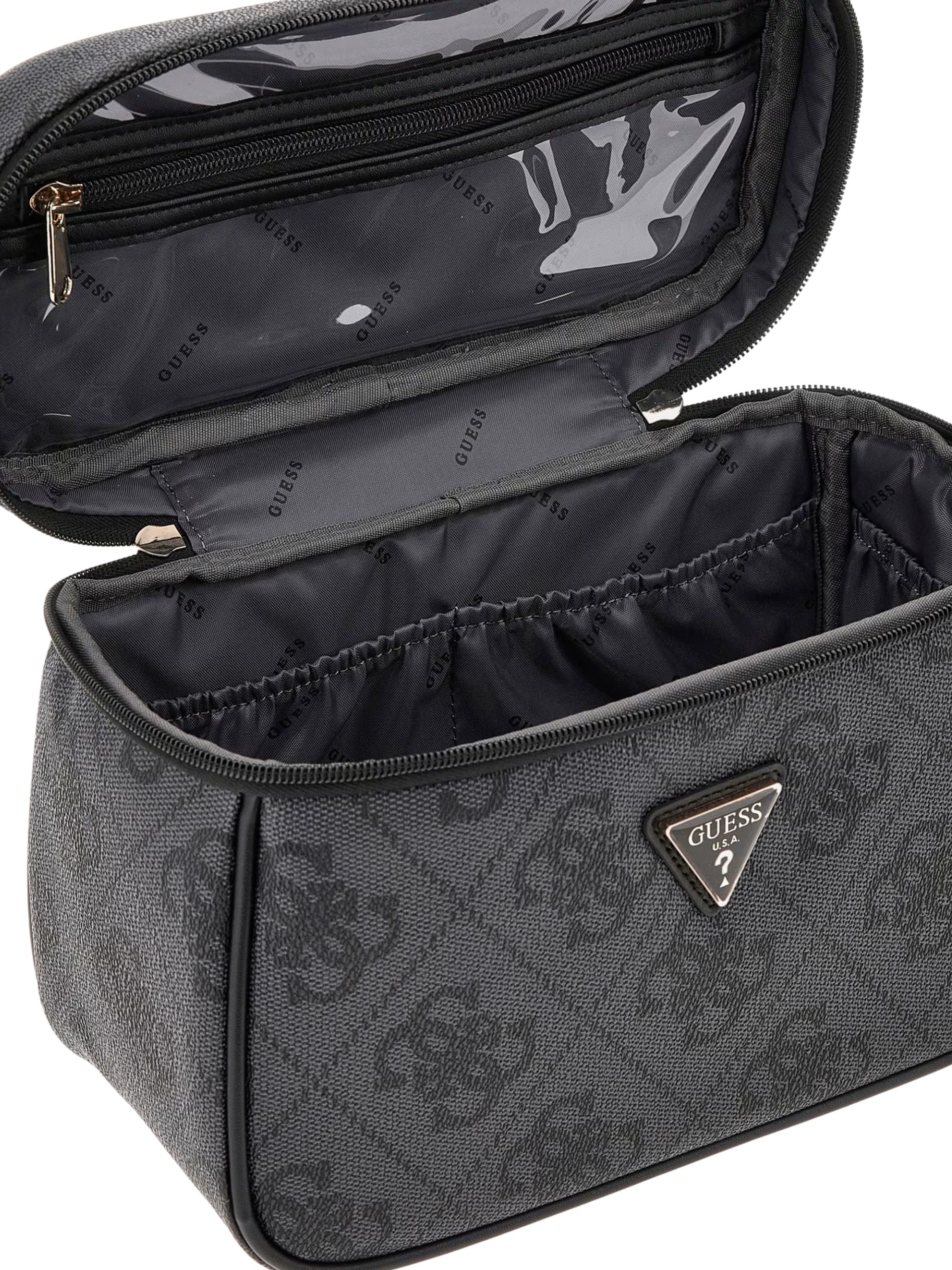 Beauty Case Guess toiletry grigio con loghi neri. Questo capiente Beauty è realizzato in tessuto resistente e stabile che ti permette di portare questo beauty anche sopra una valigia. La capienza generosa e le tasche interne ti permettono di unire allo stile indiscutibile anche la pratica organizzazione.