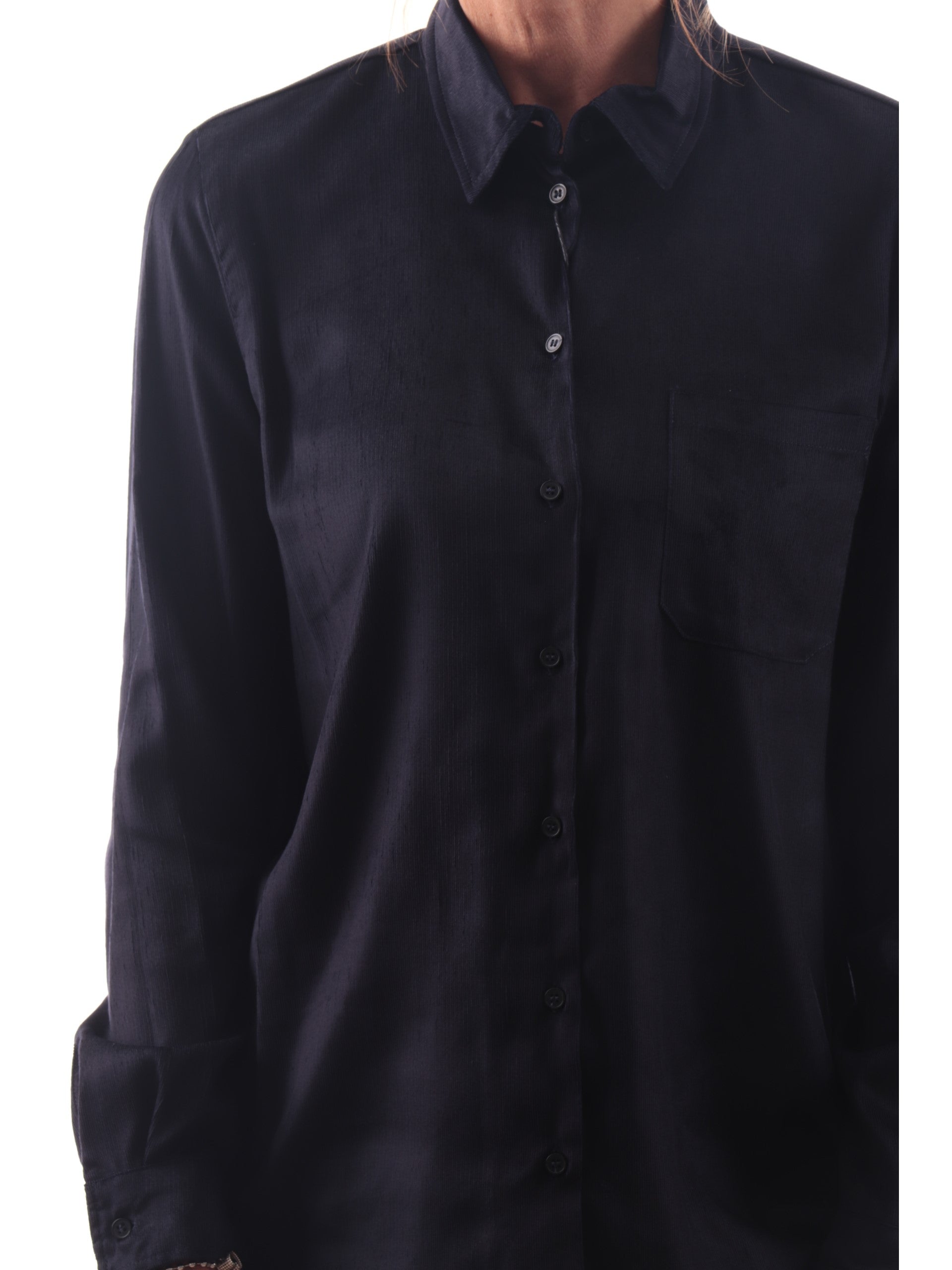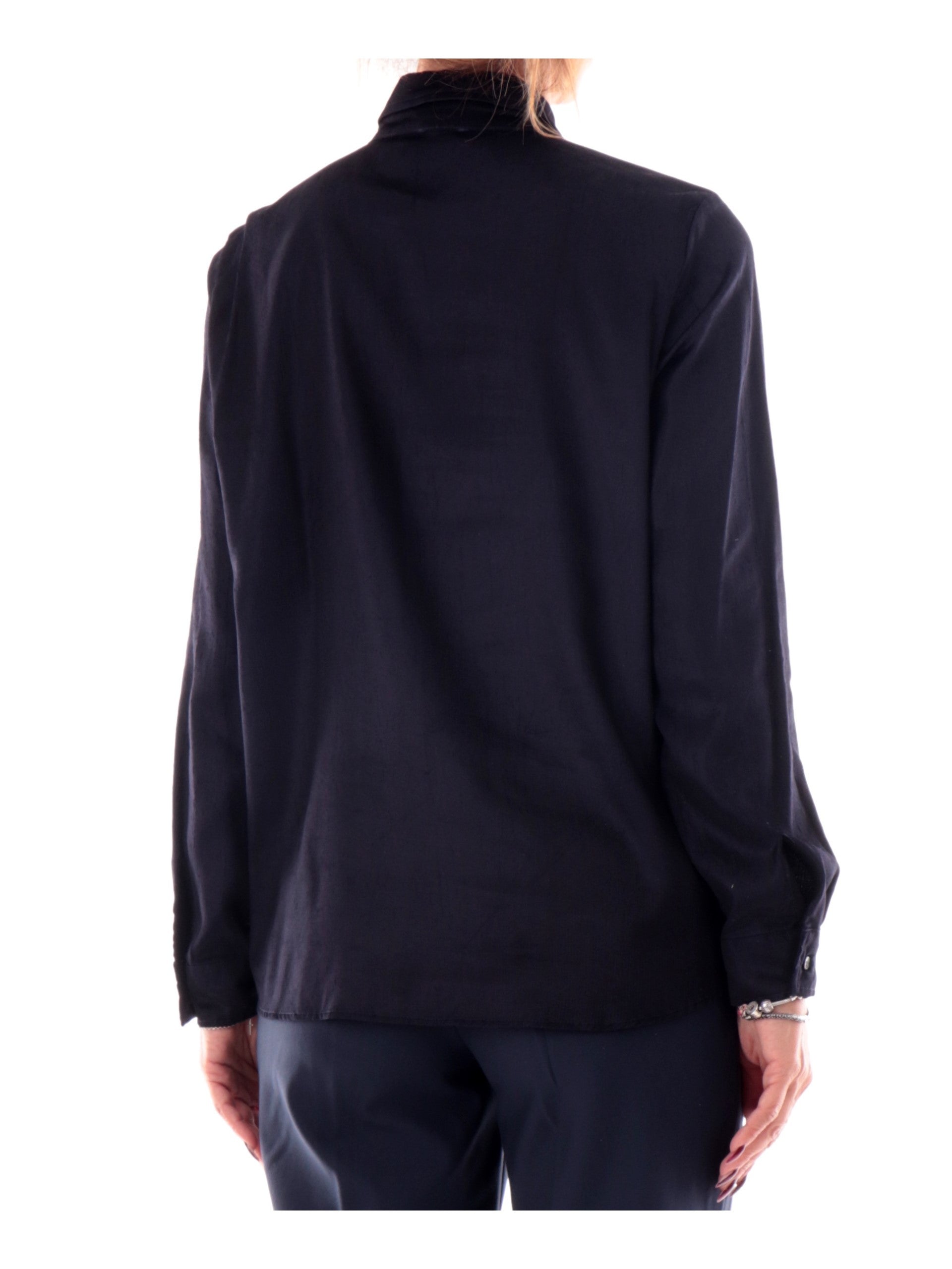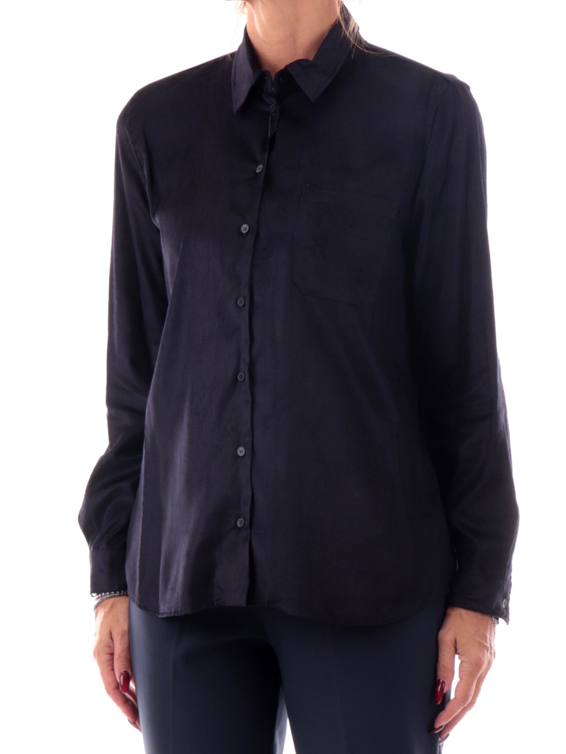 Camicia Emme Marella blu in velluto da donna con taschino ORMA, realizzata in viscosa. Questa camicia Marella blu ha il colletto alla francese, la chiusura con bottoni, le maniche lunghe con polsini e un taschino lato cuore.