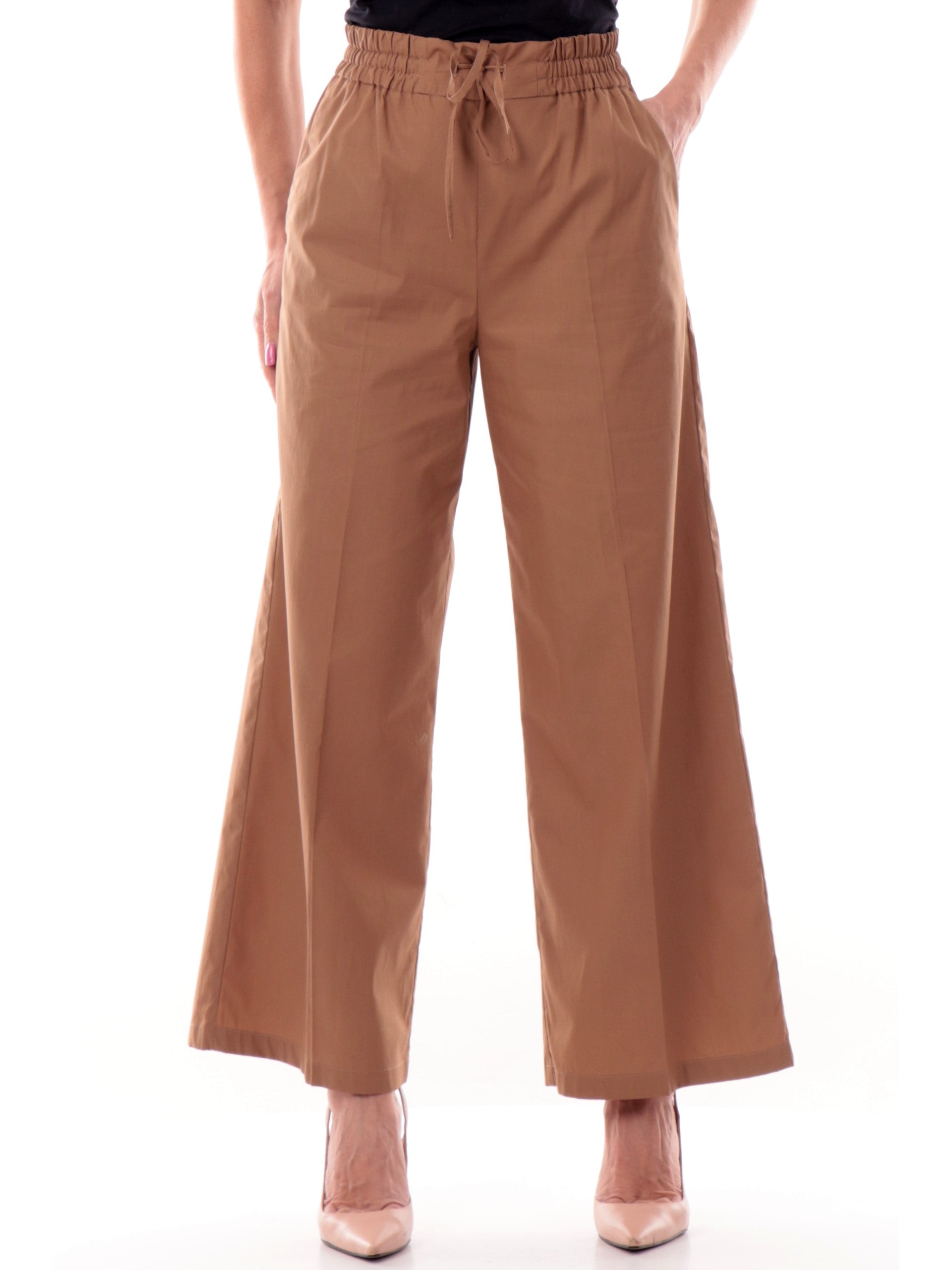 Pantaloni marroni Emme Marella da donna a palazzo. Questi pantaloni da donna, realizzati 100% in puro cotone, perfetti per un look casual e perfetti per la stagione primavera-estate, hanno la banda elastica sul punto vita con lacci regolabili, due tasche laterali aperte e gamba larga