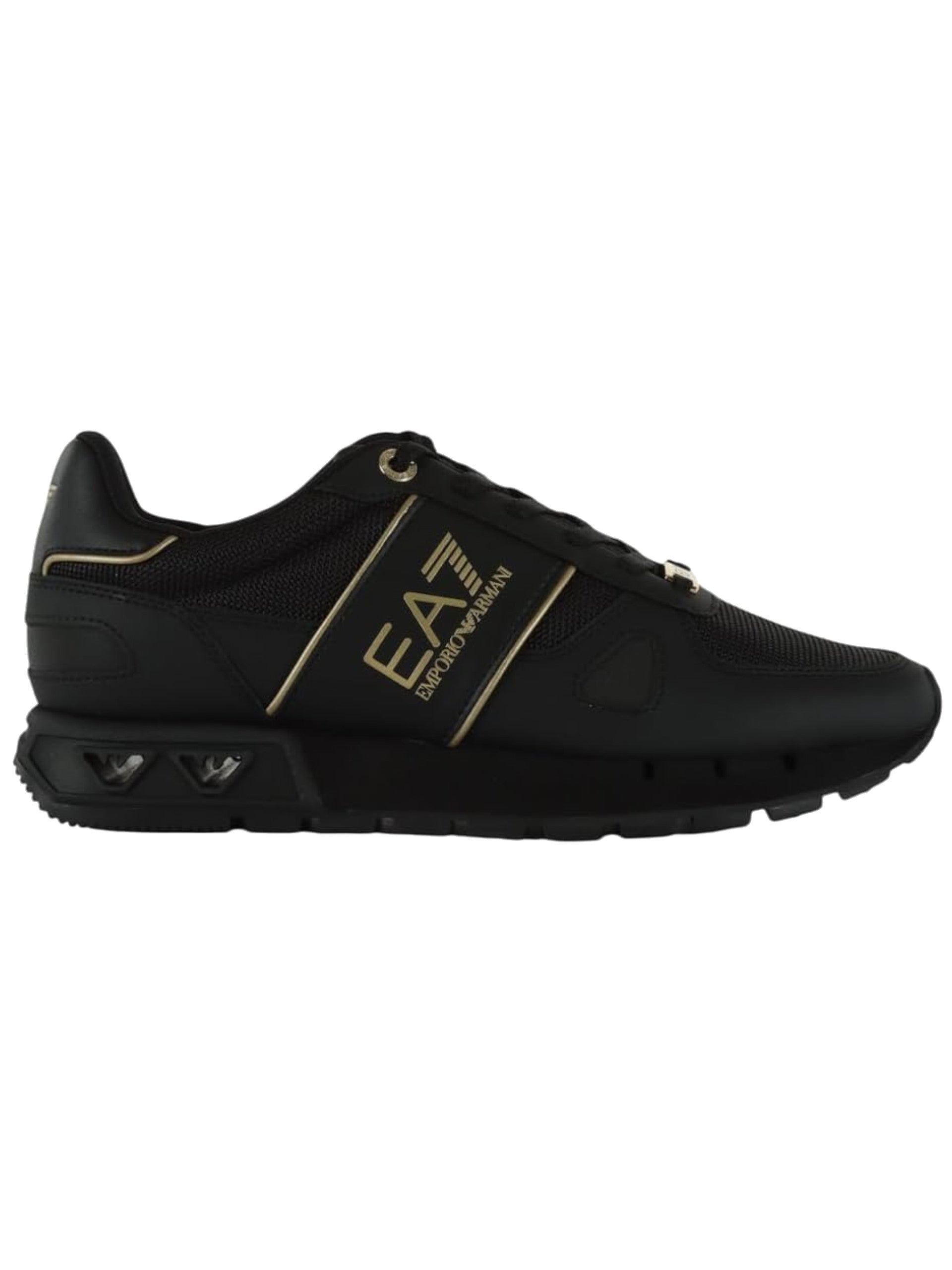 Scarpe Emporio Armani EA7 nere unisex. Queste sneakers EA7 nere hanno la tomaia in mesh, la suola in gomma. Sul davanti di queste EA7 troviamo la classica chiusura a lacci e il logo del brand a contrasto colore.