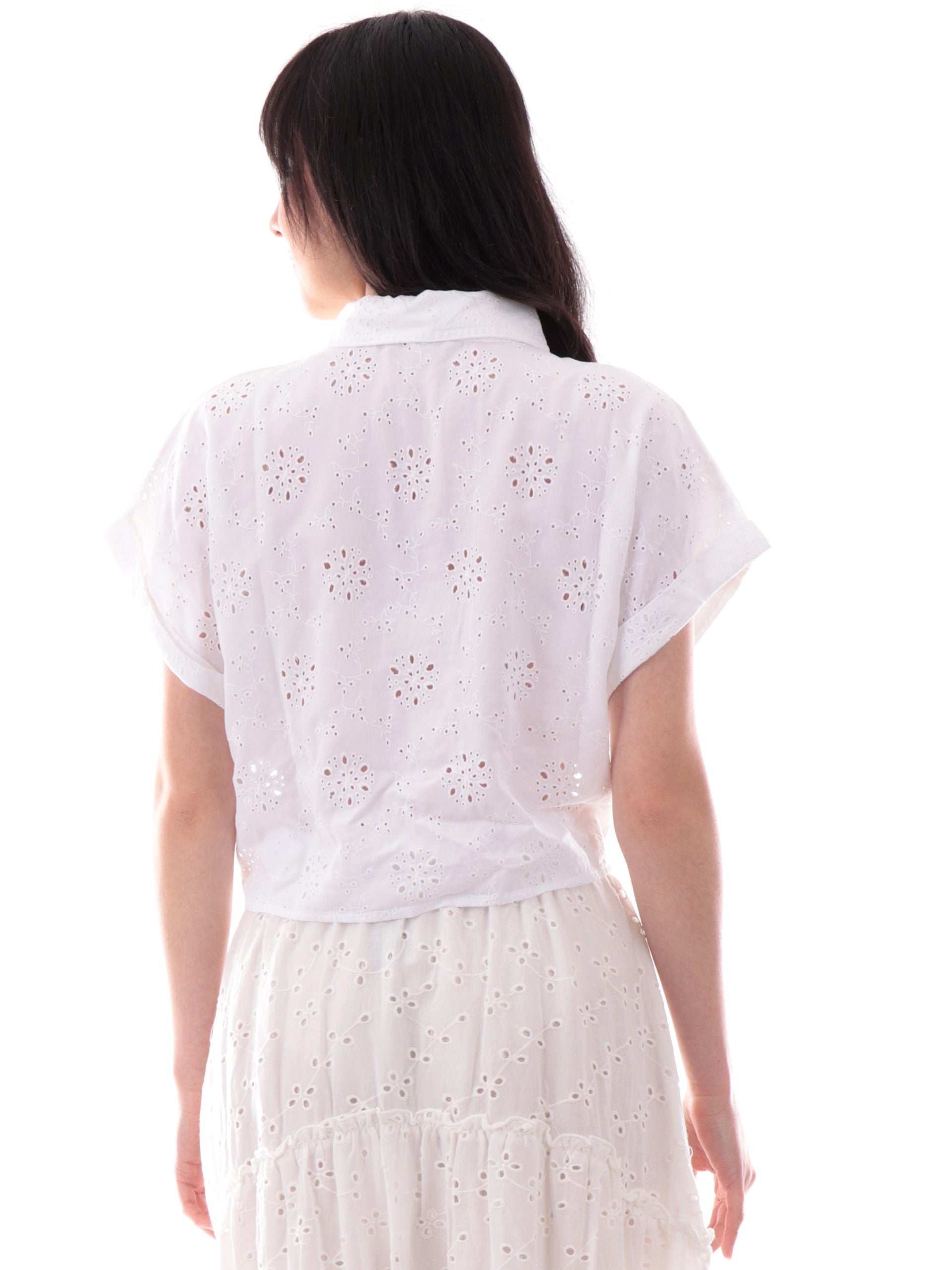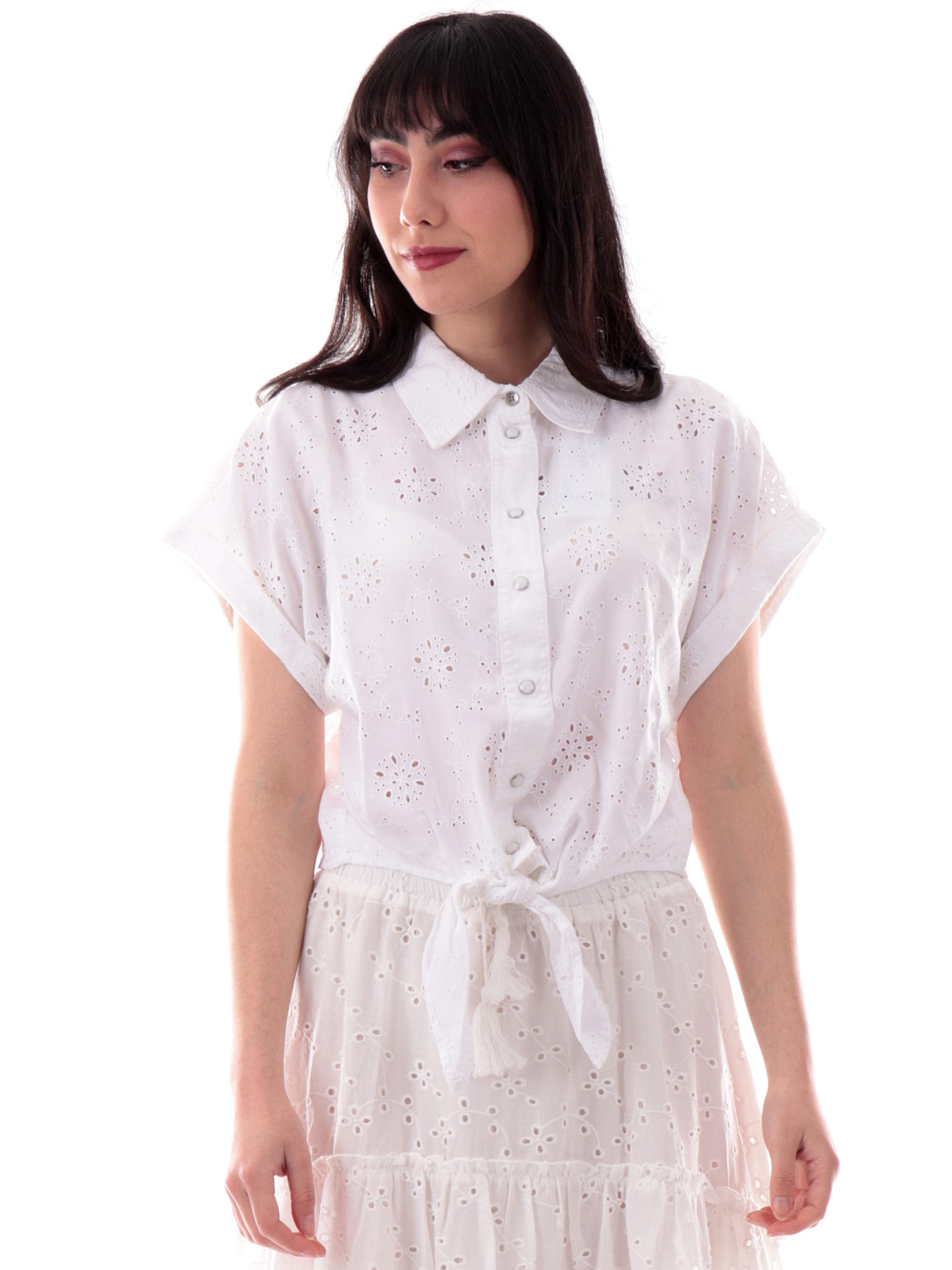 Camicia Guess bianca da donna in tessuto macrame sangallo con nodo. Questa camicia crop corta con nodo da donna è realizzata in morbido tessuto traforato con chiusura centrale bottoni automatici perlati .