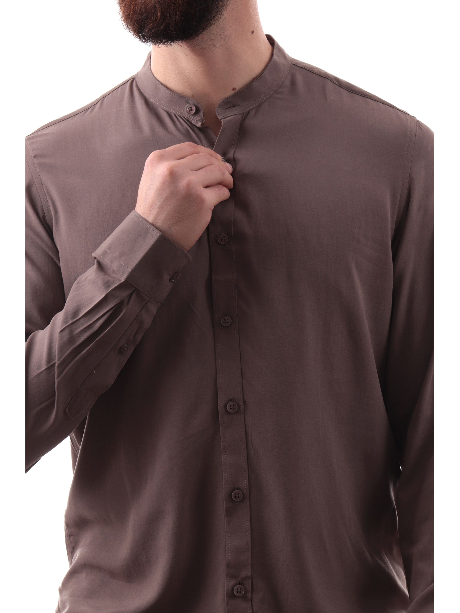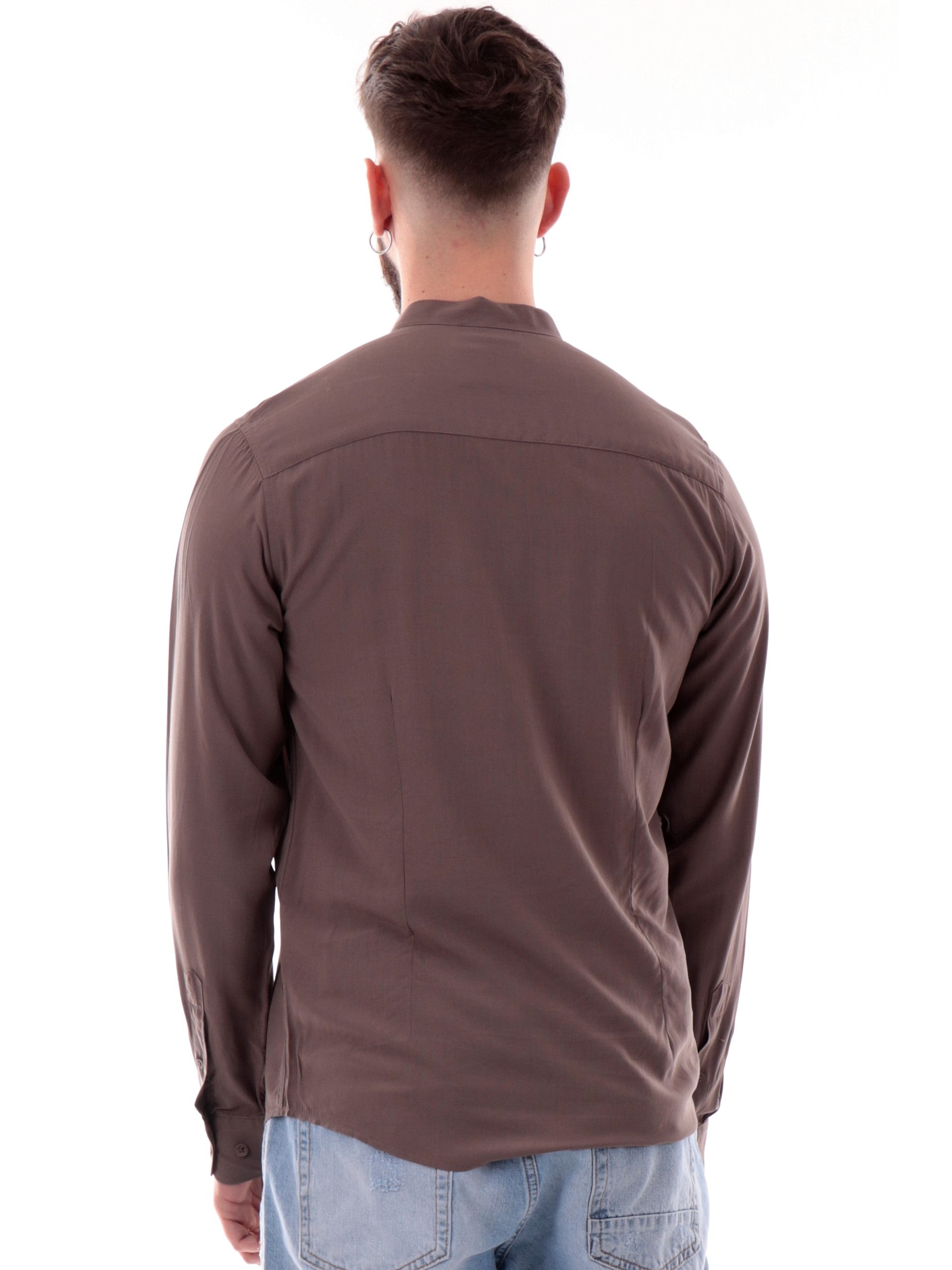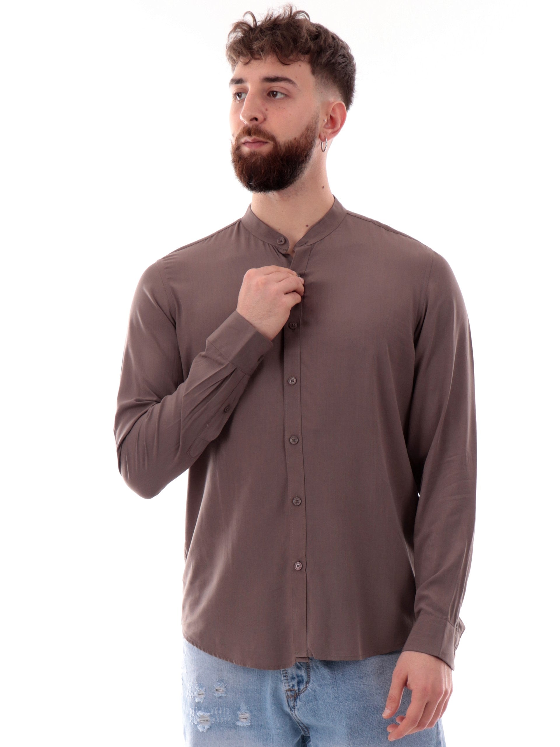 Camicia Gianni Lupo marrone da uomo coreana GL7676SS25, realizzata in morbida viscosa. Questa camicia uomo Gianni Lupo marrone ha il colletto alla coreana, la chiusura con bottoni e le maniche lunghecon polsini.