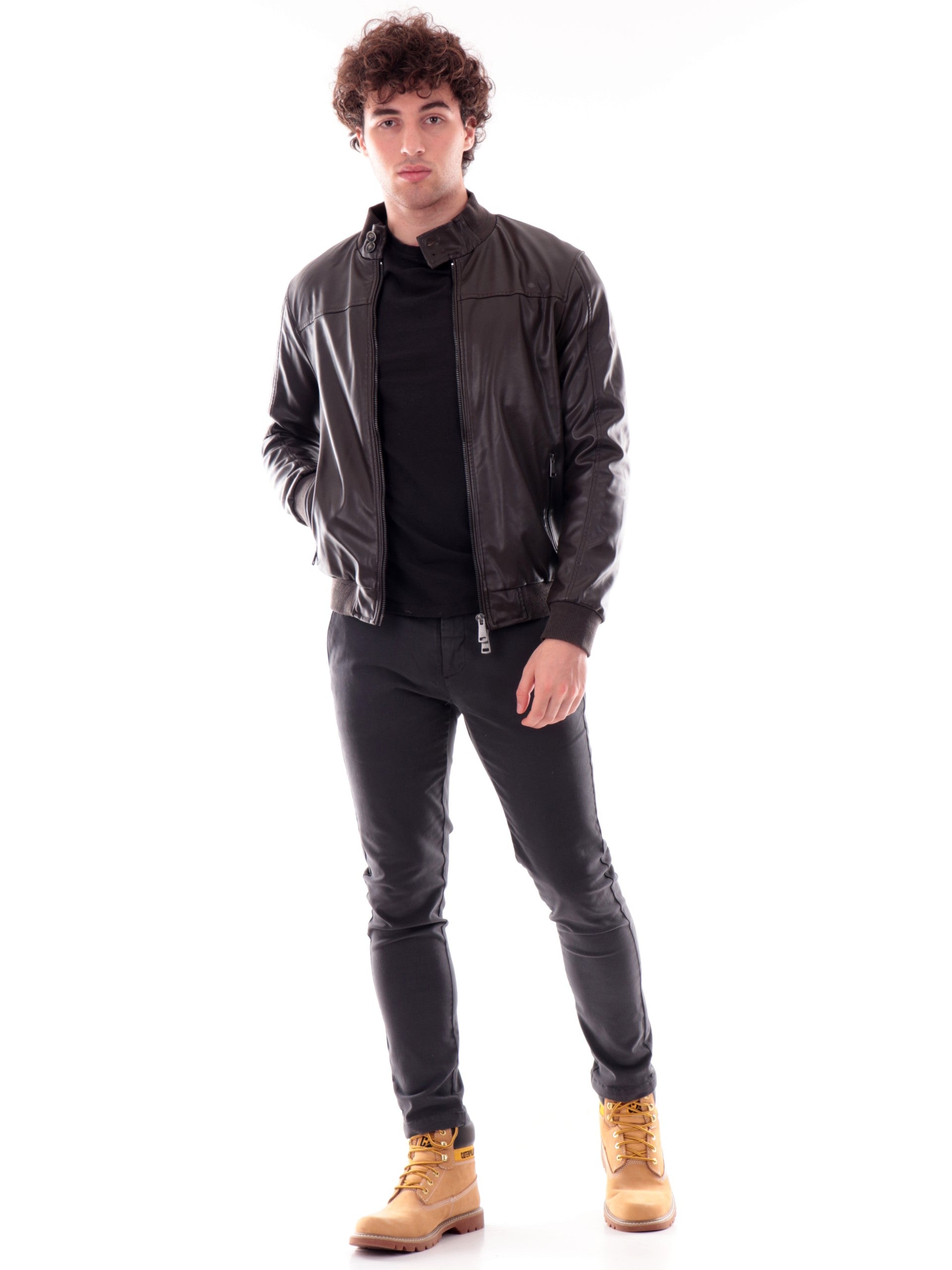 Giacca ecopelle marrone GIANNI LUPO uomo. Questa giacca in ecopelle al suo interno troviamo un tessuto caldo, soffice ed avvolgente al tatto perfetto per la stagione autunno-inverno. Questa giacca GIANNI LUPO è caratterizzata dal colletto a costine con bottoni chiusura full zip centrale, due tasche laterali con zip, al suo interno troviamo una tasca con zip, i polsini e fondo elasticizzati a costine. La giacca Gianni Lupo è perfetta sopra un jeans.