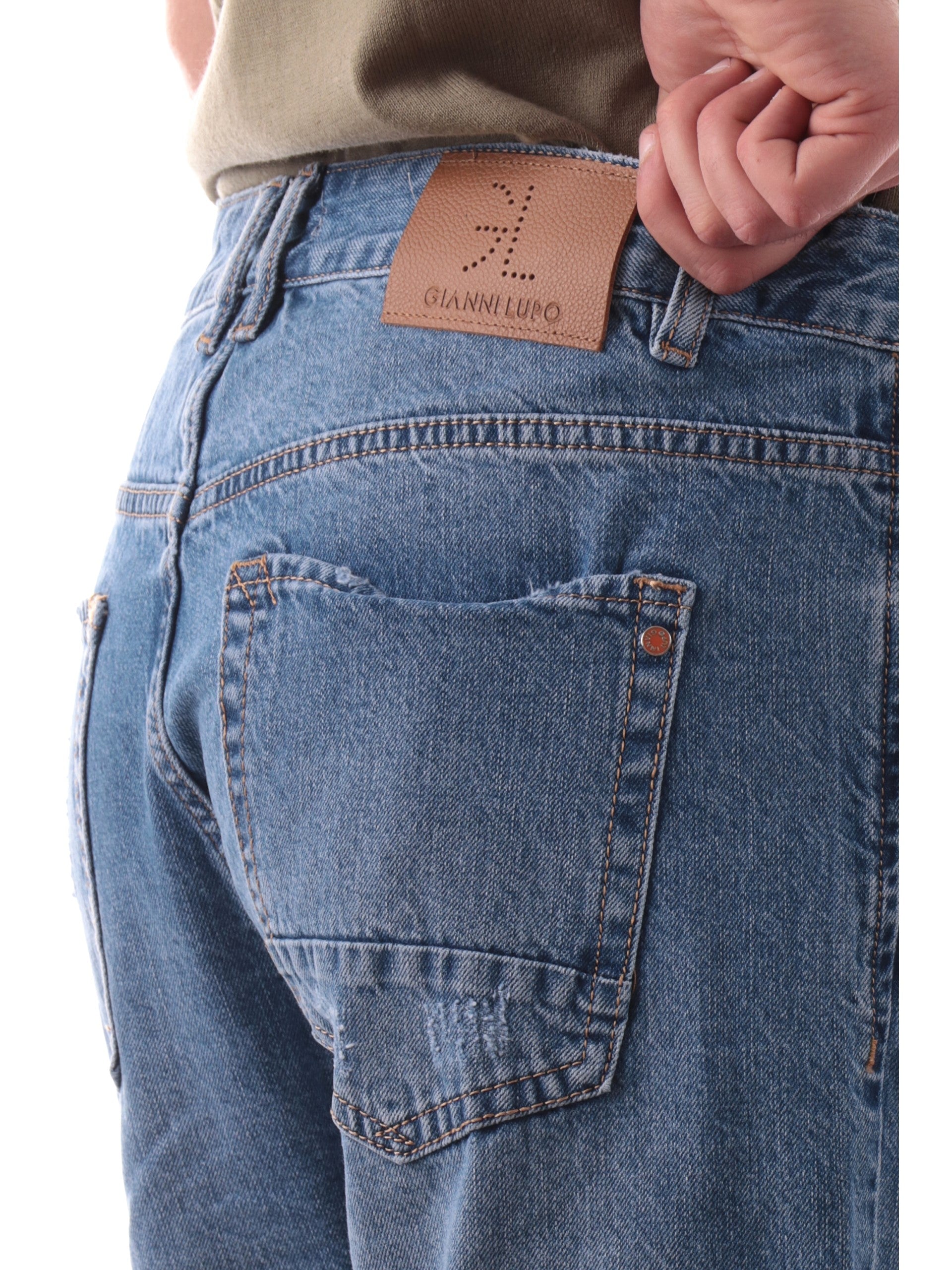 Pantaloncini jeans Gianni Lupo blu da uomo strappati Jack GL6334Q, realizzati in cotone. Questi jeans Gianni Lupo hanno la chiusura con bottone più zip, cinque comode tasche, la predisposizione per indossare la cintura e inserti strappati.