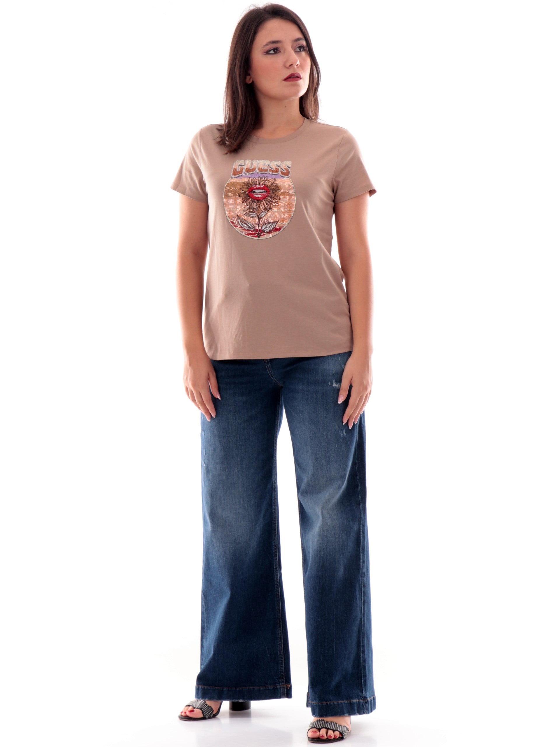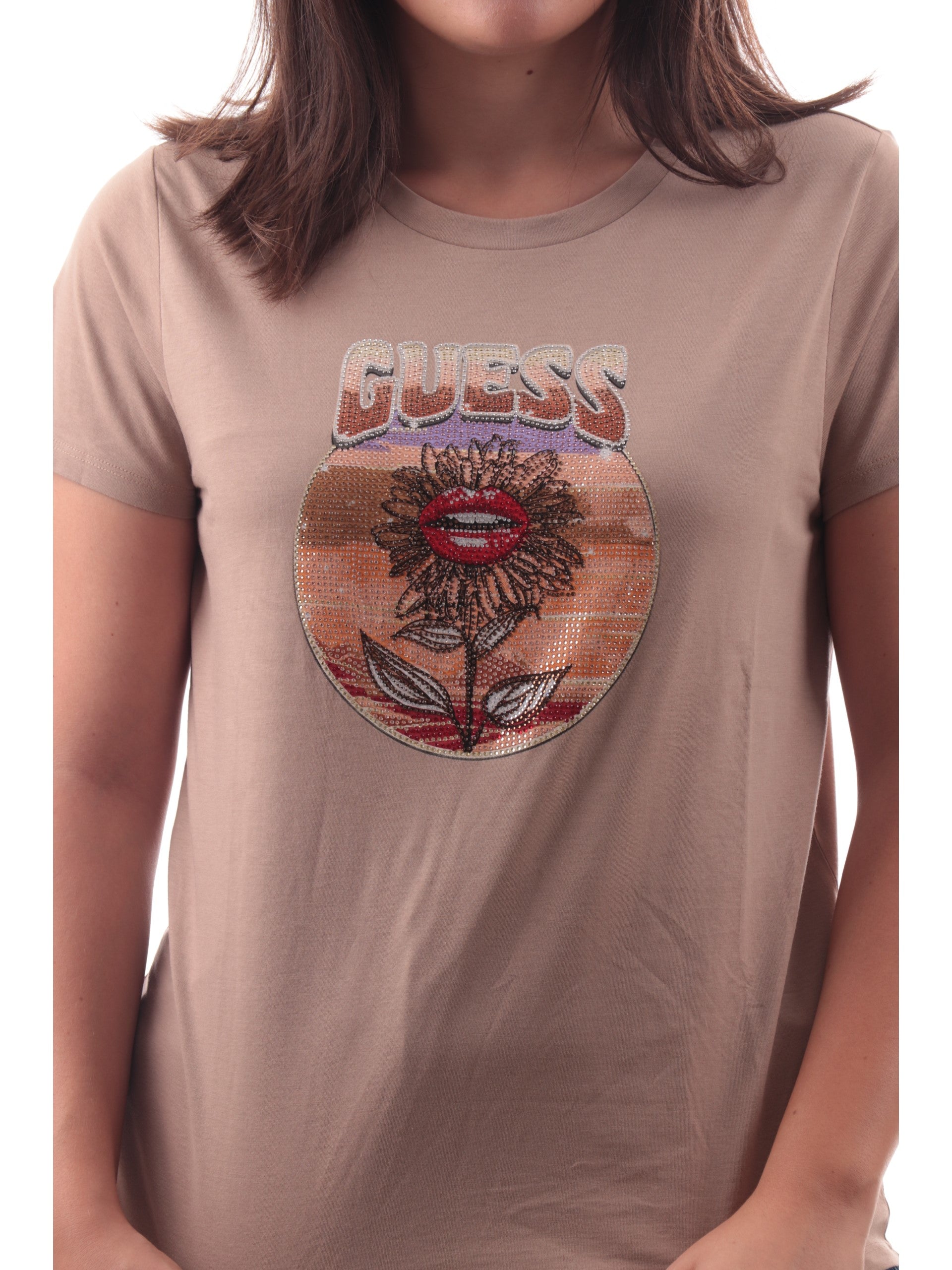 Maglia Guess beige da donna girocollo logo Guess con strass W5YI32K9RM1, realizzata in 100% puro cotone. Questa t-shirt Guess beige girocollo ha le maniche corte, la vestibilità regular e il logo Guess sul davanti con strass.