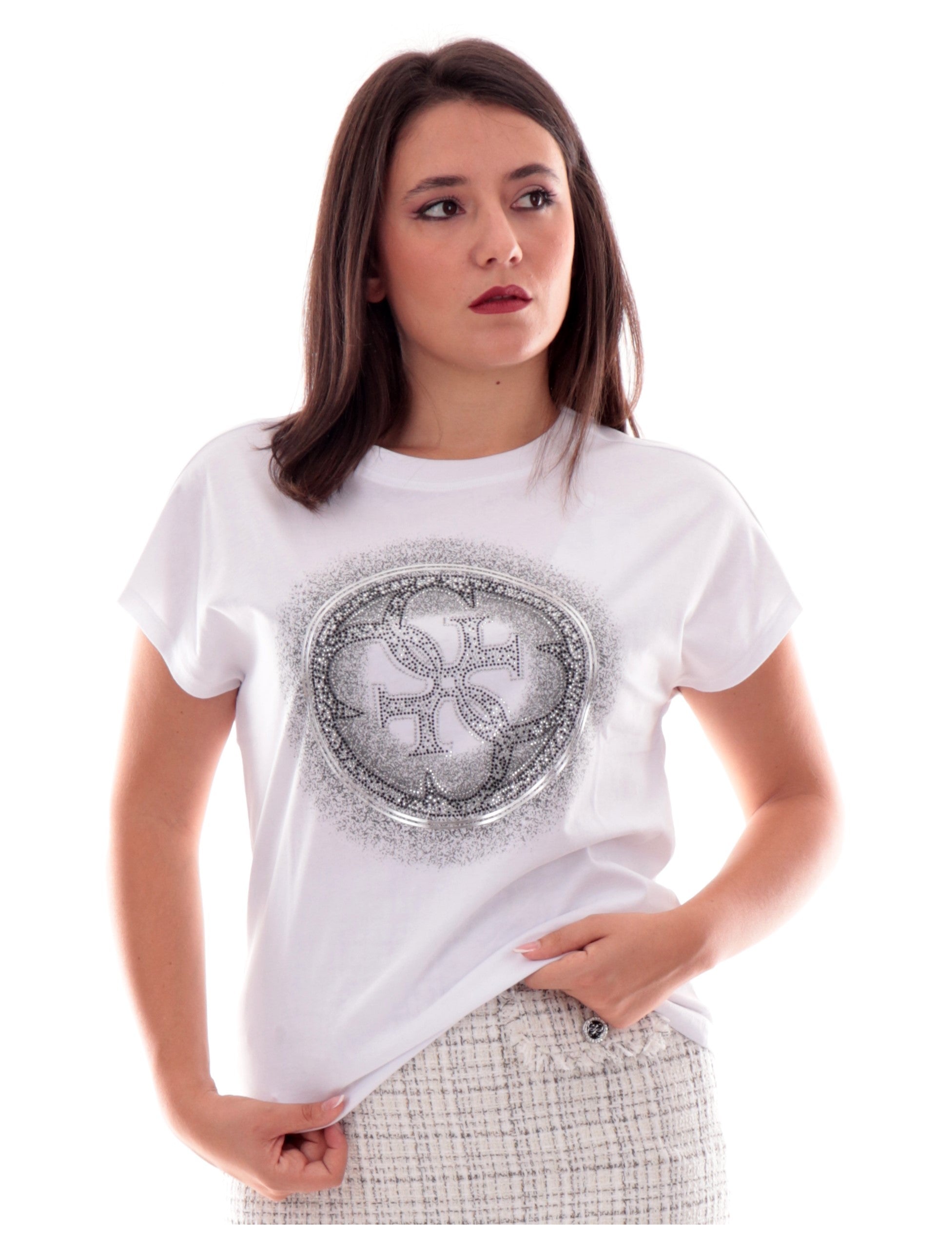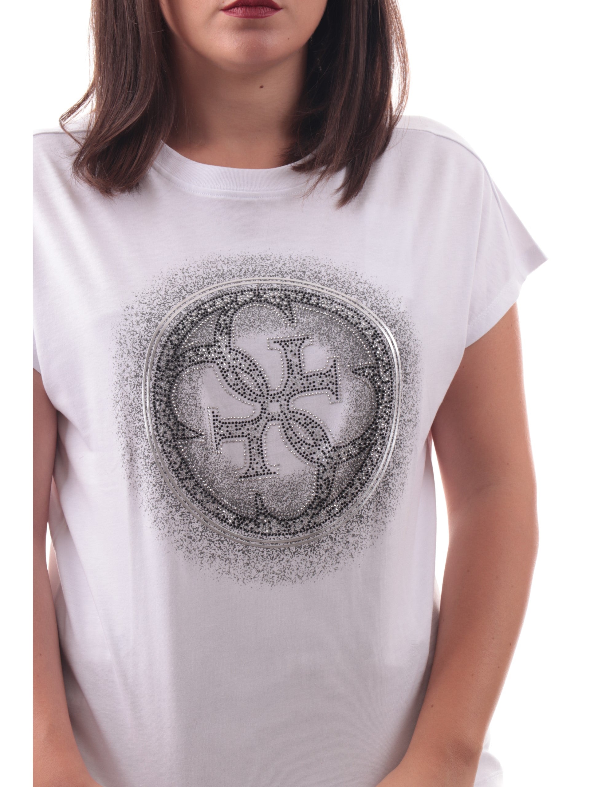 T-shirt Guess bianca da donna girocollo stampa Guess 4G con strass W5YI14I3Z14