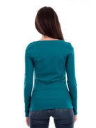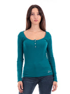 Karlee Jewel women's green Guess sweater W2YP46KBCO2. This green Guess shirt has a crew neck with three jewel button closure, long sleeves, the brand's lettering on the left side bottom with rhinestones and a regular bottom.