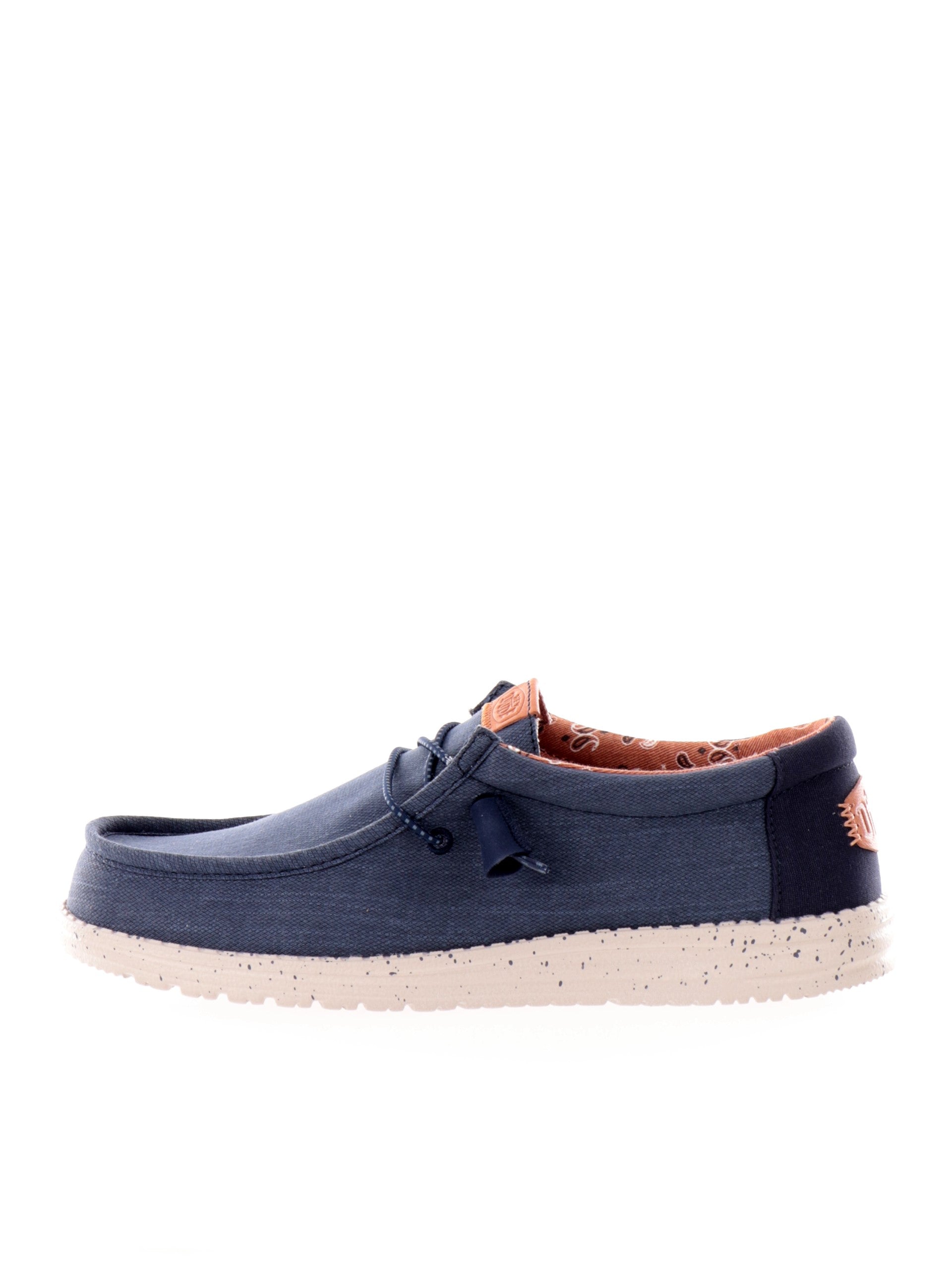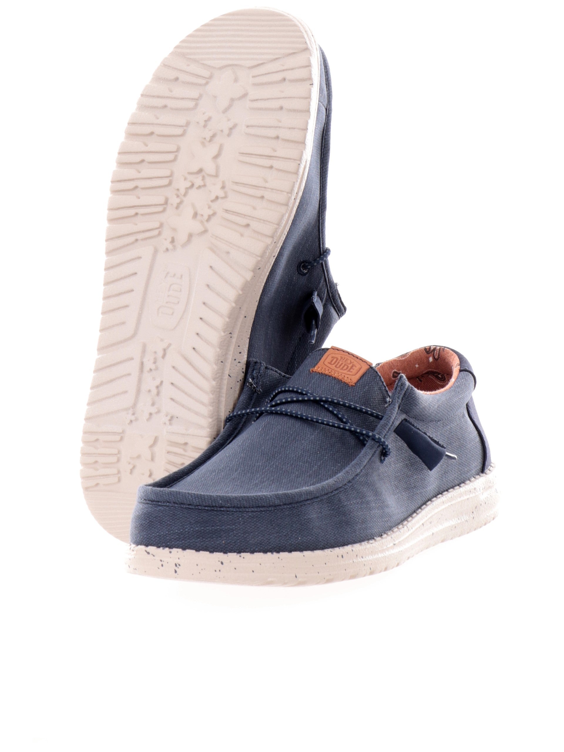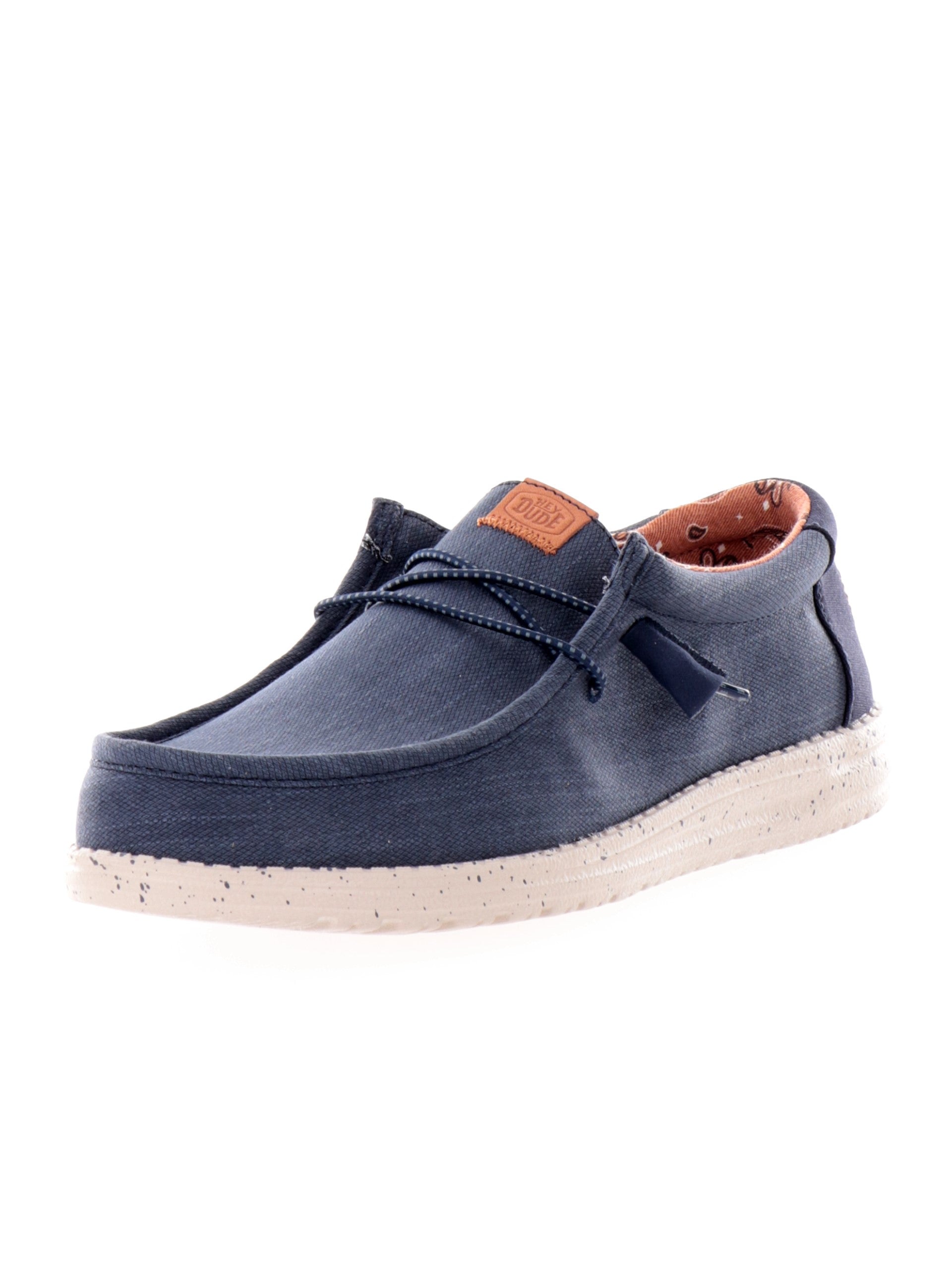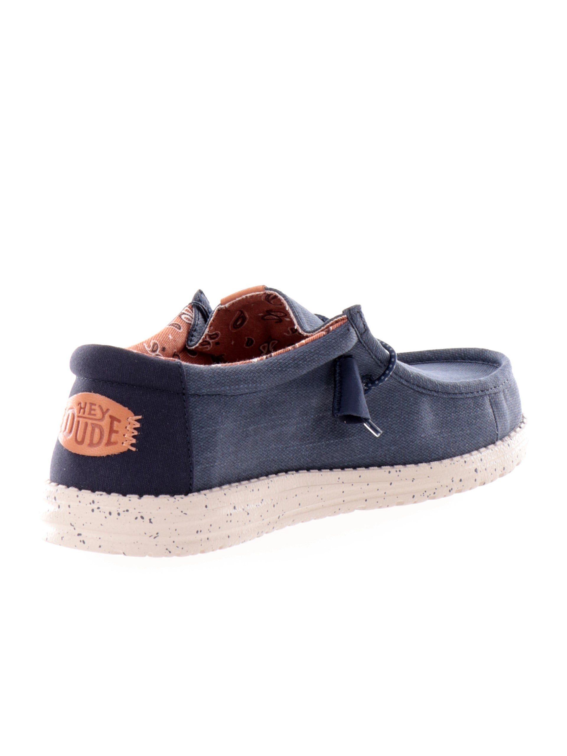 Scarpe Hey Dude blu Wally Washed Canvas da uomo 40296 410. Questi mocassini Hey Dude uomo hanno la tomaia realizzata in tela, la calzata easy-on, lacci e patch Hey Dude applicato sul lato posteriore a contrasto colore.