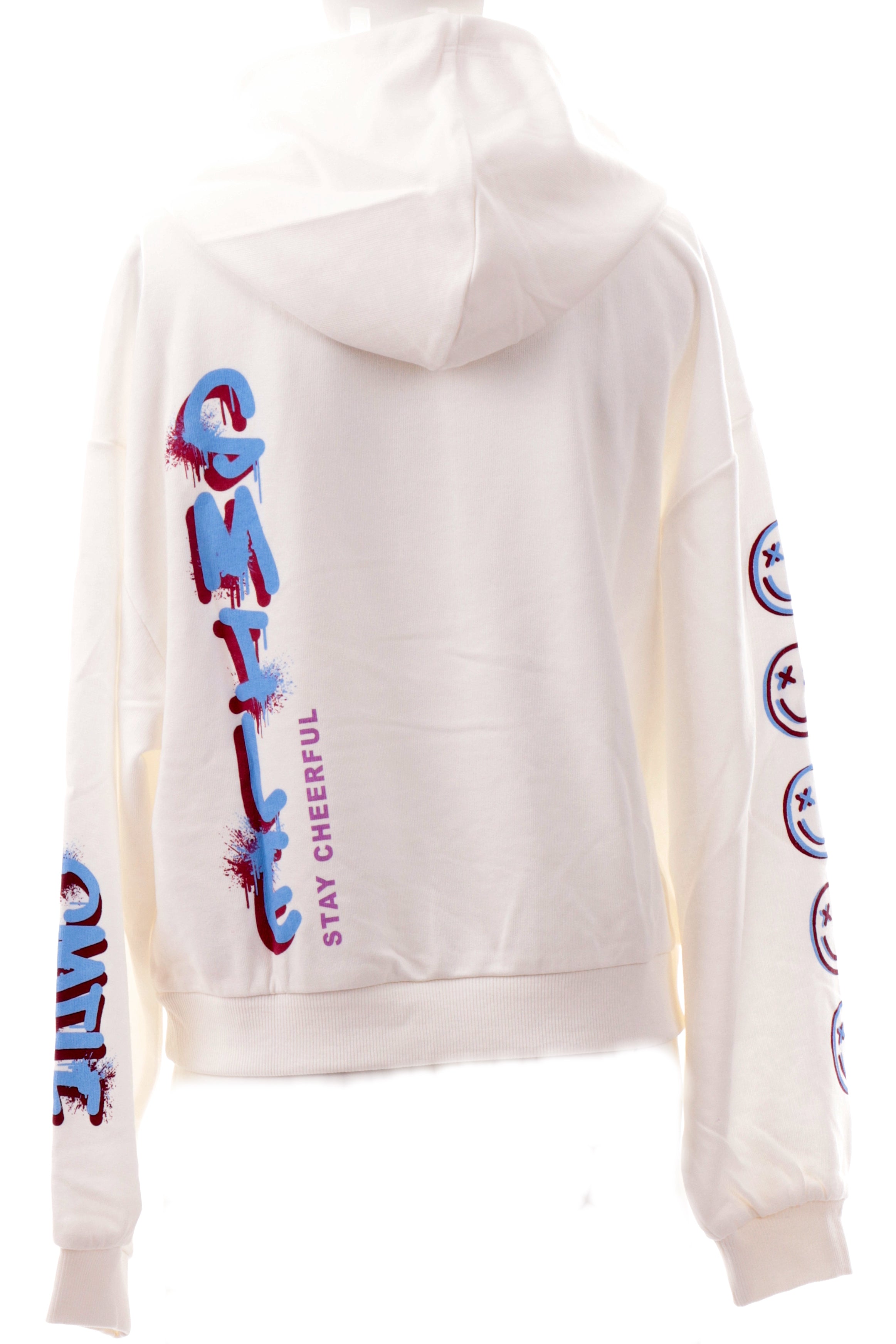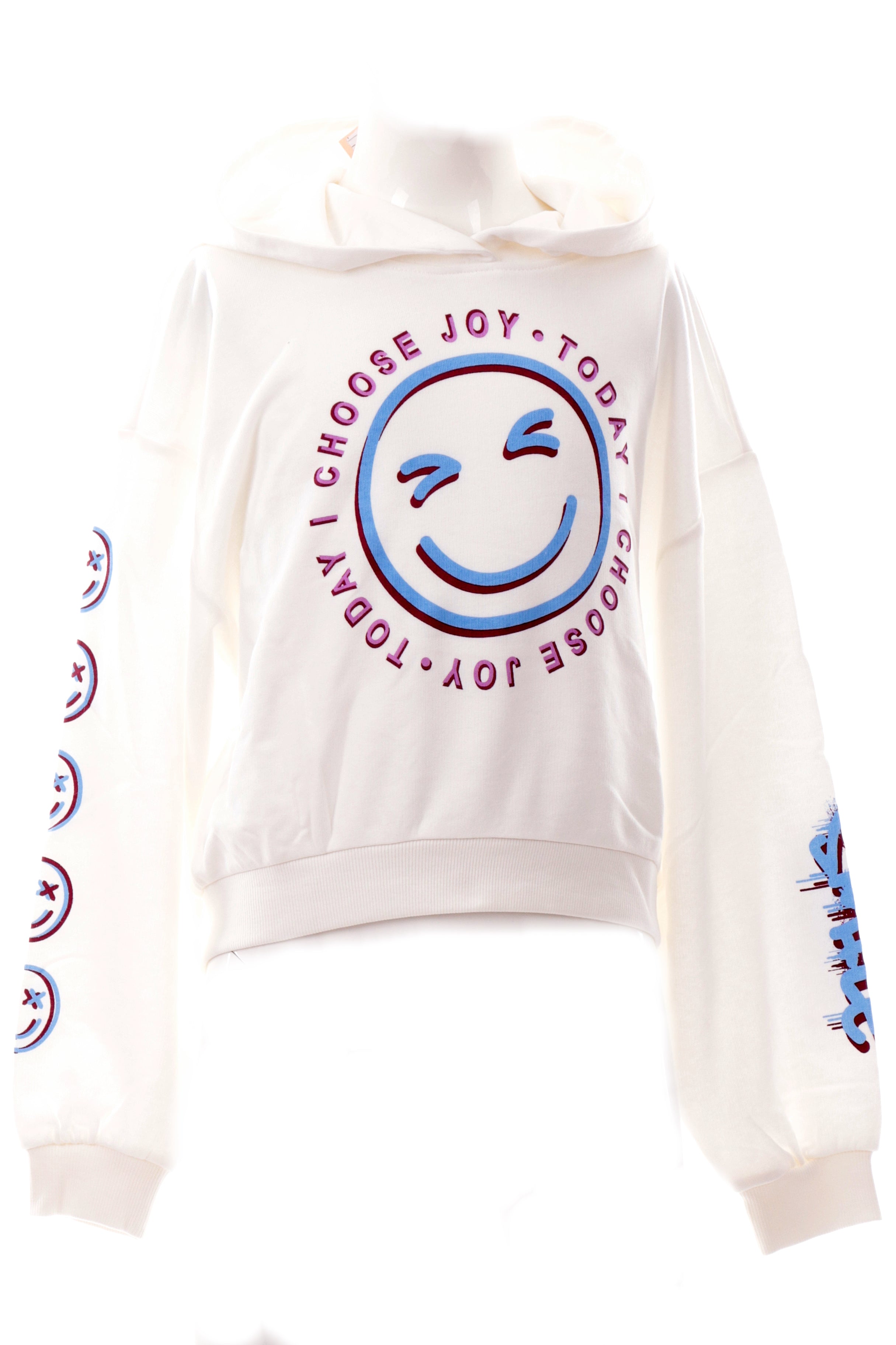 Felpa Only bianca da bambina con cappuccio 15340148, realizzata in cotone. Questa felpa bambina bianca ha il cappuccio fisso, la maxi stampa sul davanti, polsini e fondo elasticizzati.