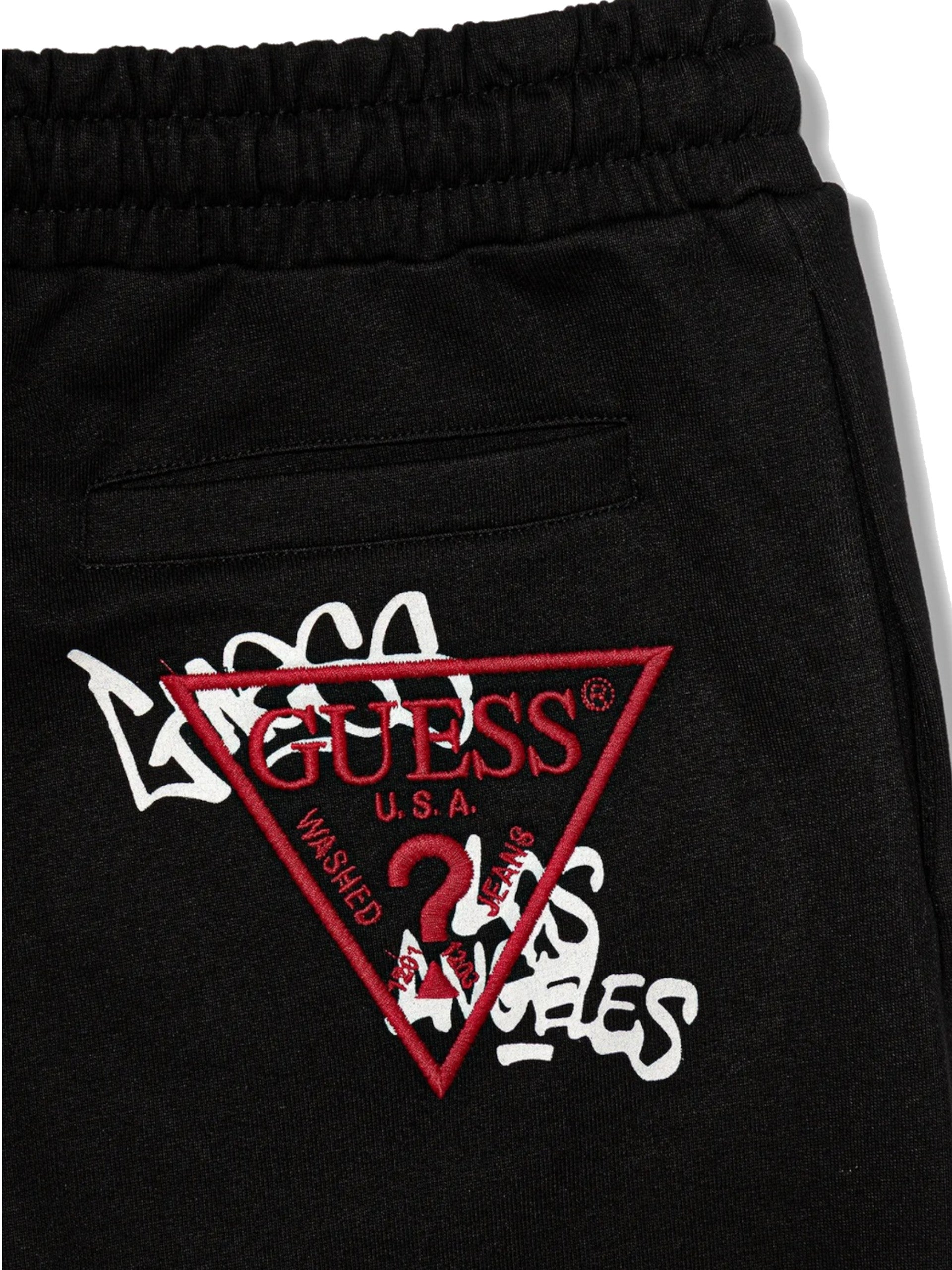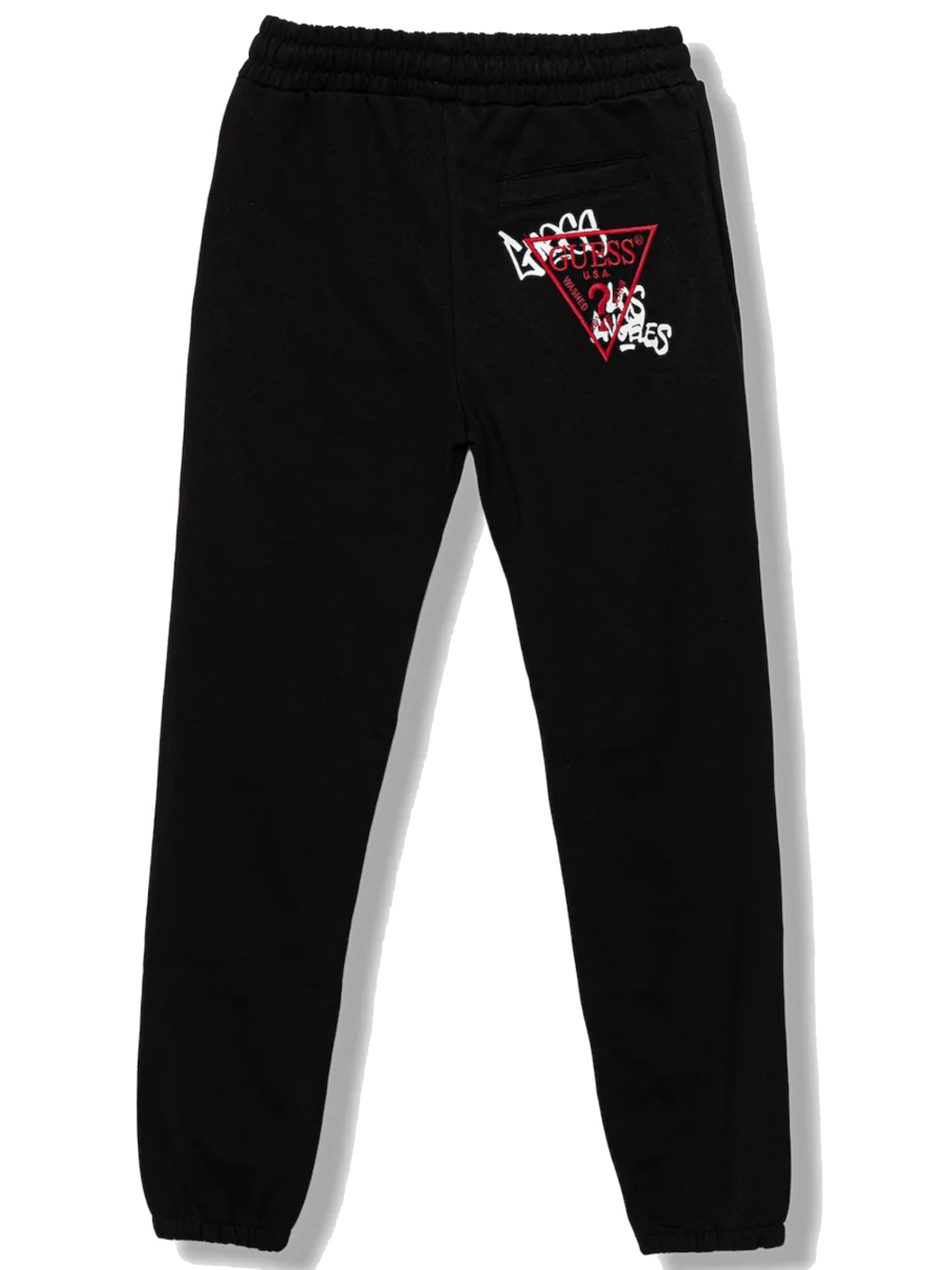 Guess black tracksuit trousers for girls with bands K3YQ13KA6R3, made of 100% pure cotton. These black Guess trousers have an elastic band on the waist, two open side pockets, bands on both sides and the brand logo on the left side in a contrasting colour.