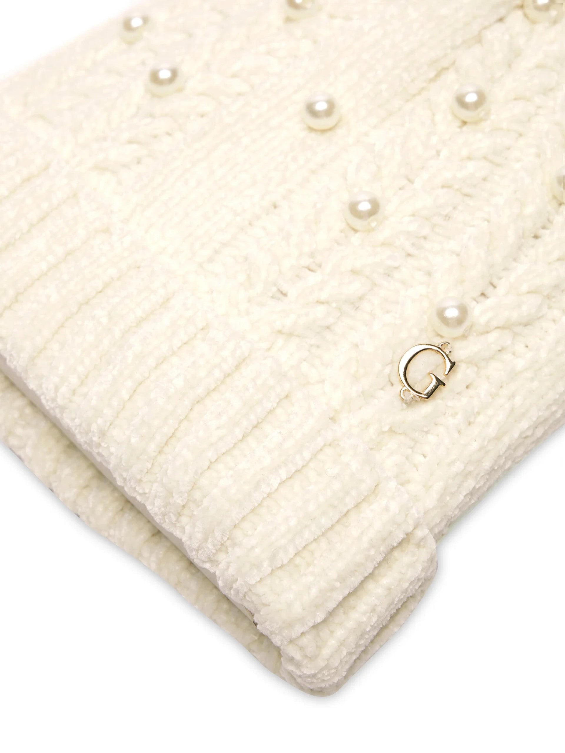 Cappello Guess da donna bianco con perle e pompon. Questo cappello Guess è stato realizzato in ciniglia, dalla fantasia a treccia con perline all over e con pompon