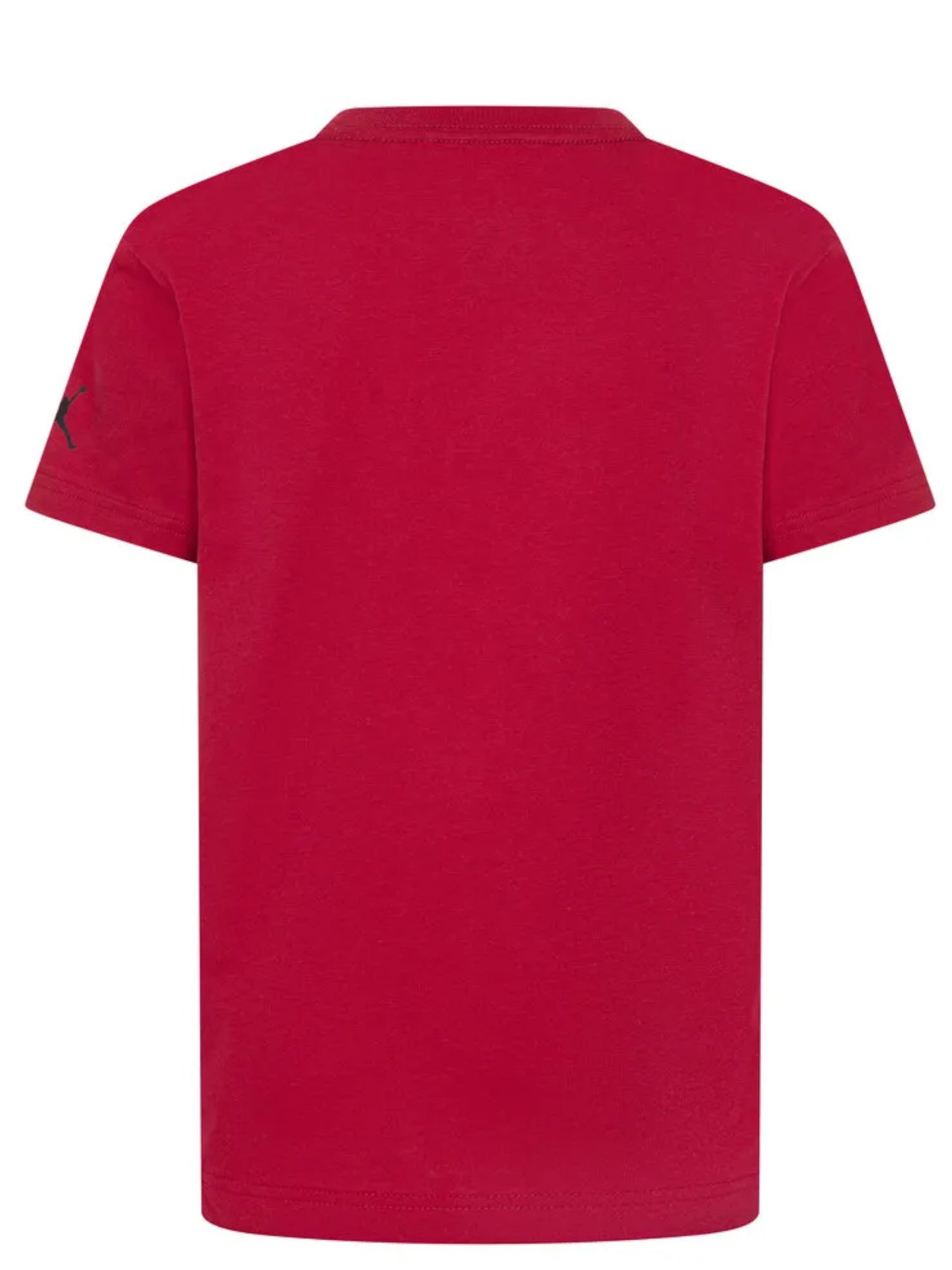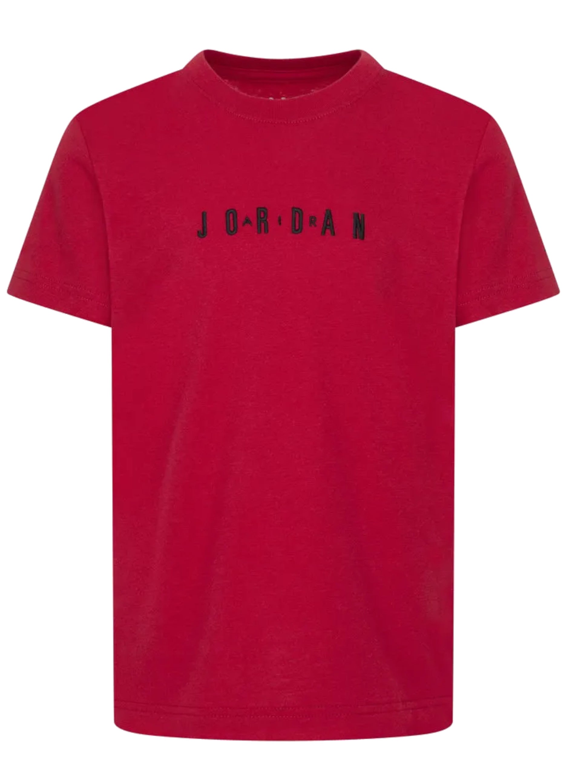 Maglia Jordan rossa da bambino logo Air Jordan ricamato 95D634, realizzata in cotone. Questa t-shirt Jordan rossa girocollo ha le maniche corte e il logo Air Jordan ricamato sul davanti.