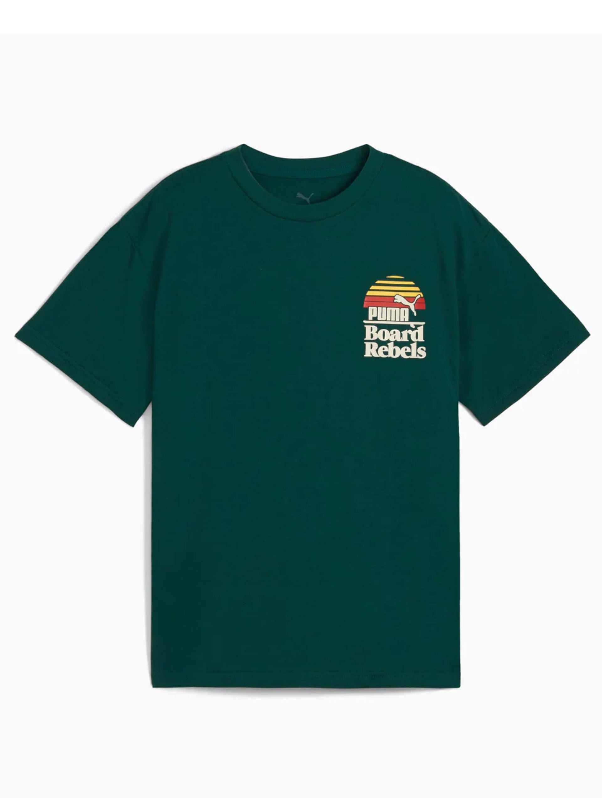 Maglia Puma verde da bambino maxi stampa posteriore 685153, realizzata in 100% puro cotone. Questa t-shirt Puma verde girocollo ha le maniche corte e la maxi stampa sul lato posteriore.