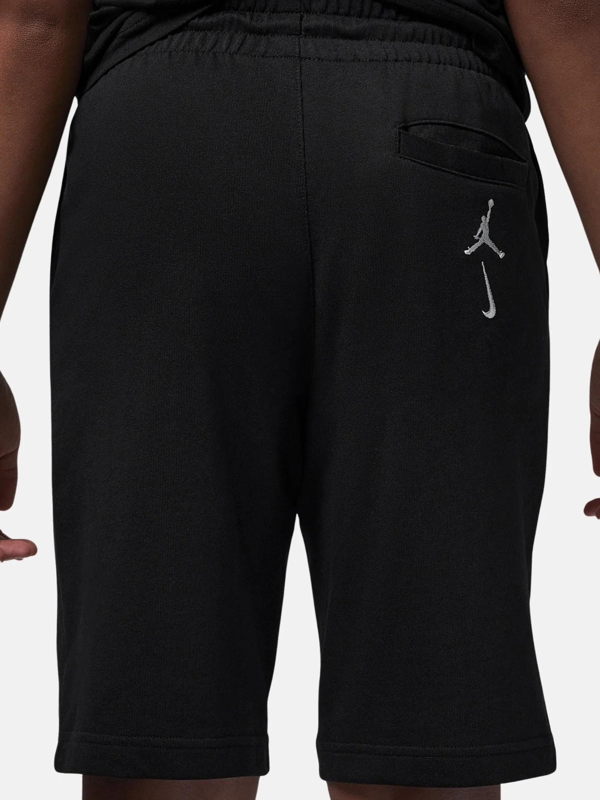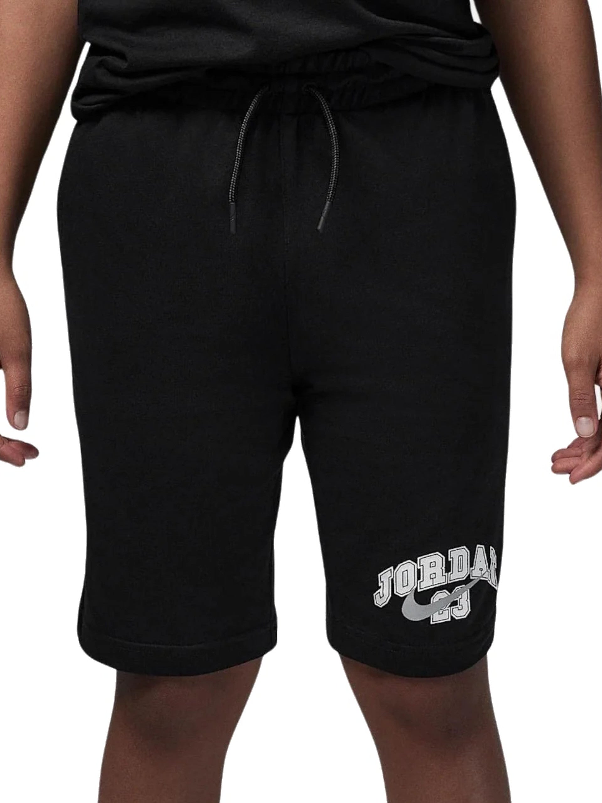 Pantaloncini Jordan neri da bambino con stampa 95F051, realizzati in cotone. Questi bermuda Jordan bambino hanno la banda elastica sul punto vita regolabile con laccetti, due tasche laterali aperte, una tasca posteriore con logo ricamato e la stampa sul davanti.