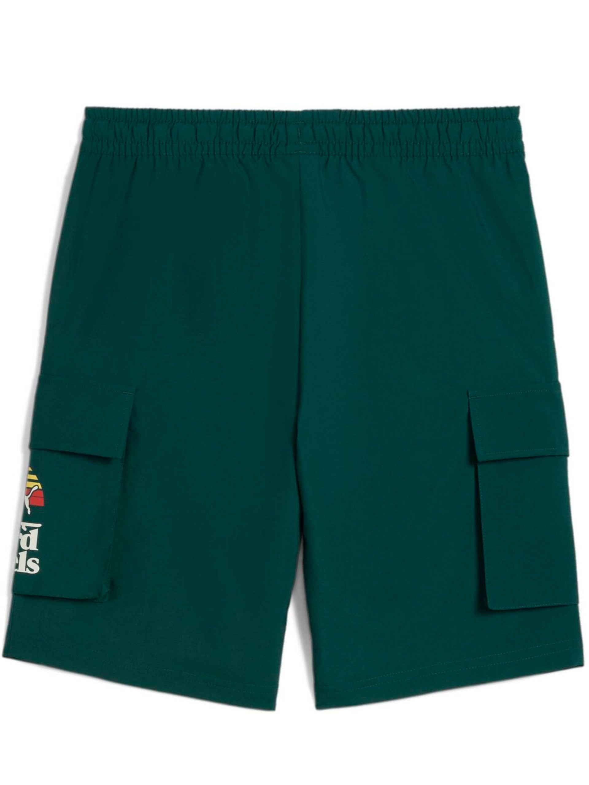 Pantaloncini Puma cargo verdi da bambino tessuto tecnico 685154. Questi bermuda Puma verdi hanno la banda elastica sul punto vita regolabile con laccetti, due tasche laterali aperte e due tasconi cargo con stampa logo.