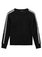Felpa Guess a costine nera bambina. Questa felpa Guess a costine girocollo è caratterizzata da due righe bianche in etrambi lati delle maniche e la scritta Guess ricamata bianca, con i polsini e fondo elasticizzati. Questa felpa Guess è realizzata da un tessuto morbido e caldo