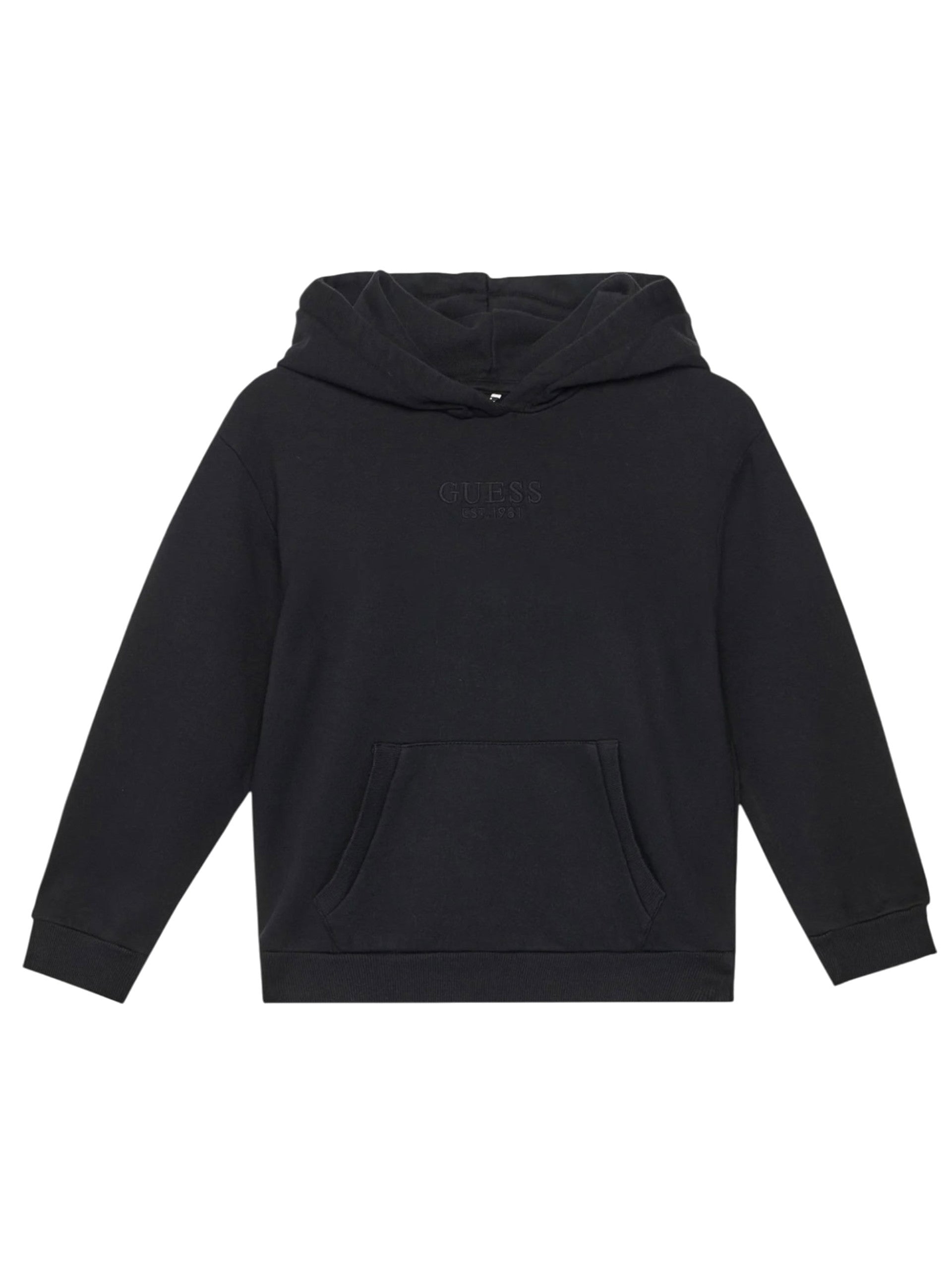 Felpa Guess nera da bambino con cappuccio e tasche a marsupio sul davanti. Questa felpa Guess bambino è realizzata in morbido cotone con logo Guess ricamato sul davanti tono su tono.