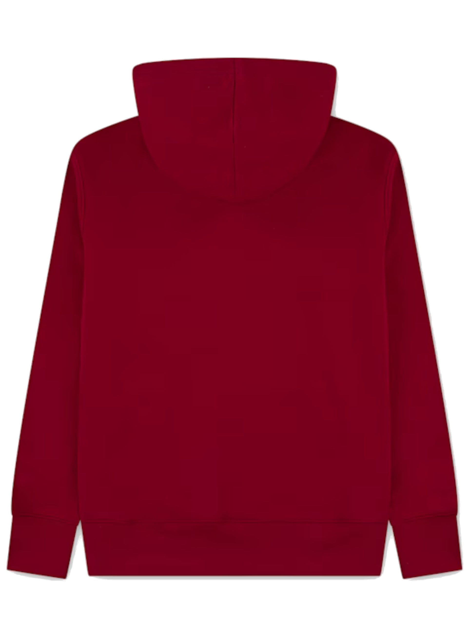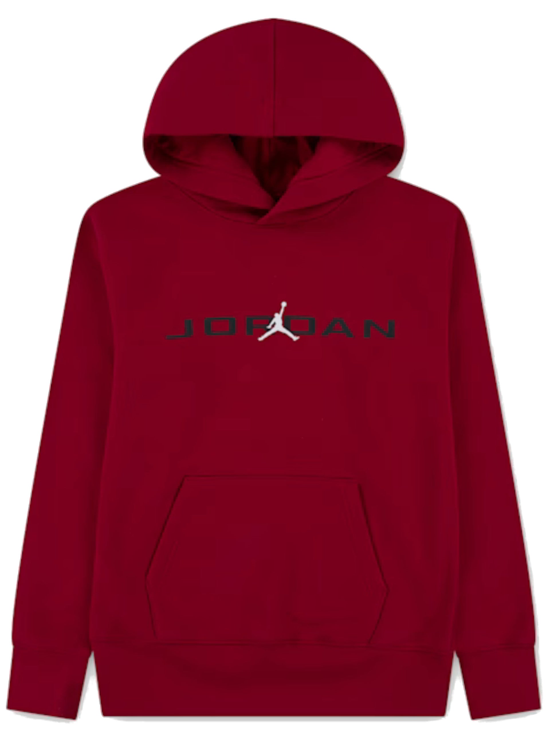 Felpa Jordan rossa da bambino con cappuccio stampa logo 95D665, realizzata in cotone felpato. Questo felpa bambino Jordan ha il cappuccio fisso, una comoda tasca a marsupio, la maxi stampa logo sul davanti, polsini e fondo elasticizzati.