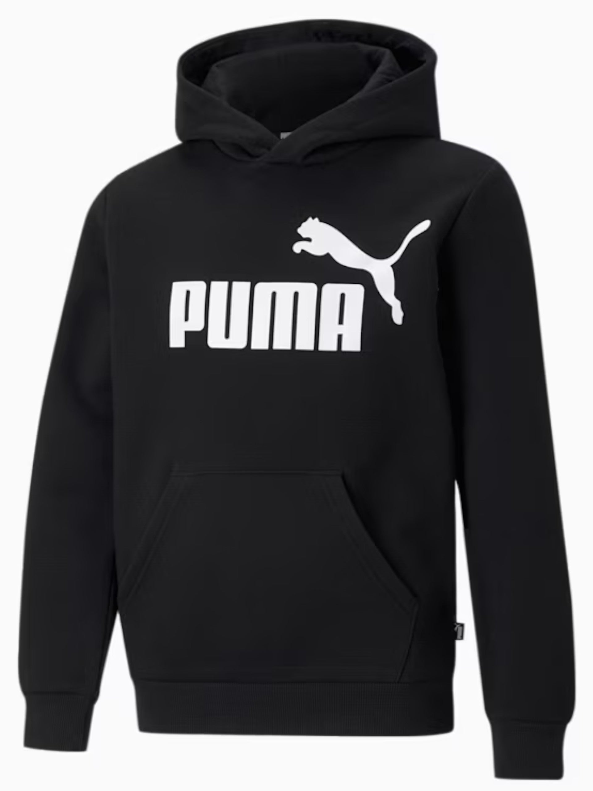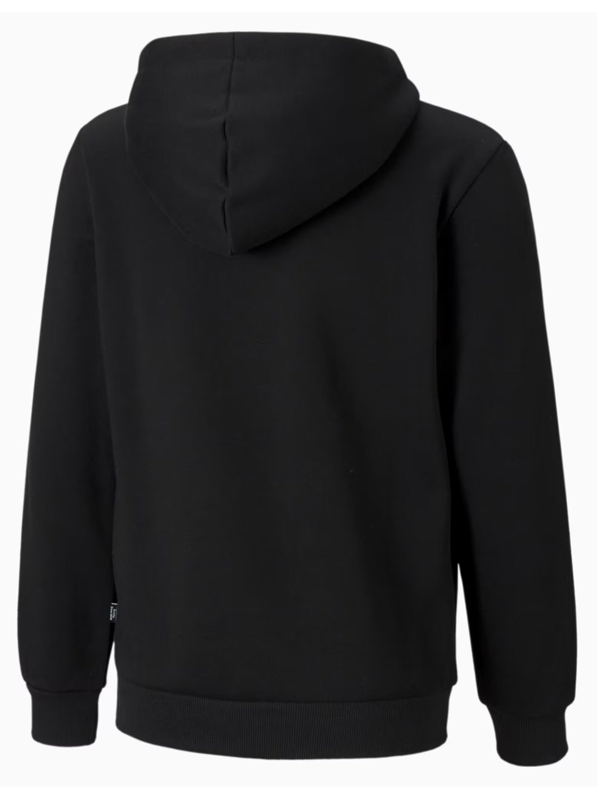 Felpa Puma nera da bambino con logo 586965, realizzata in morbido cotone. Questa felpa Puma nera ha il cappuccio fisso, le maniche lunghe con polsini elasticizzati, una comoda tasca a marsupio e la maxi stampa del brand sul davanti a contrasto colore.