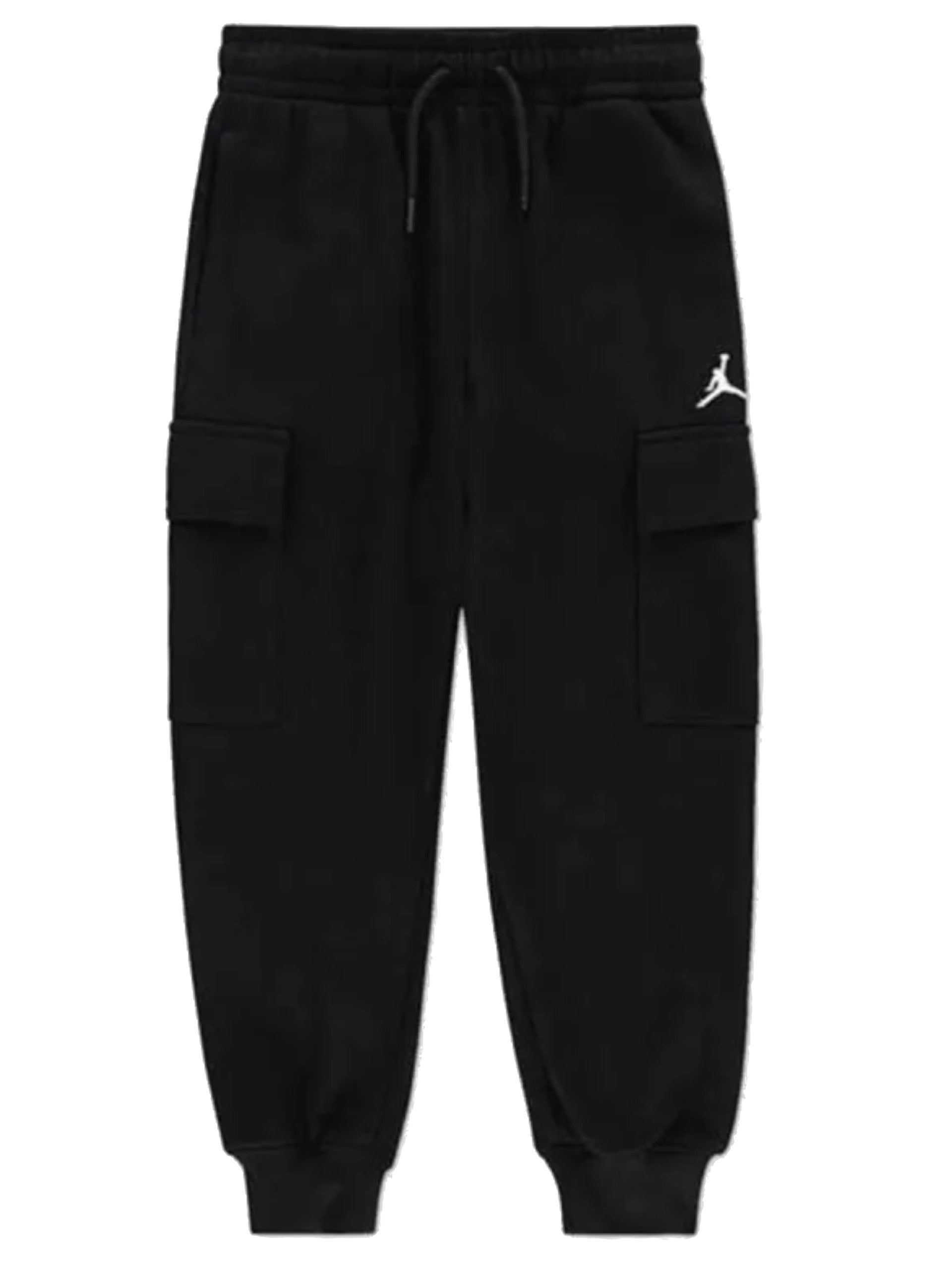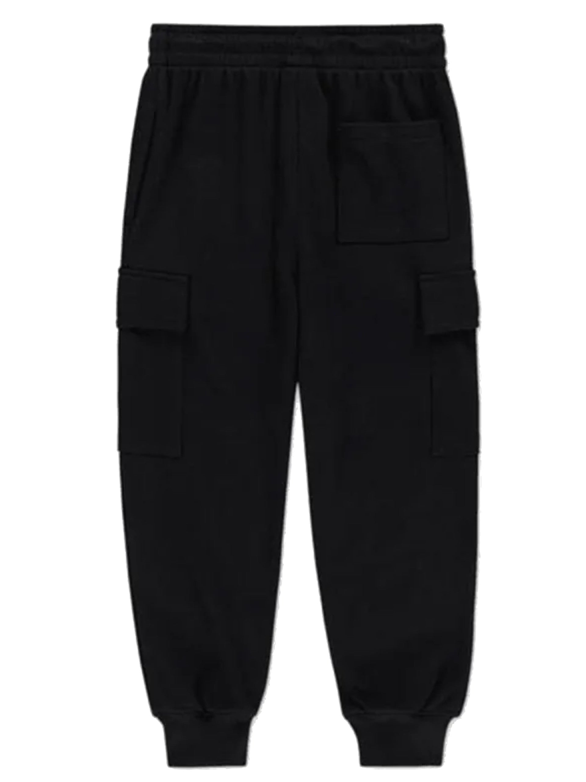Pantaloni tuta cargo Jordan neri da bambino. Questi pantaloni Jordan neri sono caratterizzati da tre tasche, due laterali e una dietro, il logo sul lato sinistro, regolabili con i laccetti e polsini elasticizzati