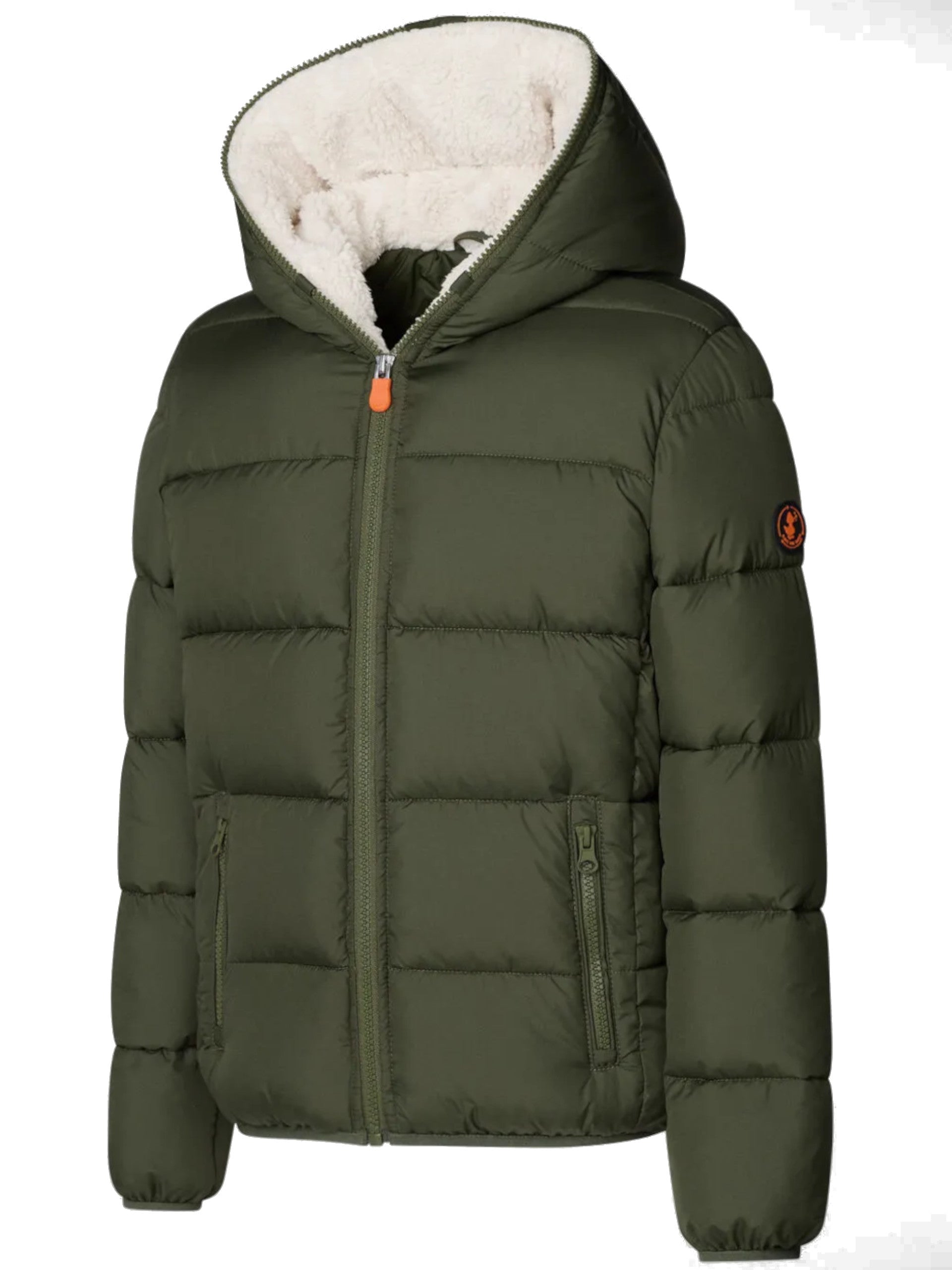 Giubbino Save the duck verde militare con pile interno. Questo piumino bambino verde Save the duck con cappuccio e tasche con cerniera. Questo piumino verde militare da bambino è realizzato con imbottitura eco friendly e caldo pile.