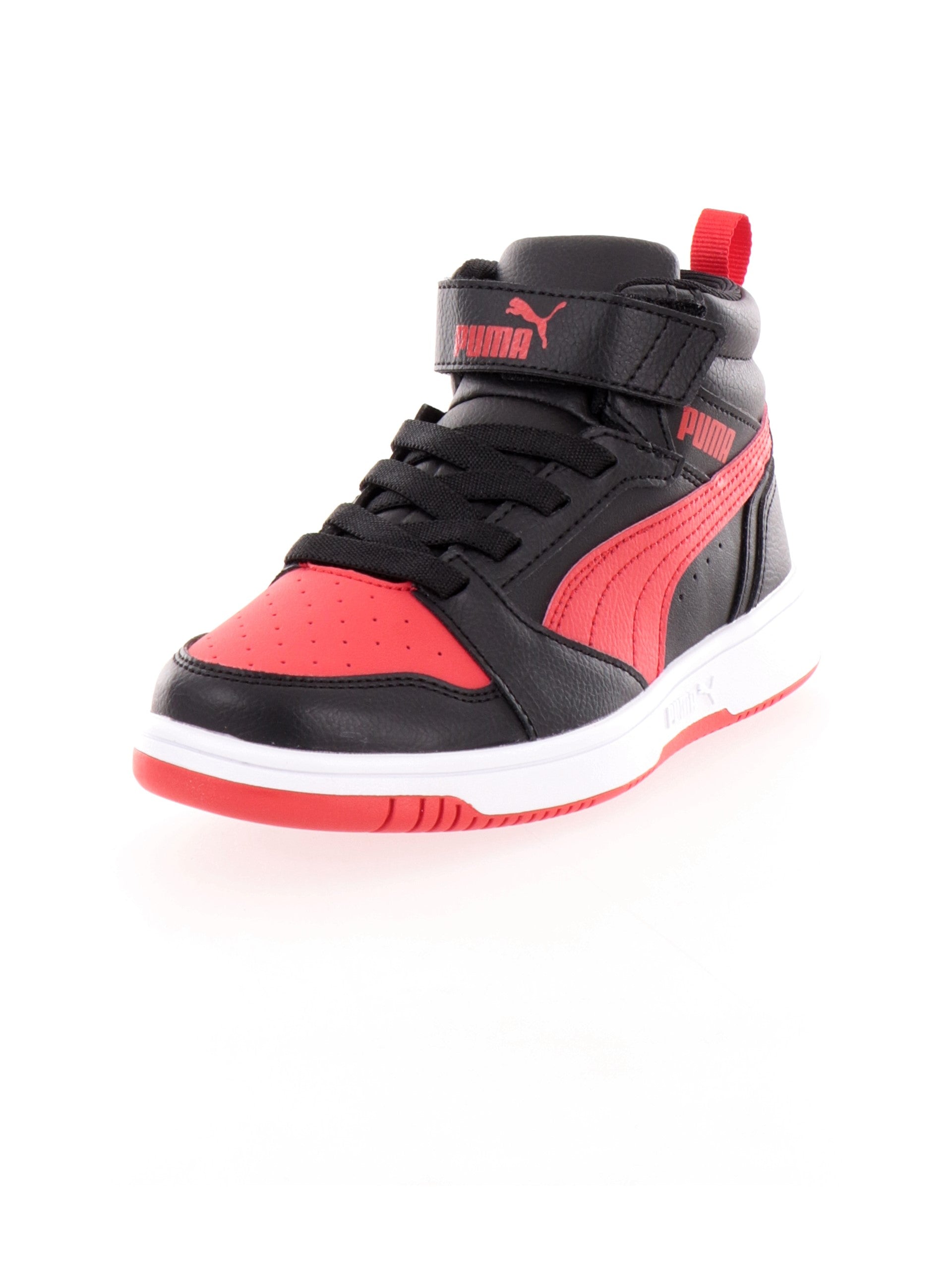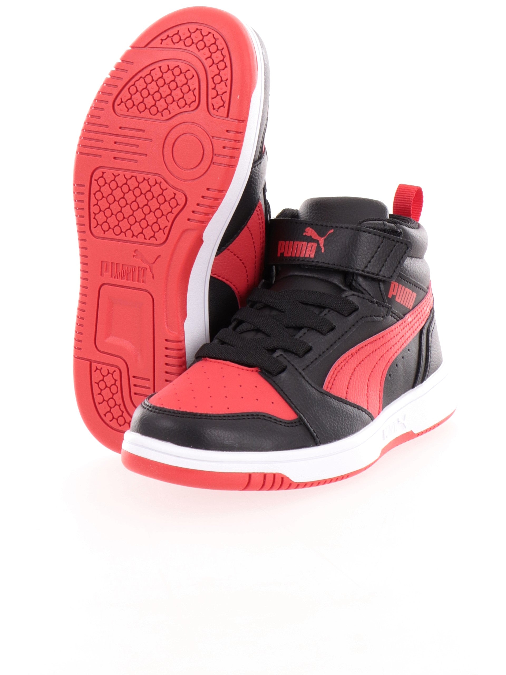 Scarpe Puma nere e rosse da bambino Rebound V6 Mid AC+ PS 393832. Queste snekers Puma nere a collo alto hanno la tomaia in mesh e la suola in gomma rinforzata per il massimo comfort. Sul davanti di queste Puma troviamo la chiusura con velcro, i fori per far traspirare la scarpe, la linguetta posteriore che agevola l'entrata del piede e il logo del brand a contrasto colore.