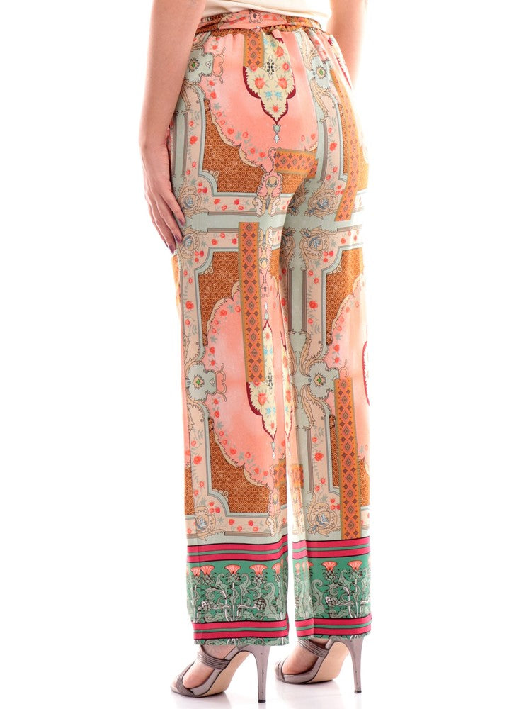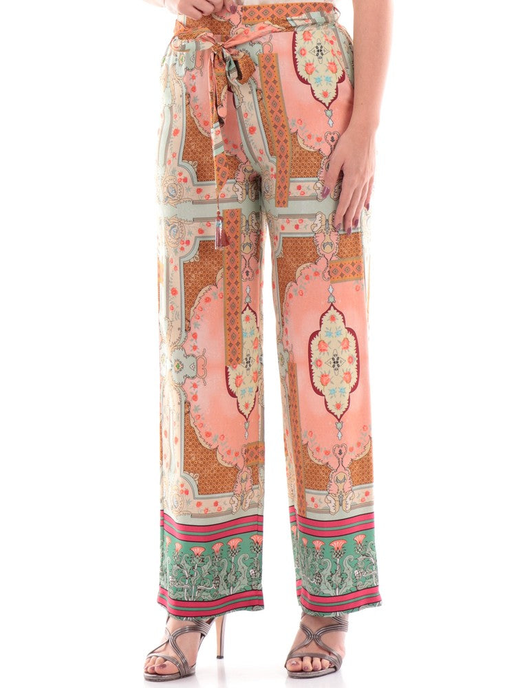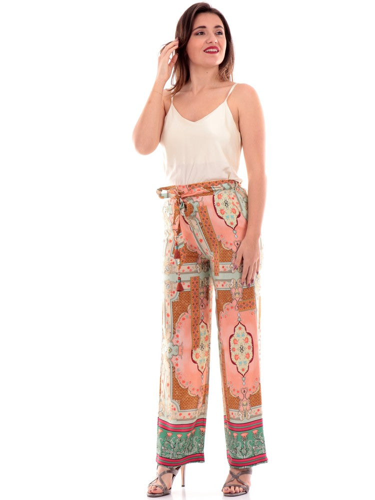 Wu'Side beige women's scarf pattern trousers 23769, made of 100% viscose. These beige Wu Side trousers have an elastic band on the waist, a removable belt, two open side pockets with an oblique cut, an all-over scarf pattern and a flared bottom.