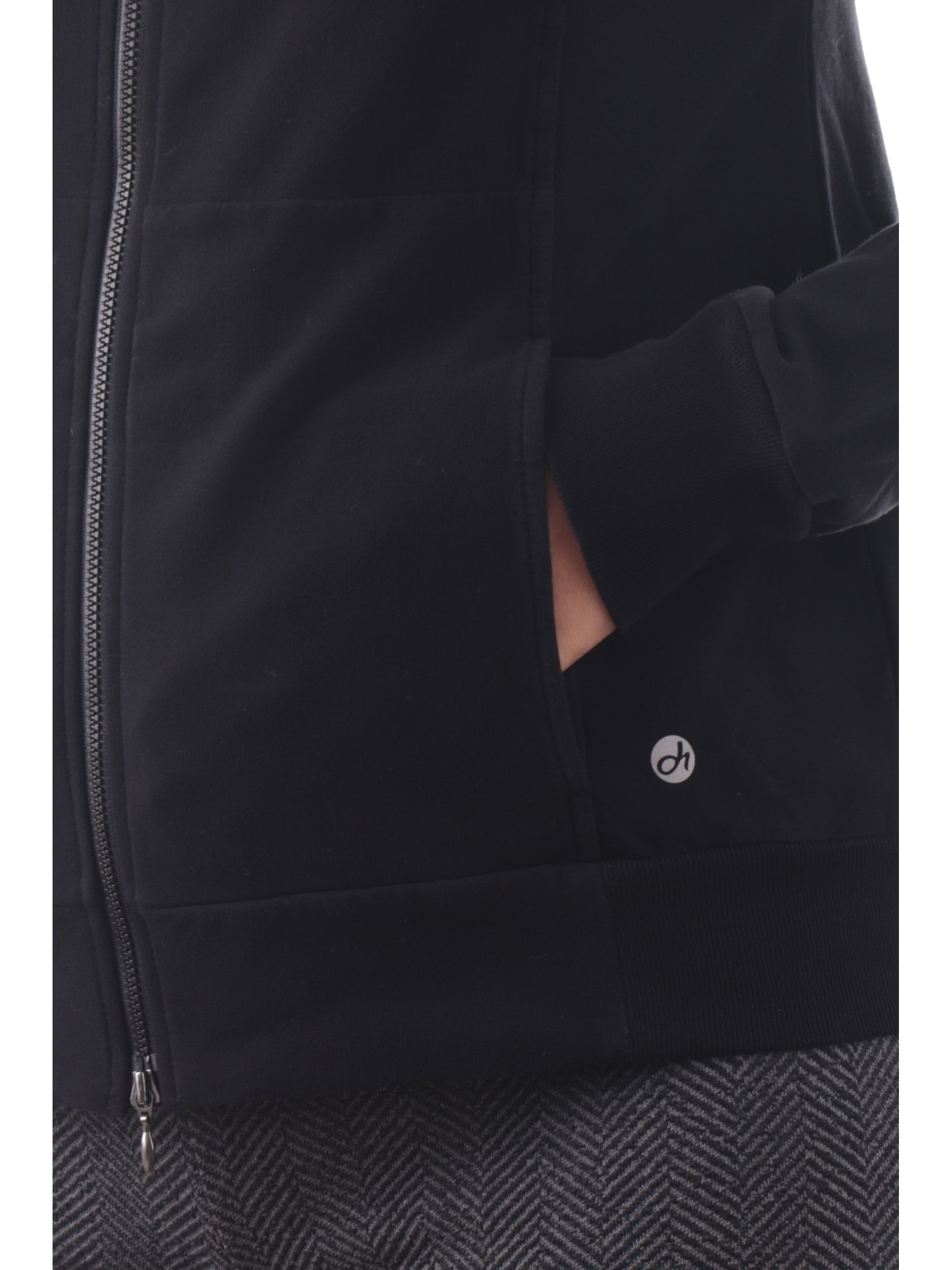 Felpa nera Deha con cappuccio da donna. Questa felpa nera Deha realizzata in cotone è caratterizzata da un cappuccio regolabile con lacci, chiusura centrale full zip con doppio cursore, due tasche laterali aperte, polsini e fondo elasticizzati a costine. Questa felpa con cappuccio grazie alla sua versalità è un Must-have comodo e adatto sia per i momenti di attività fisica sia da tutti i giorni.