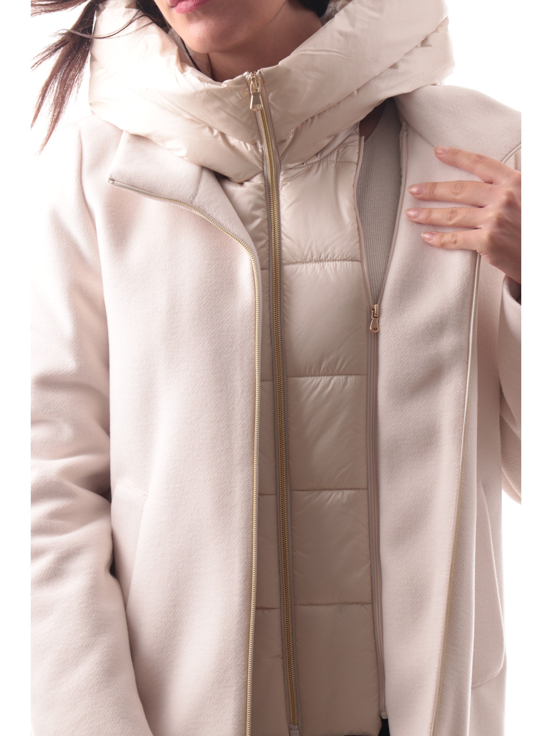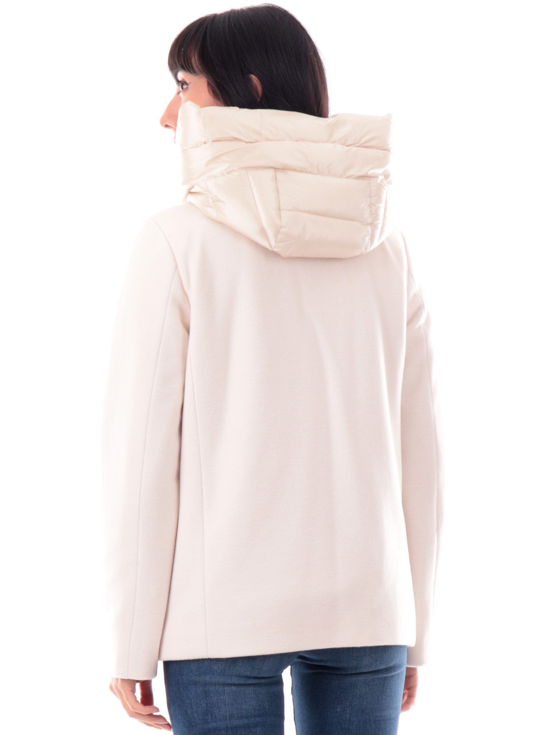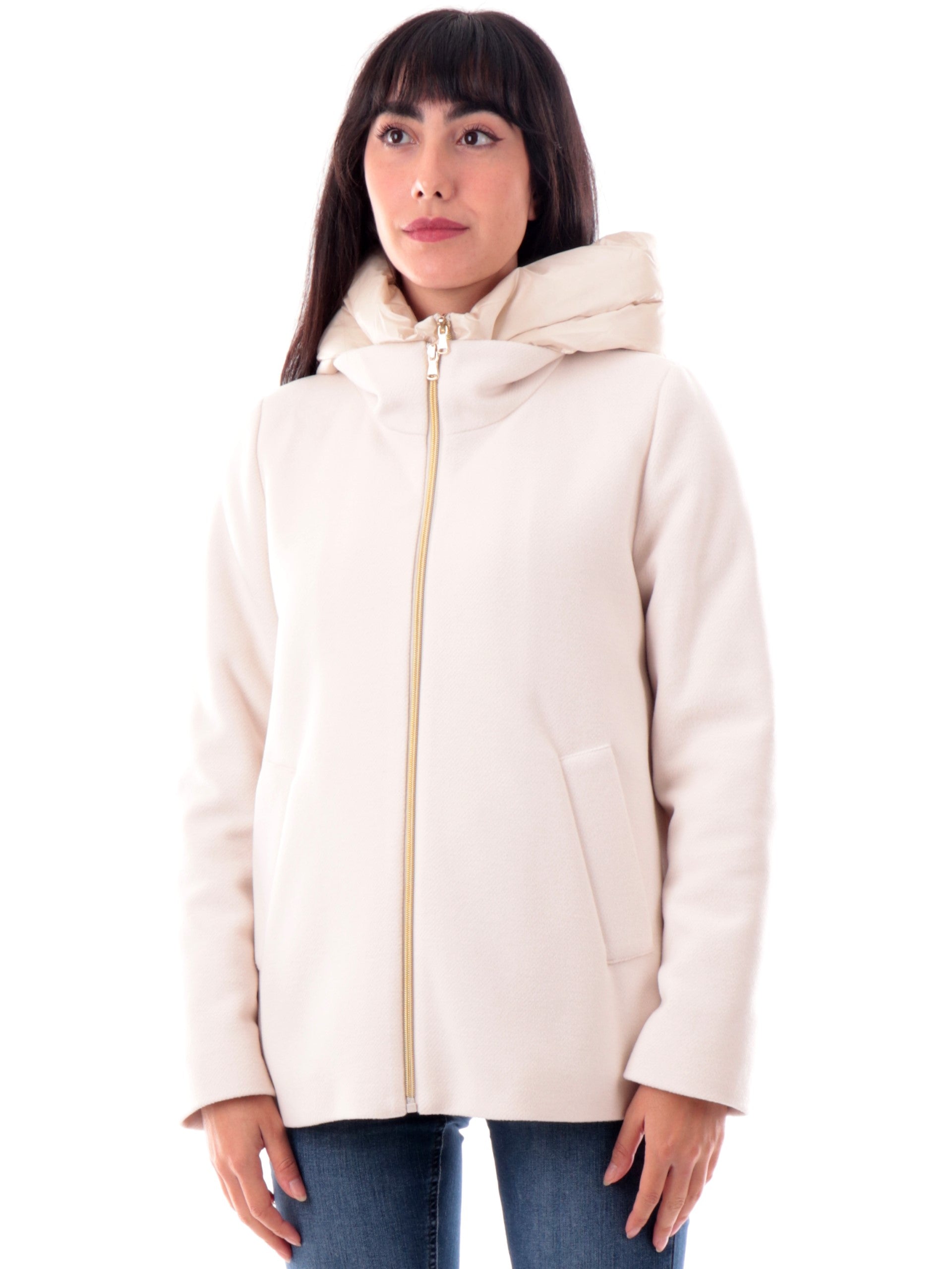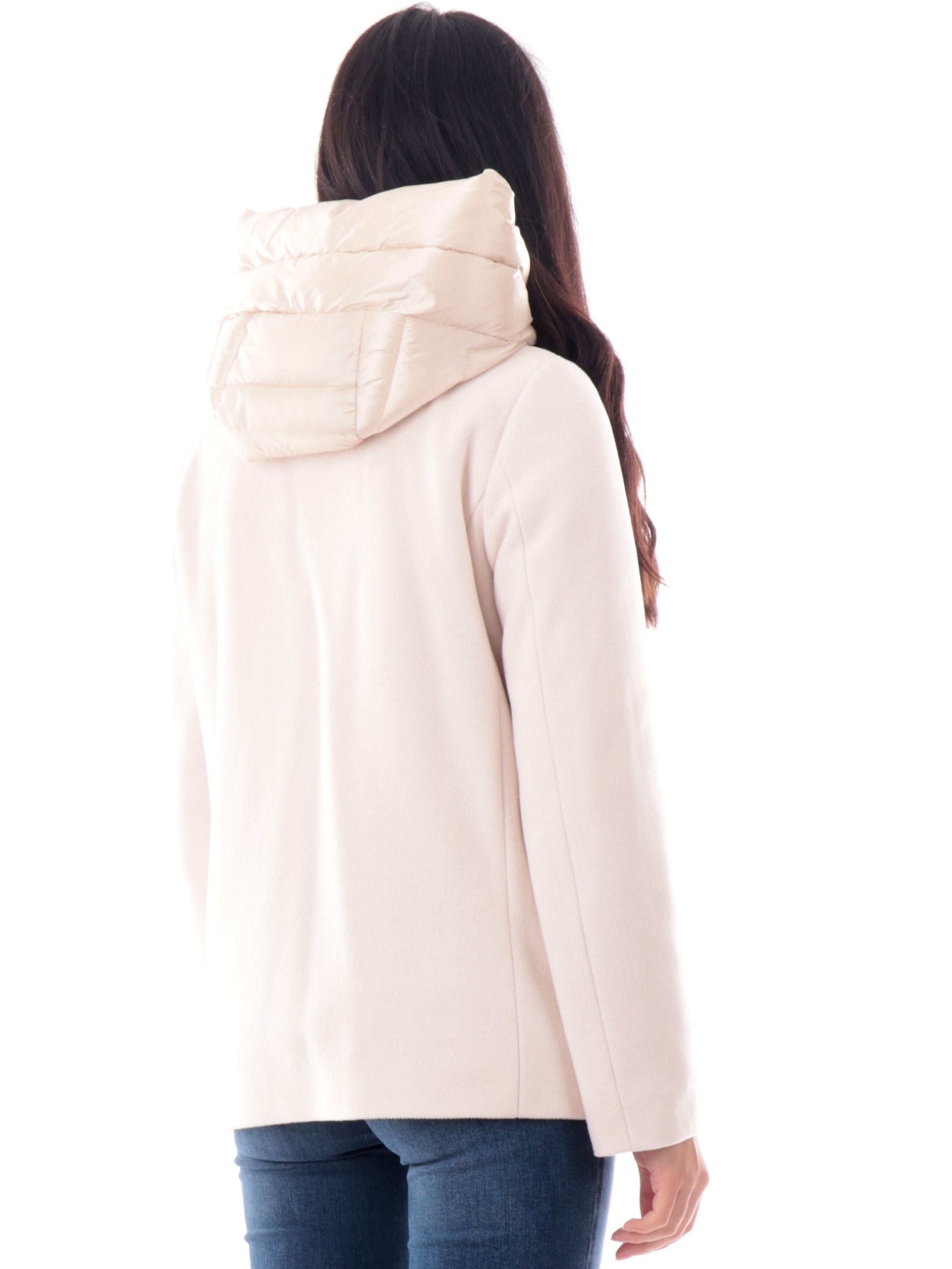 Giacca Emme Marella bianca da donna con finto gilet removibile SORRISO, realizzata con imbottitura eco-friendly. Questo giubbino Marella bianco ha un finto gilet interno removibile (rimuovendolo verrà tolto anche il cappuccio), la chiusura full zip centrale, due tasche laterali aperte e il fondo regolare.
