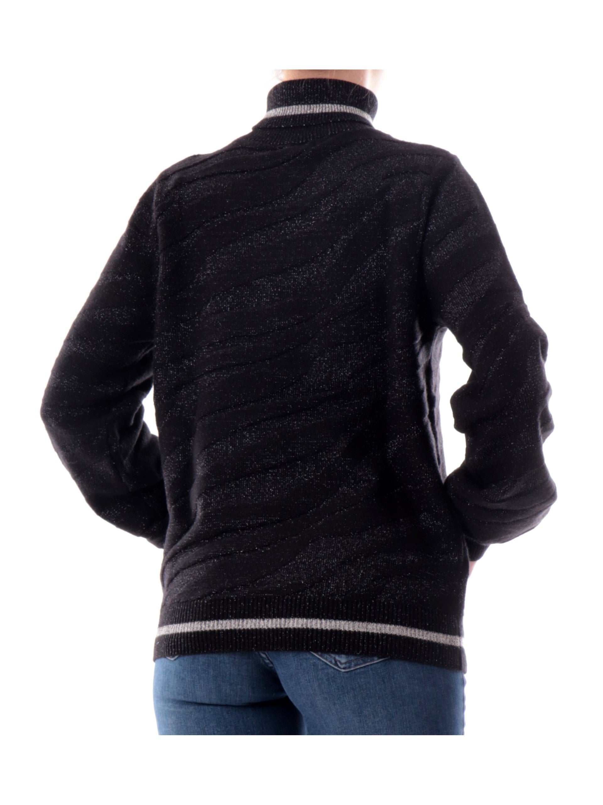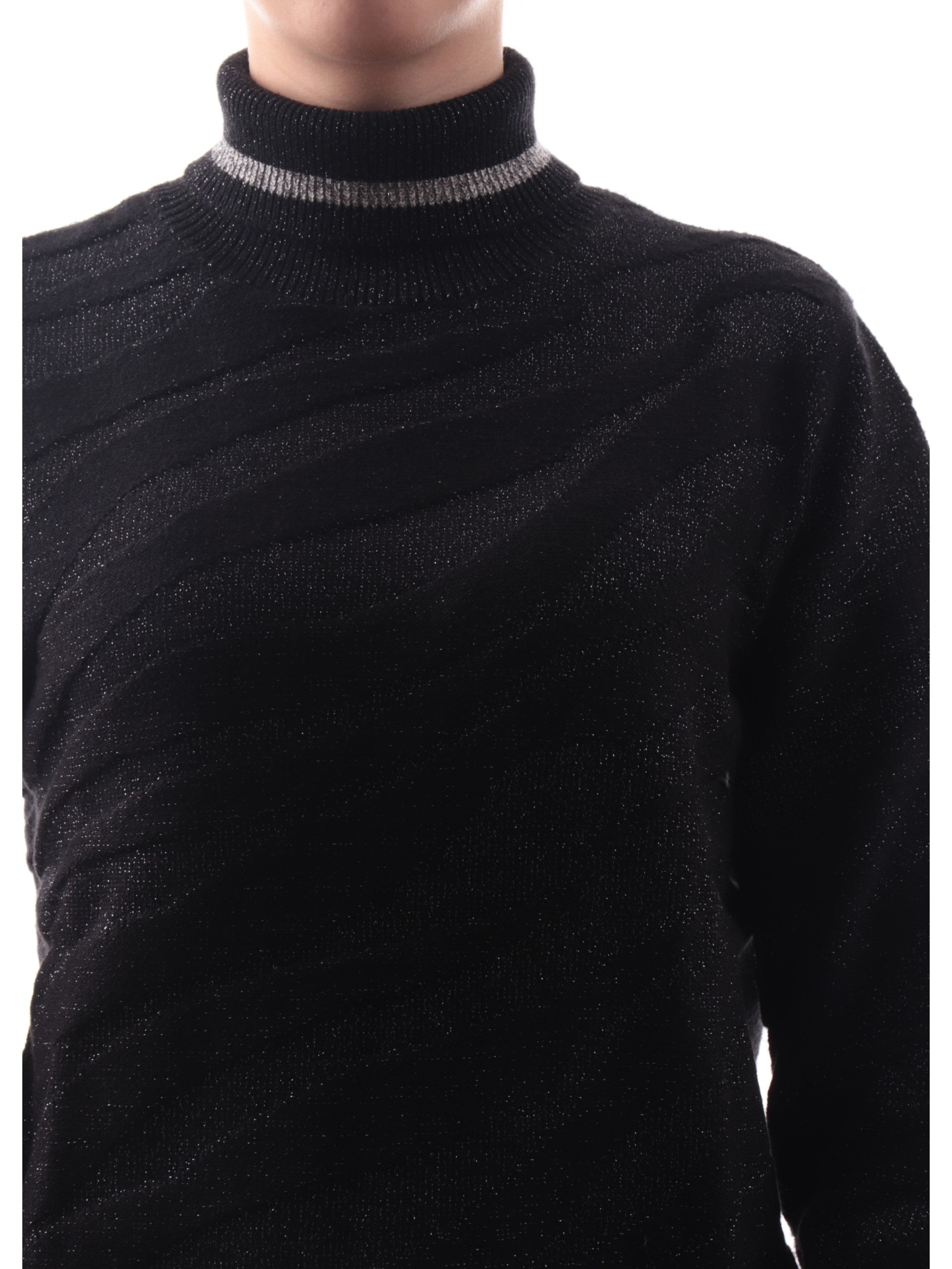 Maglione Dolcevita collo alto nero e oro da donna con trama animalier impreziosita da dettagli lurex. Il bordo inferiore di questa maglia nera donna Yes Zee ed il collo alto sono caratterizzati da bordini lurex oro.