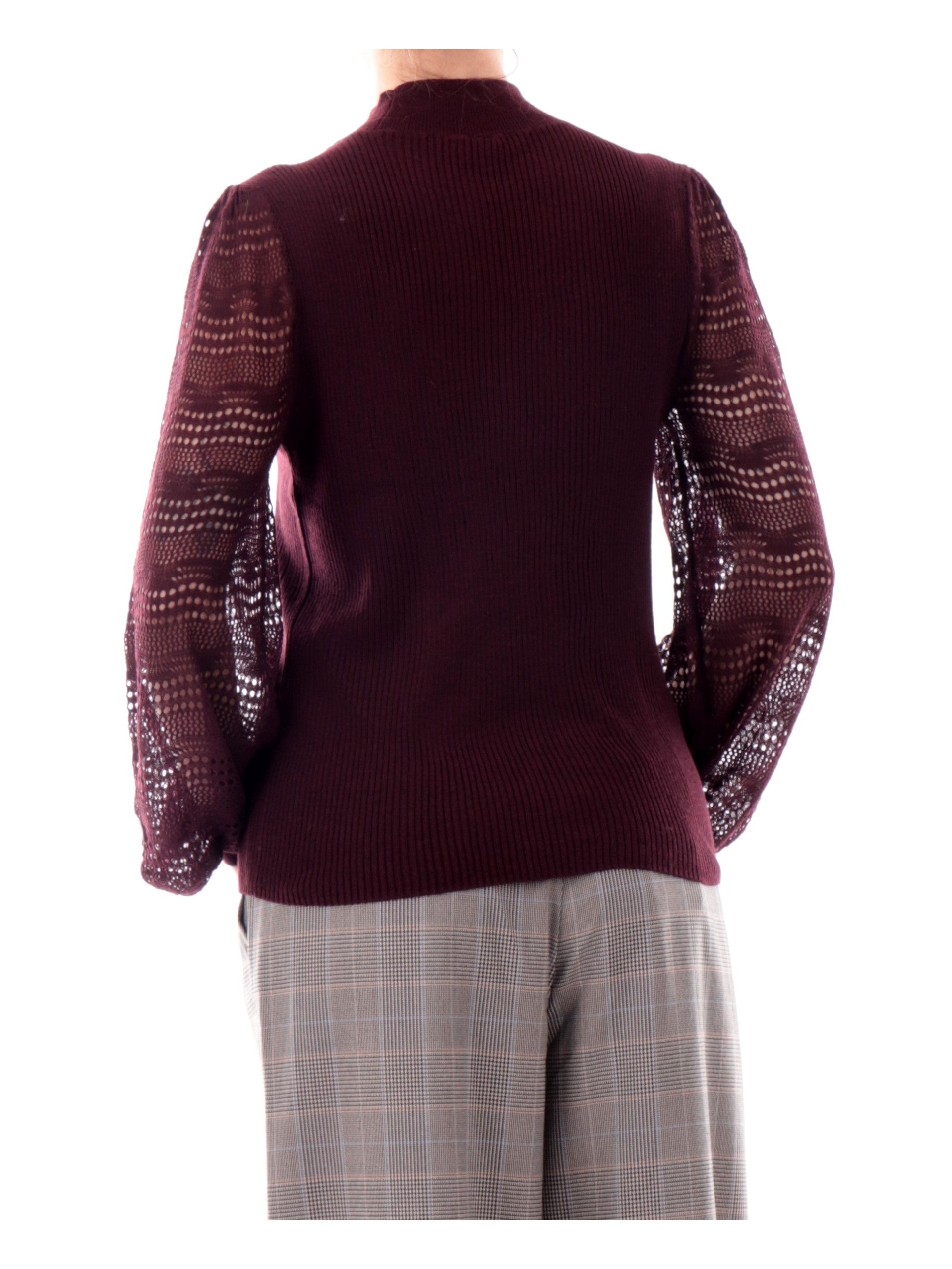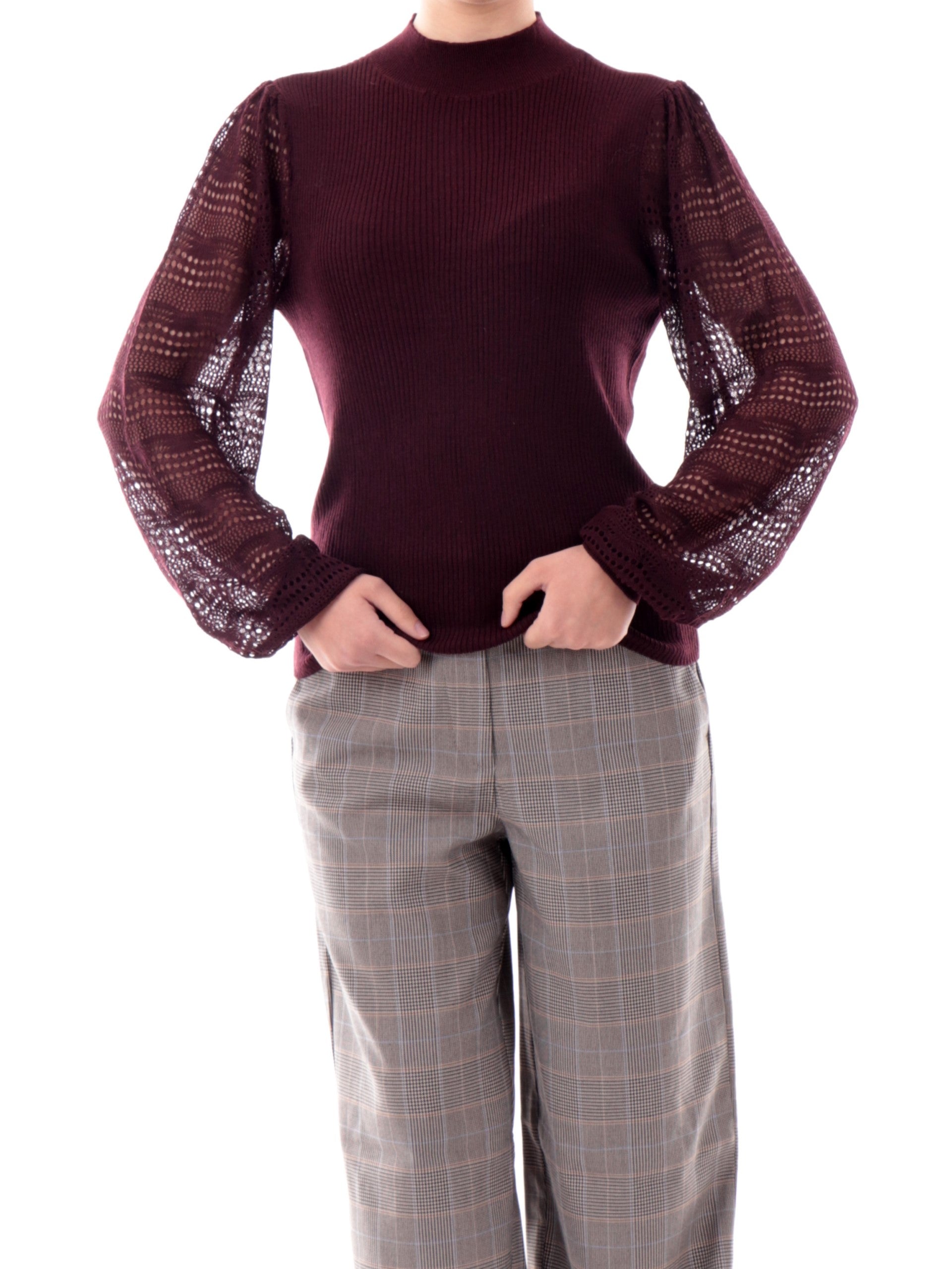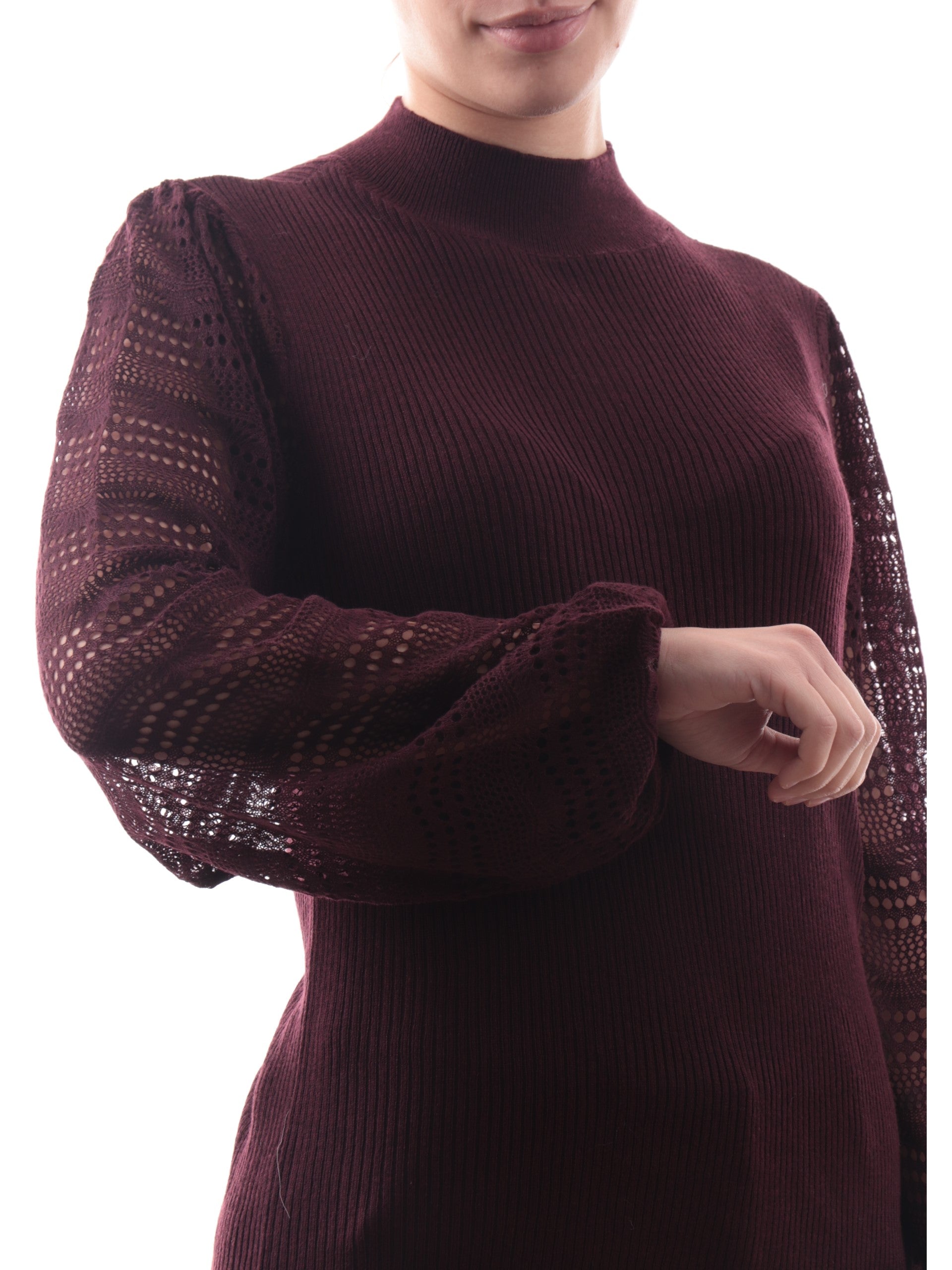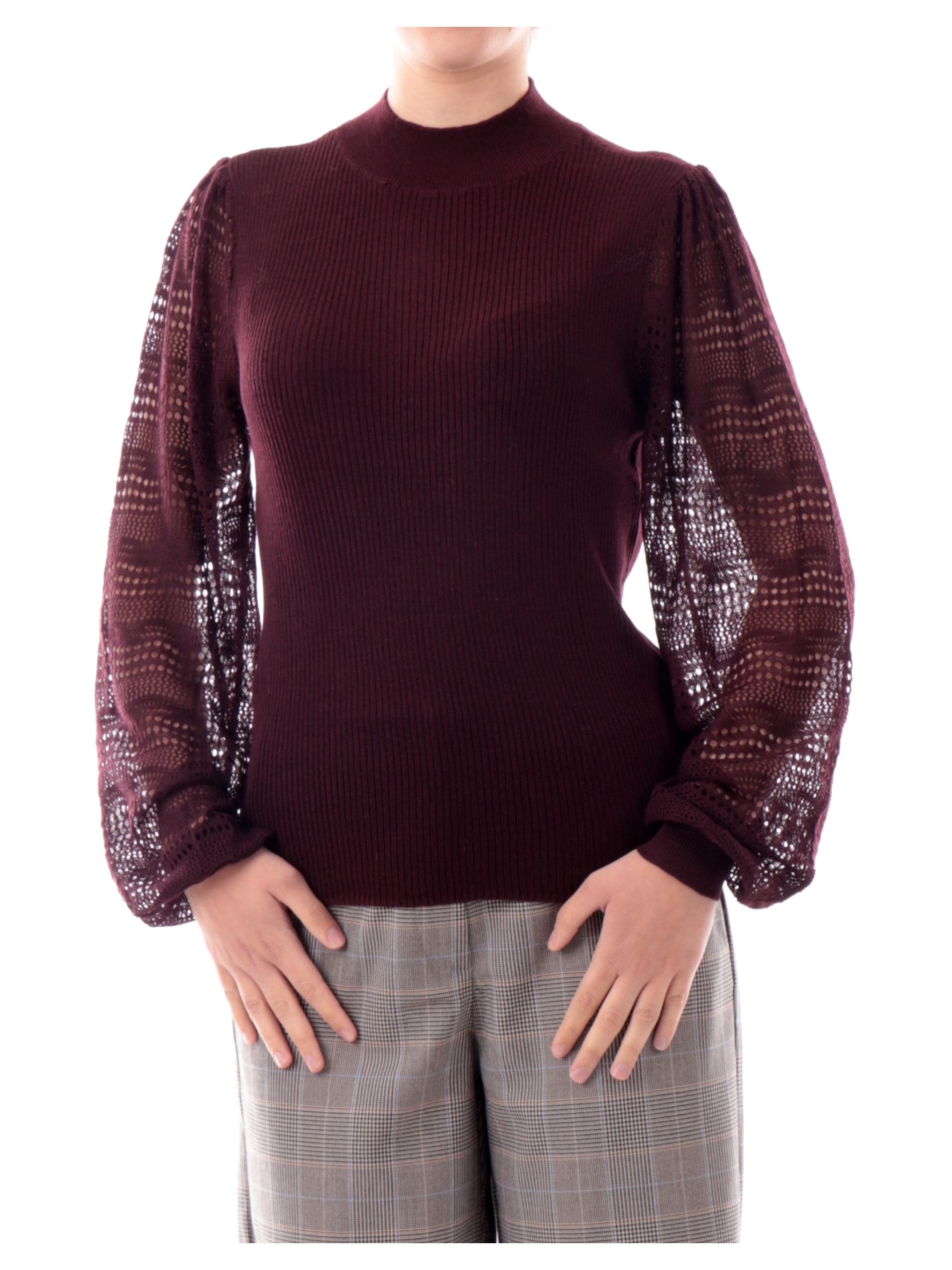 Maglione Only bordeaux da donna girocollo. Questo maglione da donna Only bordeaux è realizzato da un soffice ed avvolgente tessuto a costine. Questa maglia è caratterizzata da un tessuto traforato sulle maniche con polsini elasticizzati e si può abbinarlo come si preferisce