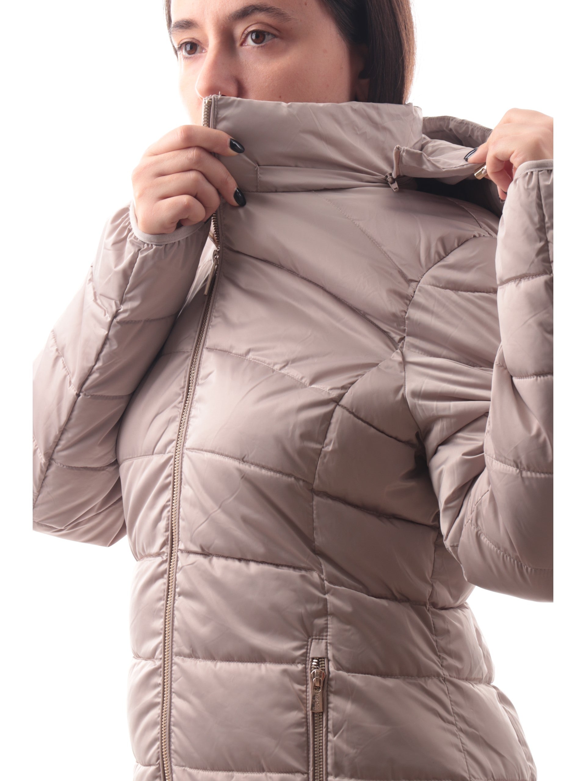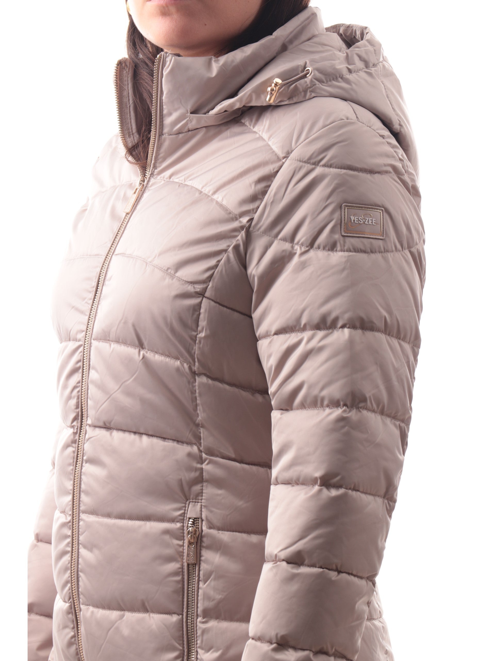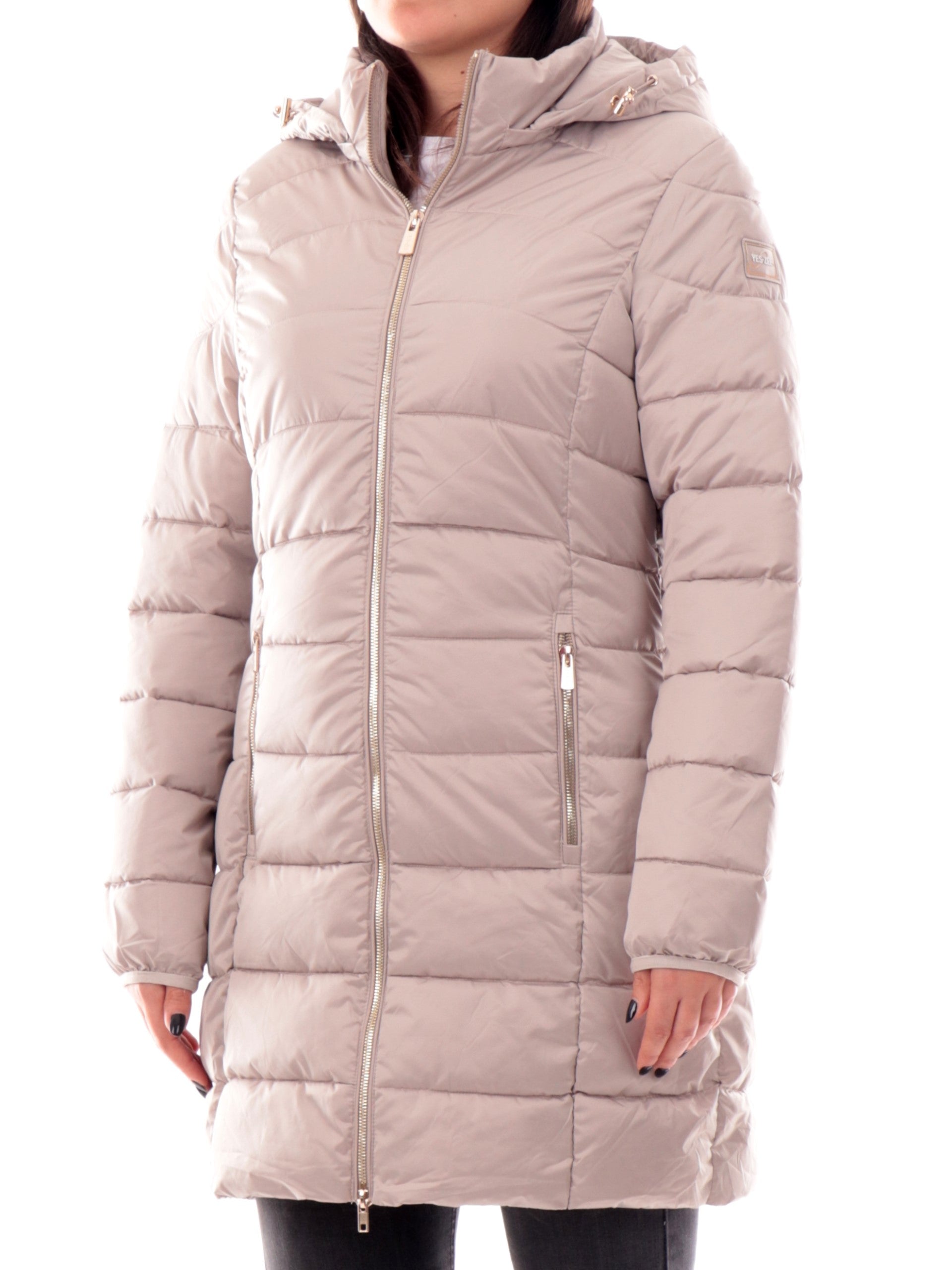Giacca Yes Zee beige lunga da donna dal taglio sagomato, realizzato in tessuto esterno lucido e trapuntato. Questo cappotto trapuntato è dotato di cappuccio removibile e chiusura centrale full zip color oro sia per l'allacciatura che per le tasche laterali. Il logo YES ZEE patch sulla manica caratterizza la raffinatezza del capo.