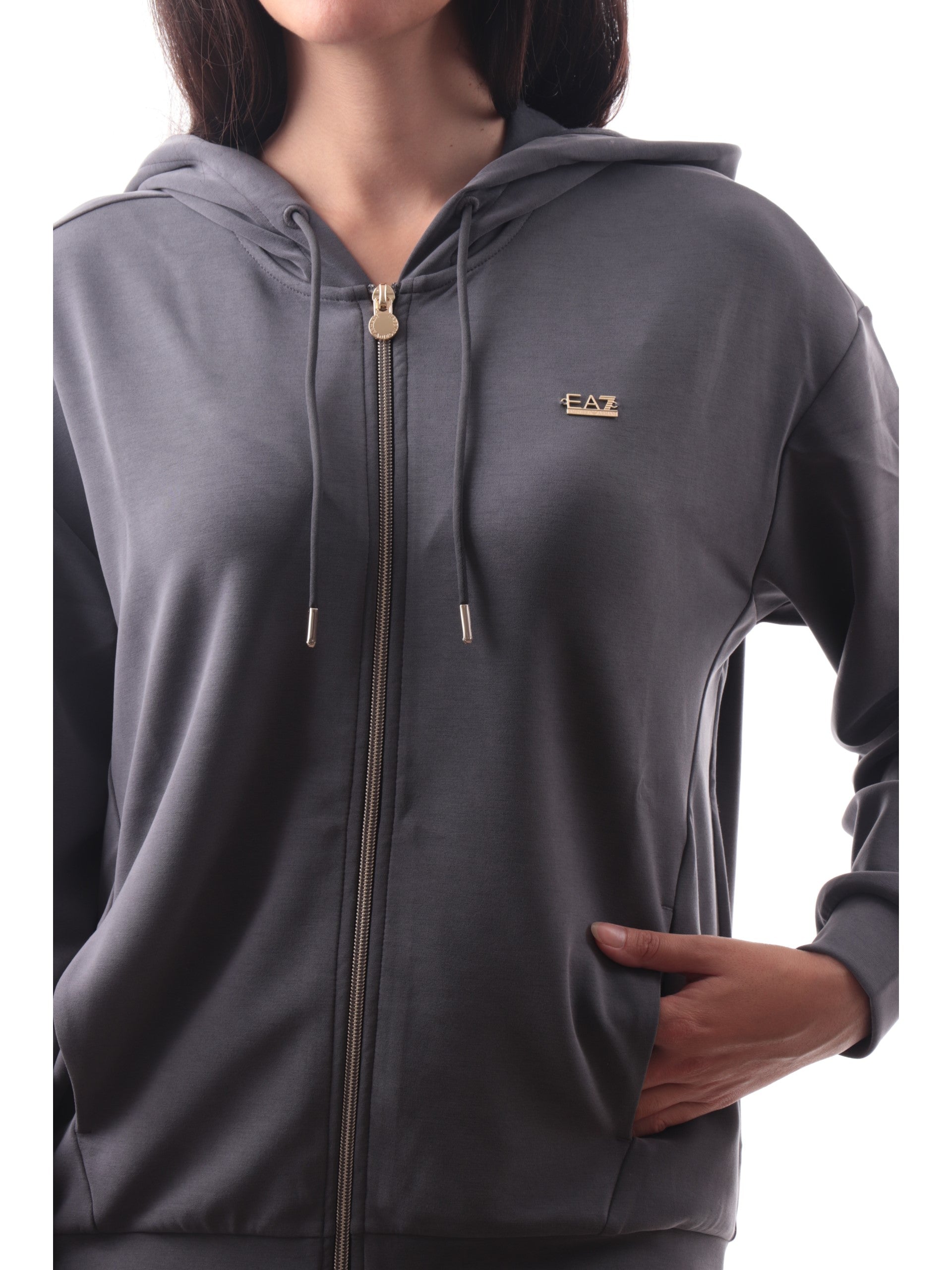 Felpa Emporio Armani EA7 grigia da donna con cappuccio over. Questa felpa over EA7 grigia ha un tessuto morbido al tatto e il cappuccio fisso regolabile con laccetti, la chiusura full zip centrale dorata e il logo a lato cuore dorata