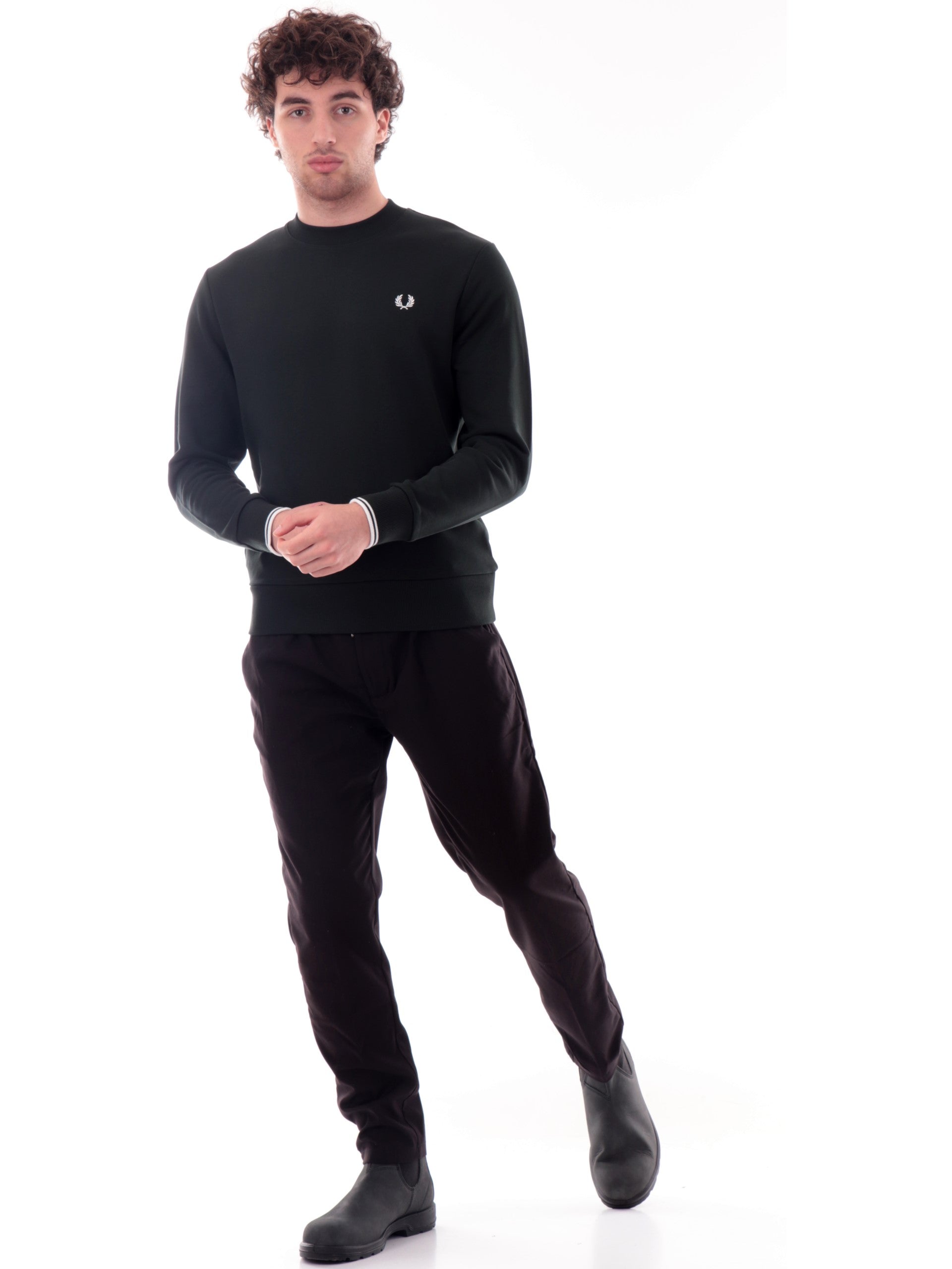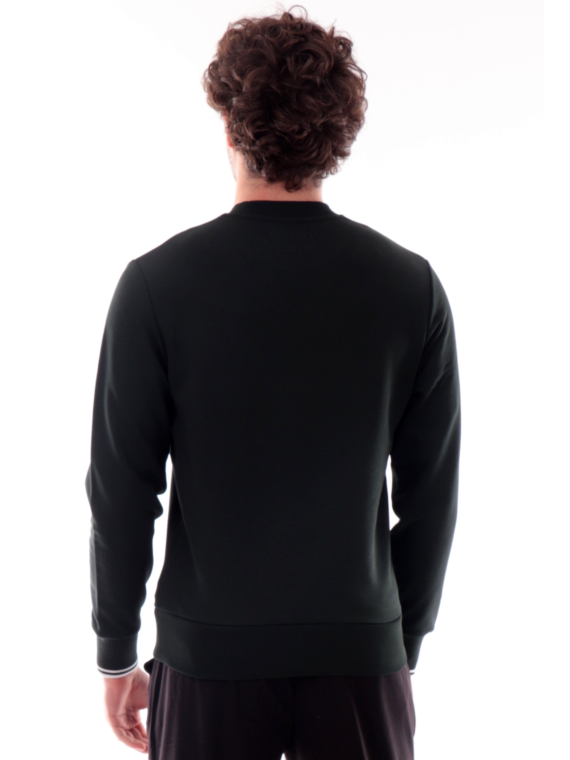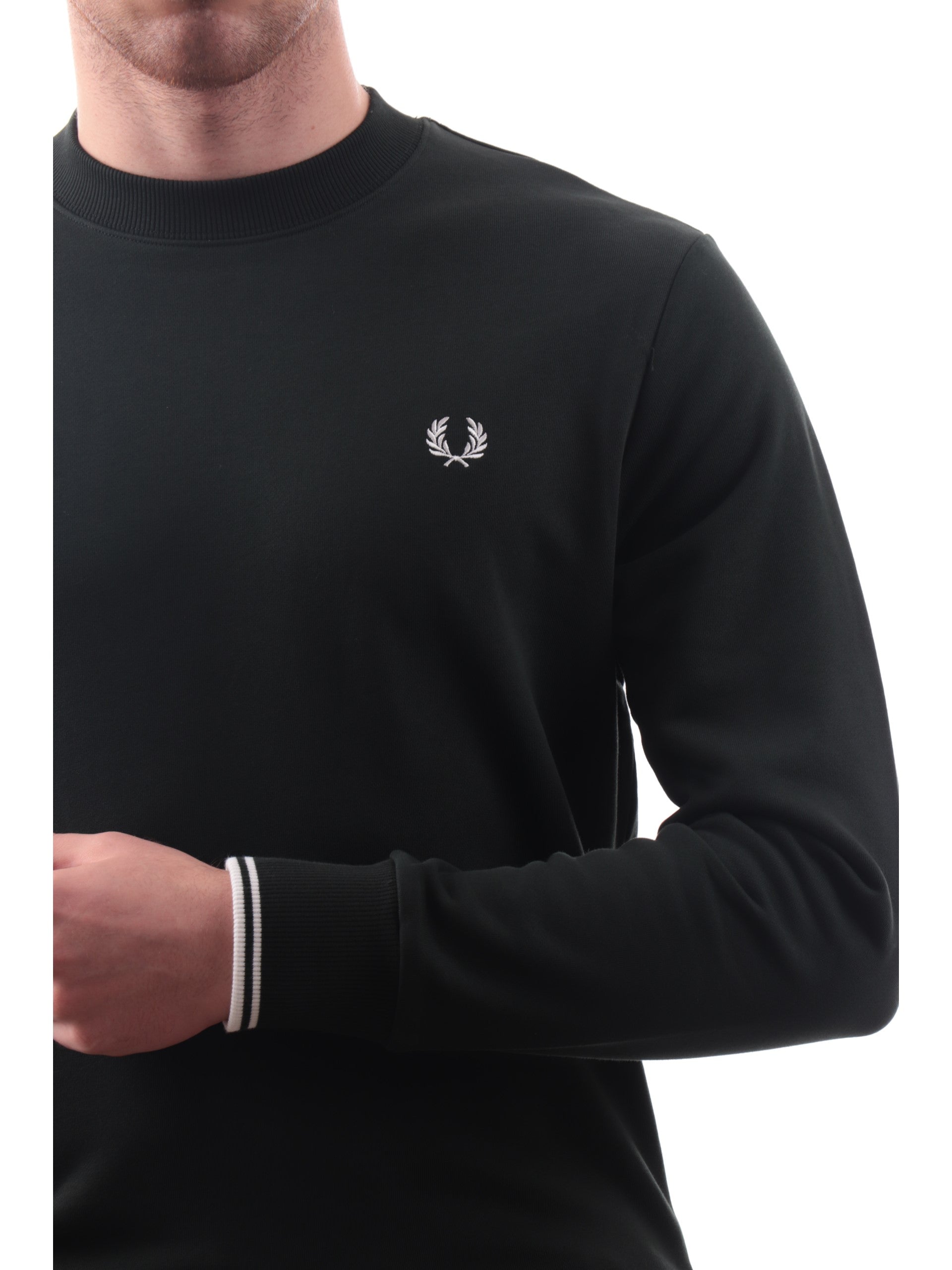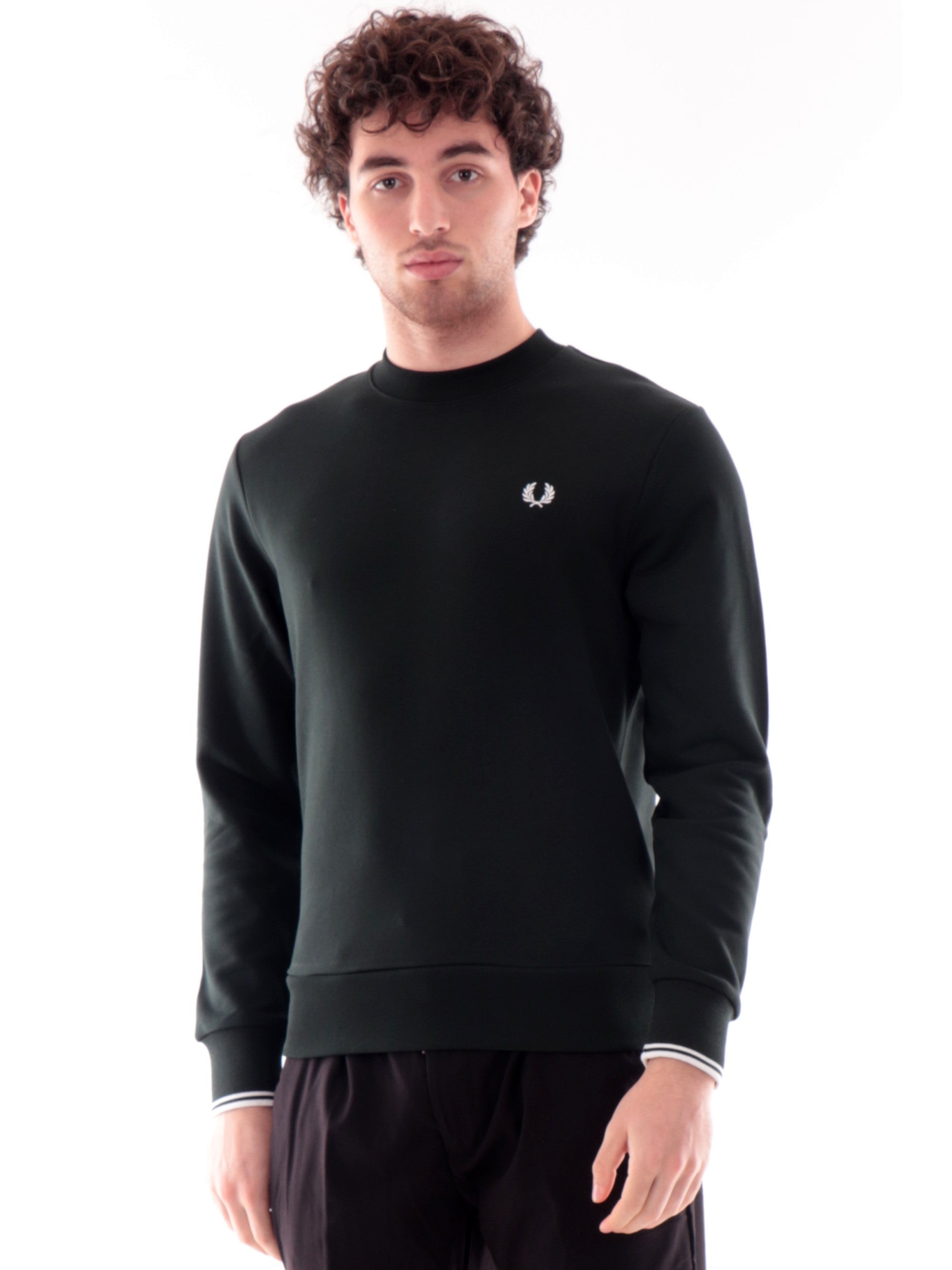Felpa Fred Perry verde da uomo. Questa felpa Fred Perry ha il logo stampato sul cuore, un interno morbido e felpato, polsini e fondo a costine. L'orlo delle maniche è caratterizzato da una doppia striscia bianca, in contrasto con il colore della felpa Fred Perry.