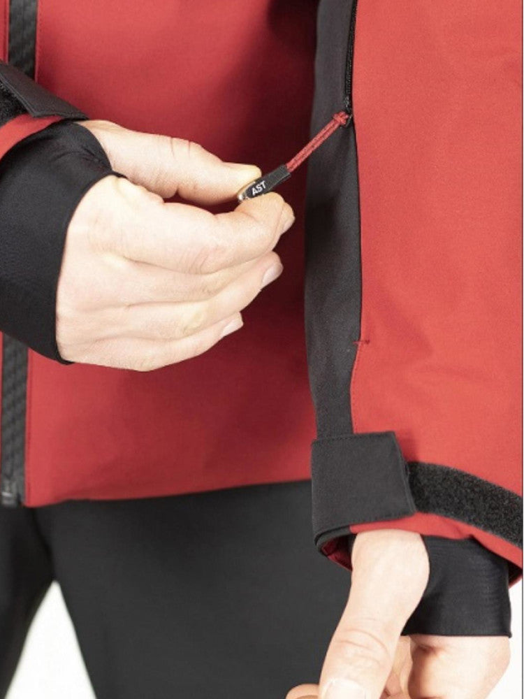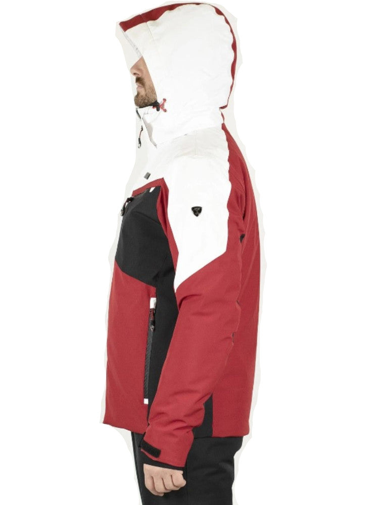 White, red and black Astrolabio ski jacket for men with removable hood with zip. This men's ski jacket is made of water and snow resistant technical fabric. The cuffs are adjustable and have a windproof inner sleeve. Inside there is a snow gaiter while on the sleeve there is a pocket for the ski pass.
