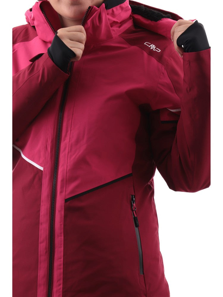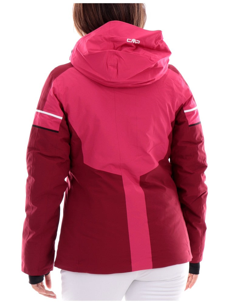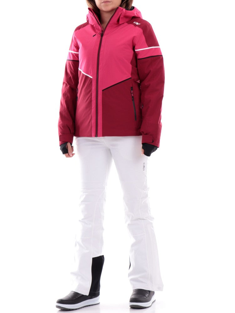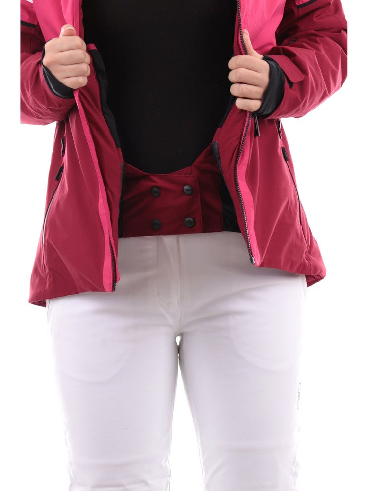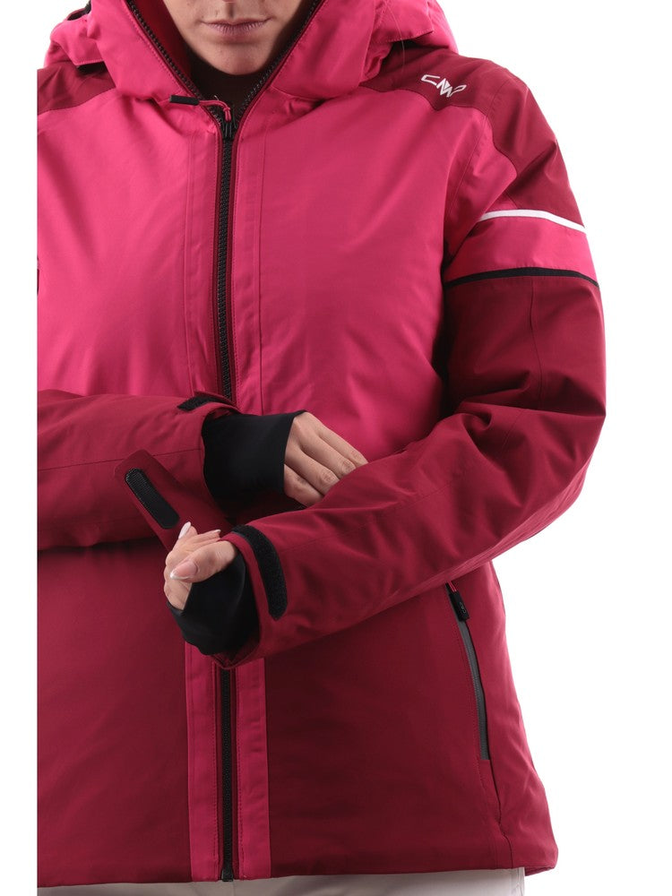 CMP pink and burgundy women's ski jacket made with internal fleece. This CMP snow jacket has an elasticated gaiter to protect you from the wind, a removable hood, a neck warmer, a heat-taped central full zip closure, two side pockets with heat-taped zips, an internal heat-taped pocket to carry your smartphone with you, elasticated cuffs with velcro, adjustable hem with drawstring and a pocket on the left sleeve to carry your ski pass with you.